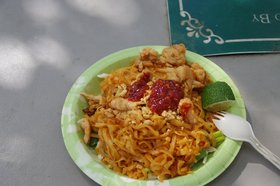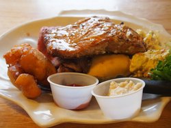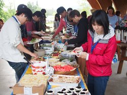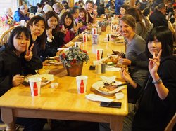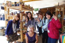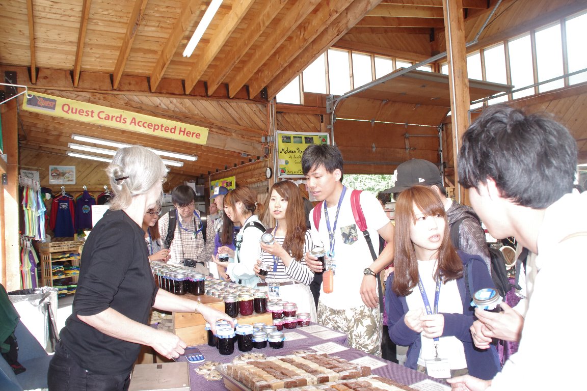 本日は英語の授業終了後からフリータイム。まずは全員で、毎週水、土、日曜に開催されているファーマーズマーケットへでかけました。ファーマーズマーケットでは、地元産の新鮮な野菜のほか、はちみつやジャム、陶磁器など様々なものが販売され、アラスカ産の物が並ぶ点でおみやげ選びに最適な場所です。また軽食の屋台も充実しており、中華やタイ料理には少し懐かしさを覚えます。一昨年のアラスカ滞在時に女子学生の面倒をみていただいたYorikoさんも、手作りの陶芸品の販売をしていました。