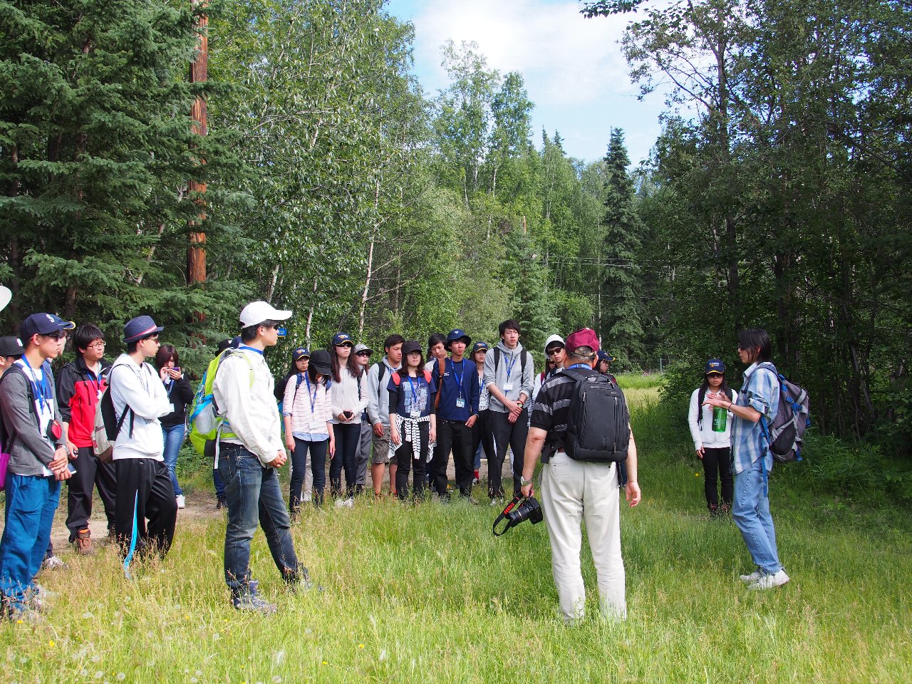午後からは、アラスカに関する専門講義が始まりました。1回目の今日は、Okuno先生による「Natural history of Akaska」、アラスカの気候、地形、動物や植物について学びました。その後Okuno先生と大学構内の森にハイキングへ。寒冷なアラスカでは、日本では高山植物として知られるゴゼンタチバナやイソツツジなどの植物を、平地で見ることができます。また針葉樹と広葉樹の種類と区別の方法や、森林火災を見越して最も高いところに後にしょうじる遷移など、アラスカの森林の基本を実地で学びました。
