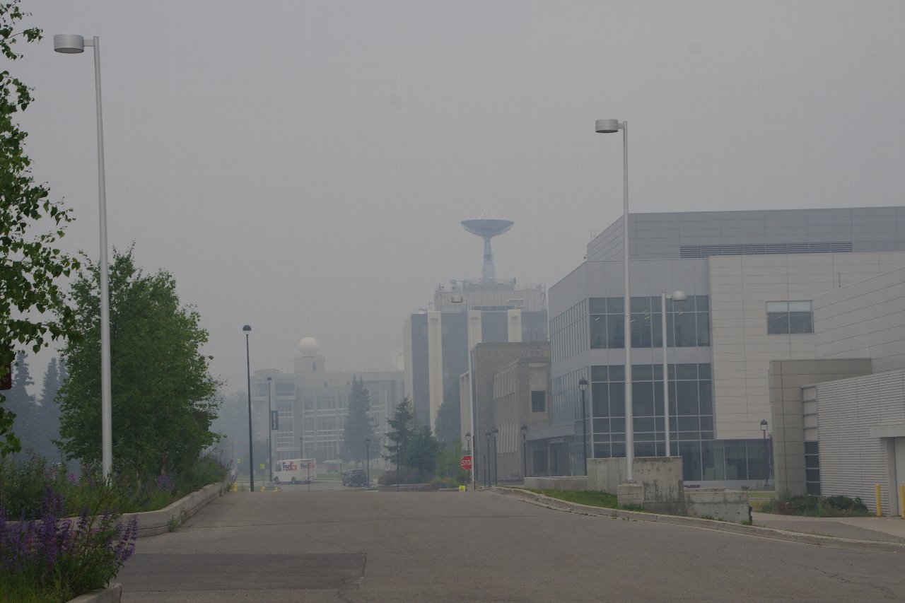 昨日とは違って日が差さない一日、外は視界が悪く、空気はたき火のような匂いで満たされています。夏のアラスカでよく発生する、原野火災の煙です。この煙で、今日の予定は大きく変更になりました。