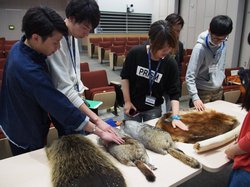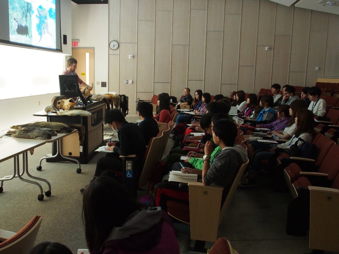 講義では、付属博物館のアレン先生から、アラスカの哺乳類についてのレクチャーを受けました。グリズリーやムース、カリブーなど聞いたことがある動物だけでなく、オオカミやコヨーテ、リンクス(ヤマネコ)やマーモットなど、日本では知られていない動物の生態を、ビデオや骨格標本、毛皮を使って説明してくださいました。最後に標本を触る時間が設けられ、種類によって毛の手触りや構造が違うことを確かめました。