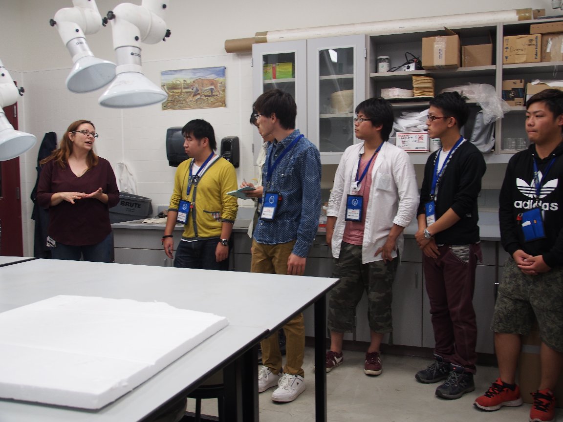 講義の後に見学したアラスカ大学付属博物館(Museum of North)には、学んだばかりの先住民族に関する展示のほか、マンモスなどの化石やアラスカの自然に関する展示が詰まっています。特別に研究室や標本調整室、標本庫を見学させていただきました。この博物館は展示だけではなく、アラスカに関する様々な資料を集め、整理して研究に供する重要な役割を担っています。見学の最後には、骨格標本やはく製などを触ることができました。アラスカの自然や先住民の文化を丁寧に記録し、残していくことが大学博物館の役割なのだと学んだ一日でした。(S)