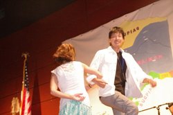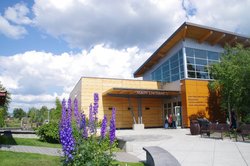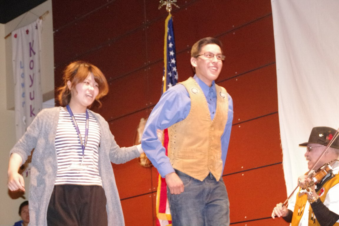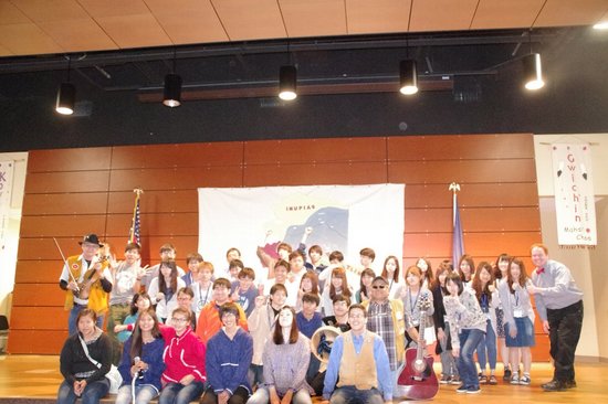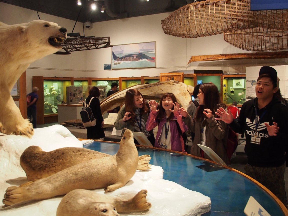 午後はそのままダウンタウンに残り、モリス・トンプソンビジターセンターを見学しました。ここでは名古屋に留学経験があり、日本語の話せる職員のエドさんから様々な説明を受けました。このセンターでは見学のほか、アラスカ先住民族によるダンスショーに参加しました。アサバスカンインディアンやイヌピアックエスキモーのダンスのほか、西洋人との接触の後に生まれた新しいダンスも披露され、学生たちもその中に入り、ダンスに挑戦しました。
