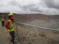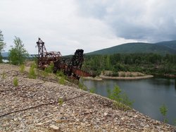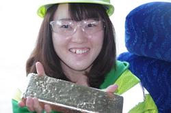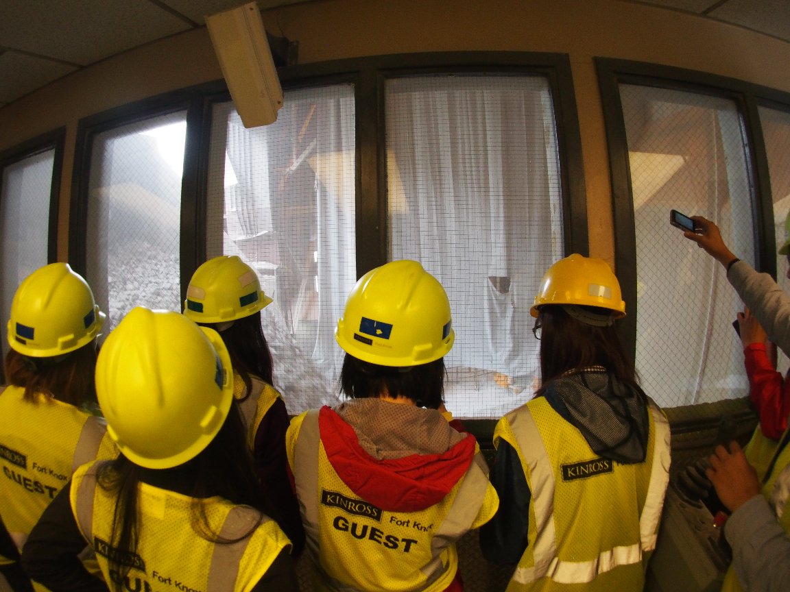午後はアラスカ最大の金鉱山であるFort Nox鉱山の見学。その前に少し時間があったので、Chatanikaにある昔の金採掘の痕を見に行きました。大規模なドレッジ(浚渫船)が、掘り下げた後に残る人造湖の上に浮かんで残されており、その周囲はズリ山に囲まれています。1928-1958年に操業していた金採掘の名残で、大規模な機械に圧倒されます。現在の金の採掘対象は、砂利の堆積した地層から岩盤へと変わり、巨大な露天掘りによって進められています。フォートノックス金鉱山はそのひとつで、巨大なダンプカーがアリに見えるほど広大な敷地で運営されています。見学では、露天掘りの様子と採掘した鉱石を粉砕する、コーヒーミルのお化けのような施設を見学しました。最後に金の延べ棒をひとりづつ持たせてもらいました。
