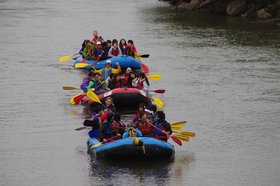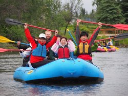 講義の後はバスに乗って、フェアバンクス市内を流れるチェナ川へ移動。ここから大きなゴムボートに乗り、自分で漕いで川を下るラフティングツアーに参加しました。ほとんどの学生は川下りが初めての経験ですが、パドルを操作して舟を前進させつつ、川からの景色を楽しみました。ゴールの先に待っているのはアラスカ名物料理のサーモン・ベイク。程よく運動して減ったお腹を、たっぷりのサーモンやプライムリブなどアラスカらしい豪快な料理で満たすことができました。