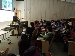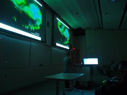 今日の午後は、アラスカ大学名誉教授でオーロラ研究の権威である赤祖父俊一先生による、オーロラの講義を受講しました。一日中明るい今は見ることができませんが、アラスカでは秋以降の夜にオーロラが出現します。なぜオーロラが出現するのか、それは太陽から届く粒子(太陽風)が地球の極地付近に収束する磁場に沿って移動し、大気中の粒子とぶつかる時に発光するからです。高エネルギーの粒子がぶつかって光る現象は、ちょうど昔のテレビに使われたブラウン管と同じ原理です。赤祖父先生は、オーロラの仕組みをわかりやすく、また非常に美しい写真やビデオを含めて紹介してくださいました。久しぶり?の日本語の授業であったためか、いつもにも増して質問が多くでていました。