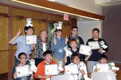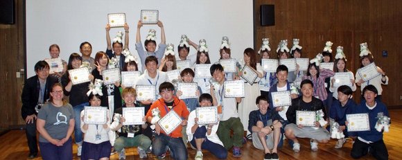 試験が終わるとそのまま自由時間となりました。最終日のため、おみやげを買ったり荷物をまとめたり。夕方6時から、修了ディナーが始まりました。ピアノの生演奏のなか、スクリーンには2週間の思い出の写真が次々にめくられていきます。授業や野外巡検でお世話になったアラスカの方々と同席し、和やかな夕食となりました。途中、全員が一言ずつ、アラスカへの思いを短くスピーチ。その後、一人一人が感謝の言葉を述べました。 修了証を手にして思わず涙ぐんでしまう人もいましたが、それは達成感と主催者への感謝の気持ちからでしょうか。 最後は修了証とハスキー犬のぬいぐるみを手に記念写真を撮合いながら、名残を惜しんでいました。(F,S)