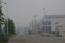 講義の後に予定されていた大型動物実験施設の見学は、原野火災(WildFire)の煙で中止になりました。この火災はどのような状況になっているのでしょうか。広大なアラスカには、針葉樹の大森林地帯が広がっています。寒さに耐えるため油を含む針葉樹は燃えやすく、雷で簡単に着火します。また、火災の多かった2005年から10年間が経過し、燃料となる葉や枝なども溜まっていたようです。火災は気温が高く乾燥した年ほど増える傾向にあり、今年はその条件にぴったりはまった夏になりました。