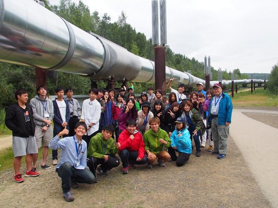 最後に、アラスカの石油パイプラインを見学しました。北極海沿岸で発見された油田の町プルドーベイから太平洋の不凍港バルディーズまで、全長約1,300kmを結ぶパイプラインで、極北の永久凍土帯を通すための様々な工夫が凝らされています。例えばパイプラインを支える土台部分には、冷たさを効率よく伝えるヒートパイプが埋設され、永久凍土層が融けないようになっています。またパイプはジグザグに配置され、パイプの熱膨張や、地震による変形を受け止めるように工夫されています。