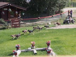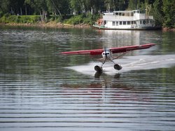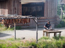 vボートといっても、数百名が乗船できる開拓時代の外輪船を模した船です。沿岸にある建物や犬ぞりレーサーの訓練の様子、水上飛行機の離水するデモンストレーションなどを紹介しながら走り、アサバスカンインディアンの集落を再現した場所まで往復するツアーになっています。集落では全員が一度下船して、アサバスカンの伝統的な毛皮の使い方や生活、シャケ漁についての説明を受けました。勉強になる内容ですが、ジョークも交えながら楽しく説明してくれます。