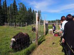 いよいよ滞在はあと2日、お昼から、アラスカを知る最後の巡検先であるチナ温泉へ向かいました。その前にバスはまず、UAFの大型野生動物研究センターへ。本来は7月7日に訪問する予定でしたが、森林火災の煙が濃いため外での活動を中止し、今日に変更した訪問先です。ここでは、ジャコウウシとカリブーを飼育し、繁殖方法などの研究を進めています。解説によると、ジャコウウシは、ロシアがアラスカへ入植した時代(19世紀後半)に毛皮のため乱獲にあい、アラスカから姿を消していましたが、グリーンランドから約30頭の個体が写され、今ではスワード半島を中心に100頭以上が生息しているとのことです。始めてみるジャコウウシの子どもの姿に学生から歓声が上がっていました。