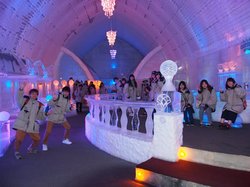 バスはフェアバンクスから約50マイル(約80km)先のチェナ温泉へ向かいます。チェナ温泉はリゾート地として知られ、オーロラを見に来る日本人観光客にも人気があります。日本人のガイドさんによる日本語の案内を受け、温泉へ。温泉といってもこちらでは水着着用のプールのような施設ですが、誰も泳ぐ人はおらず、日本と同様にリラックスした様子でした。抜けるような青空のもと入る温泉は、きっと思い出に残ったことと思います。併設のアイスミュージアムでは、-5℃の室温に保たれた館内に、氷彫刻の世界チャンピオンが制作する様々な氷の造形が保存されています。どうしても昇華蒸発するので、メンテナンスが大変だとのことです。