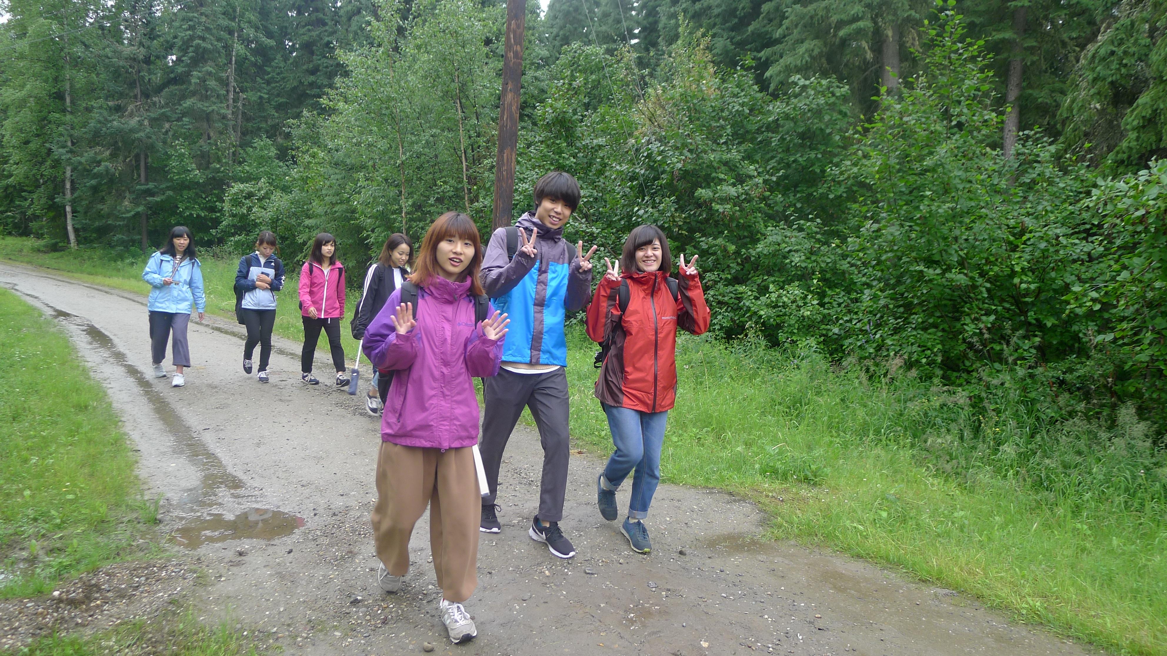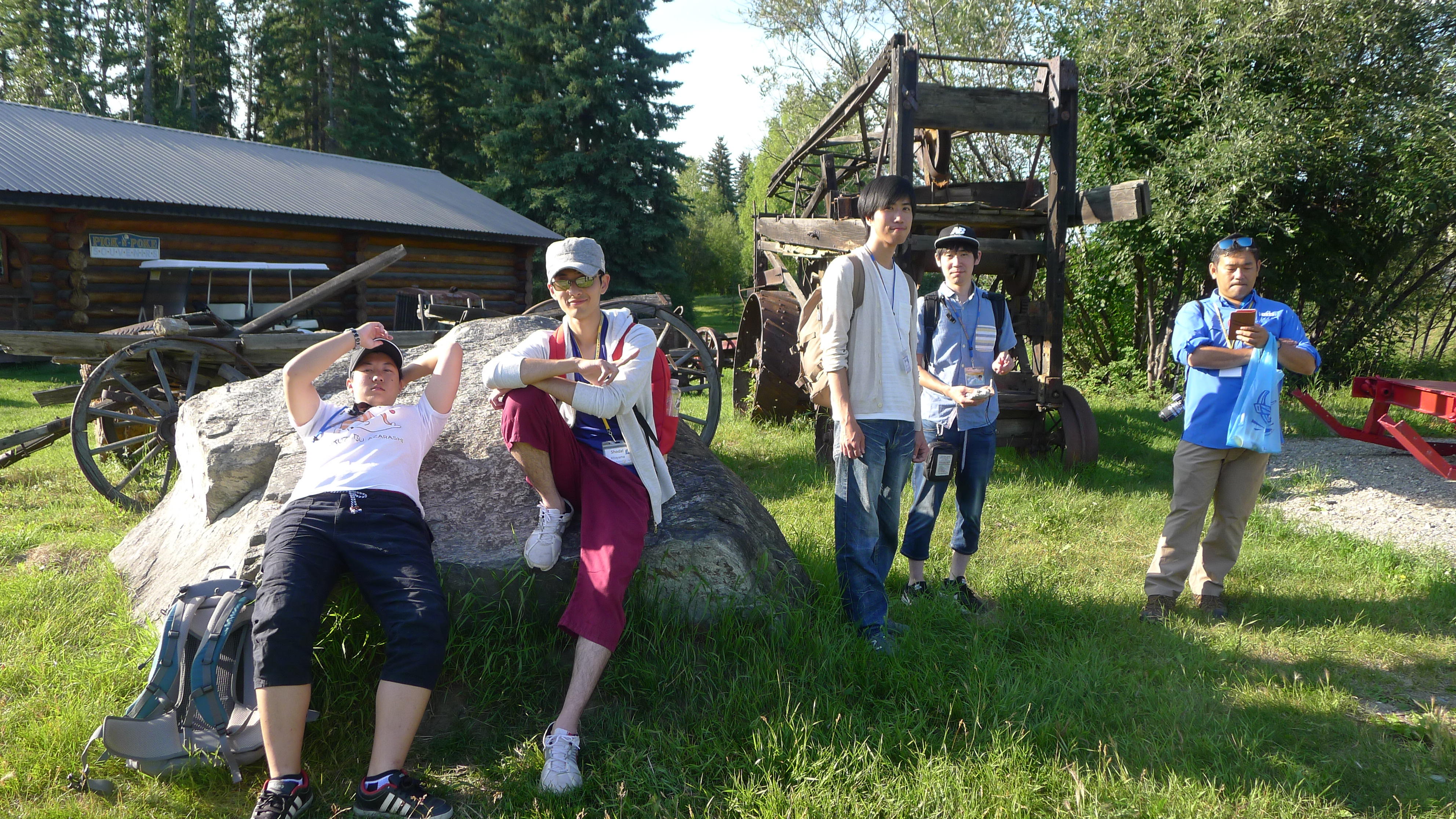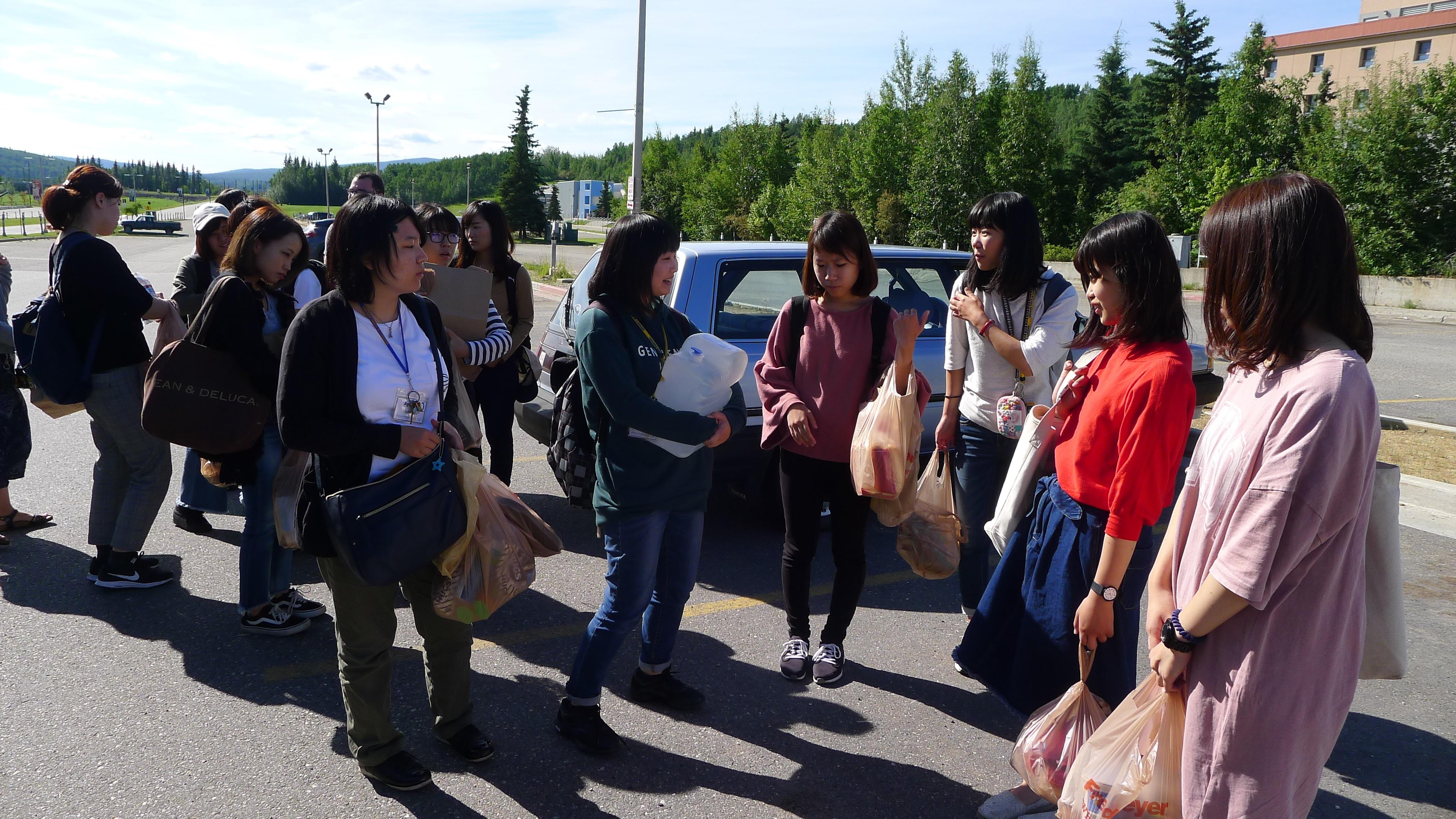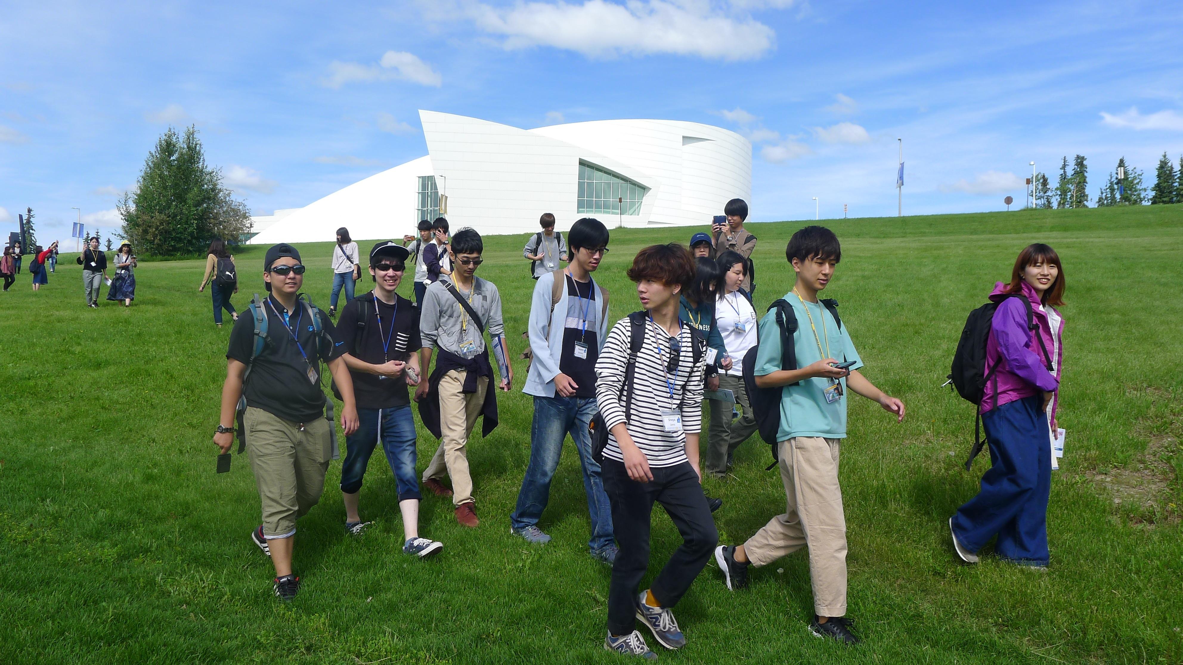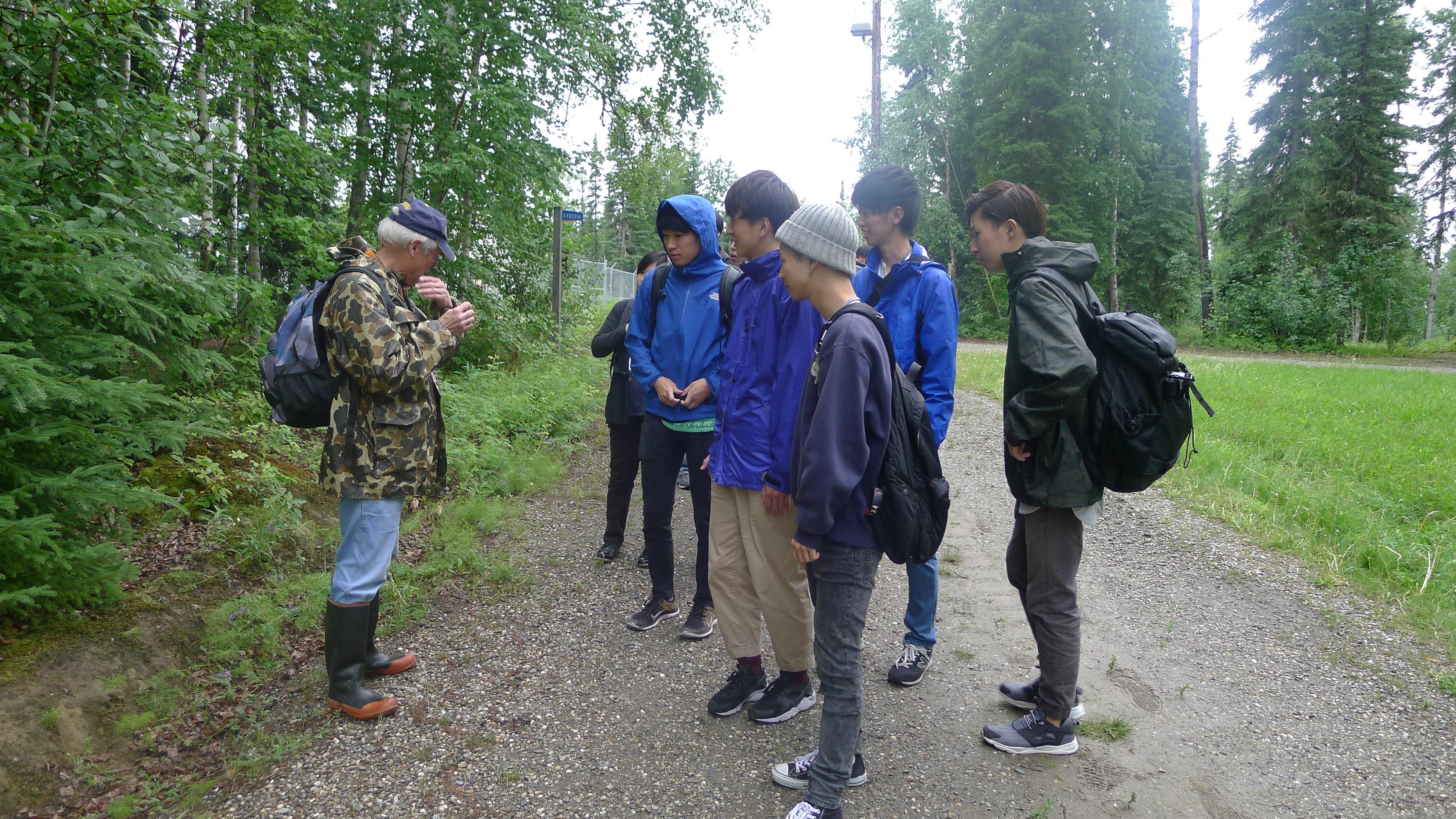 その後、Joe先生の案内でアラスカ大学の構内をぐるりと見学。大学構内の建物にまつわるアラスカの歴史や大学設立の経緯など、面白い話に学生たちも聞き入っています。アラスカ大学は広大で豊かな自然の中にあり、ハイキングをしているような気分を満喫できました。
