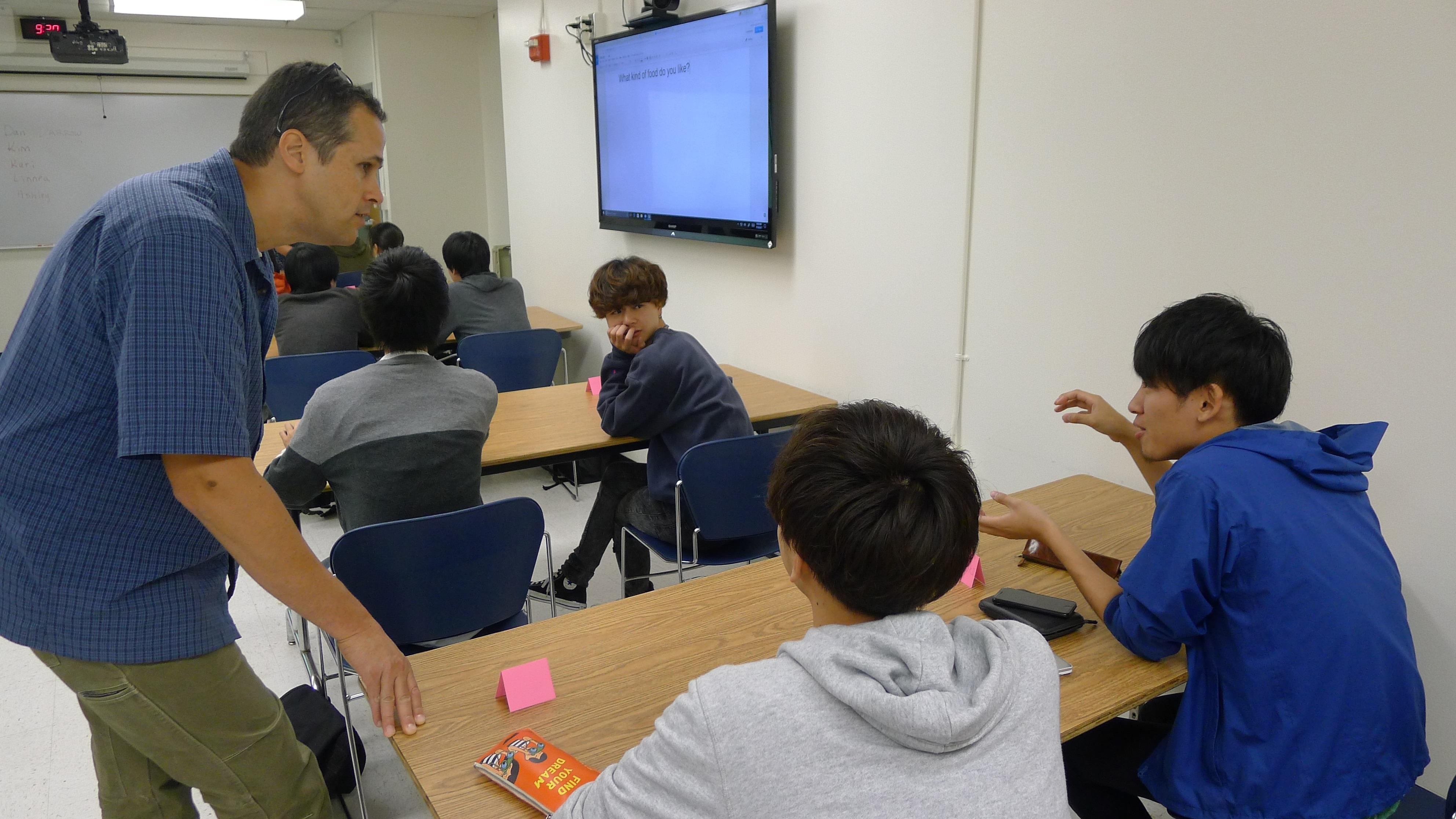 午前中はいつものように英会話の授業。前日のアクティビティの復習をしたり、英会話でよく使われる表現を練習したりしながら、学生たちの気持ちを授業モードに切り替えていきます。
