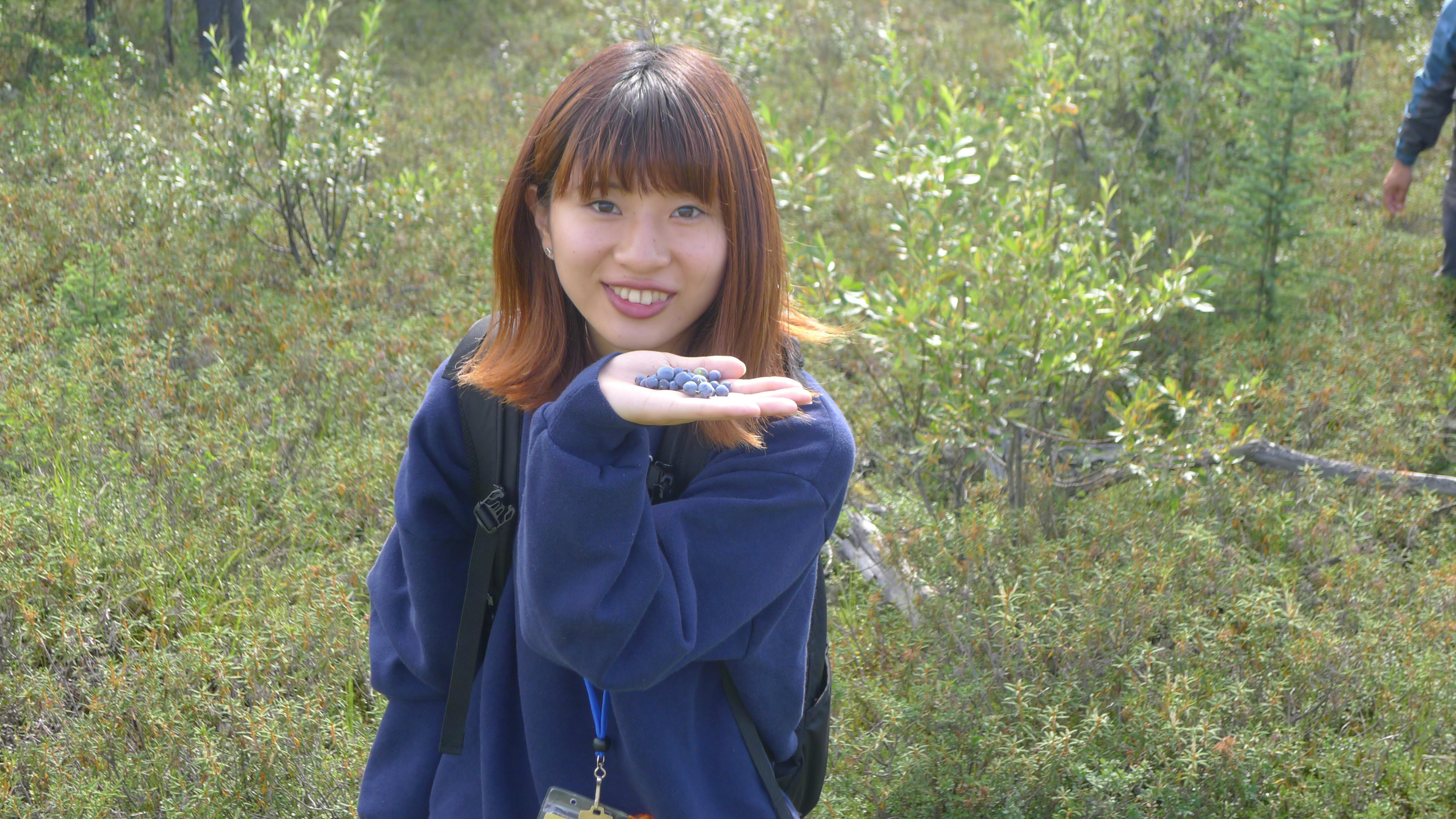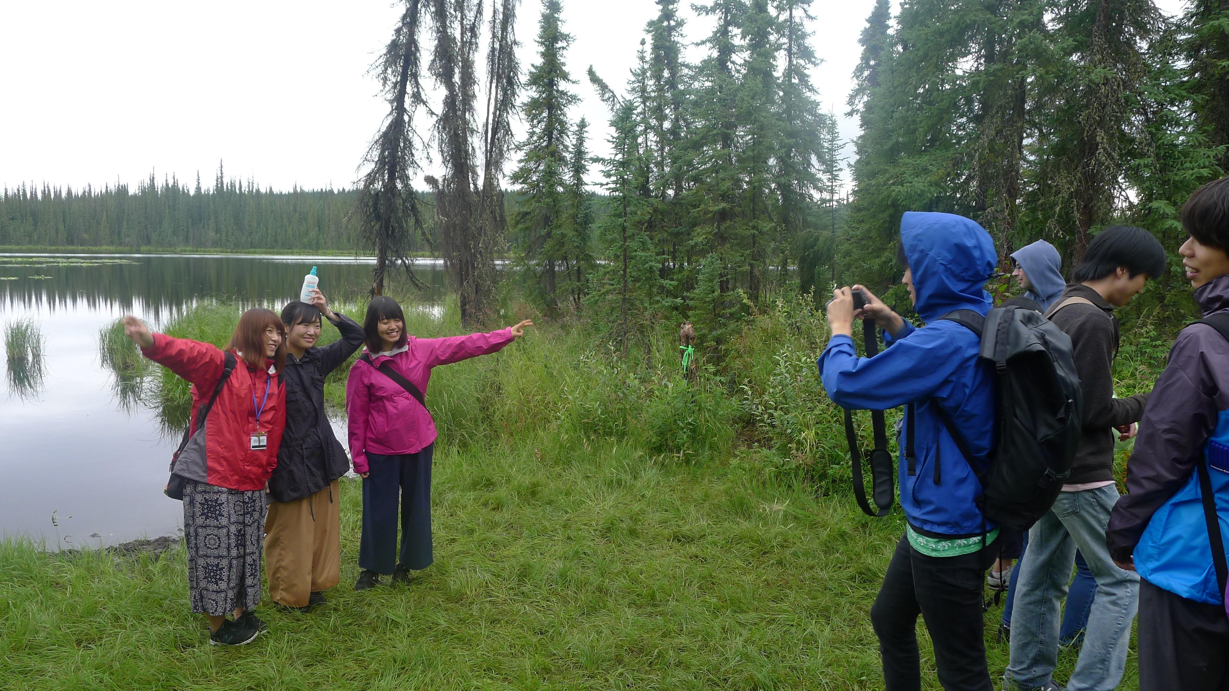 講義が始まる頃まで降っていた雨もあがり、少しひんやりとした空気の中、大学構内の森林地帯に入り、湖畔までの道のりを往復しました。途中、Smith先生から、アラスカでよくみられる草木や地形について解説していただきました。針葉樹であるWhite spruceとBlack spruceの葉を味比べしたり、ice wedgeの地形を観察してみたりするなど、アラスカの自然を満喫しました。(M)