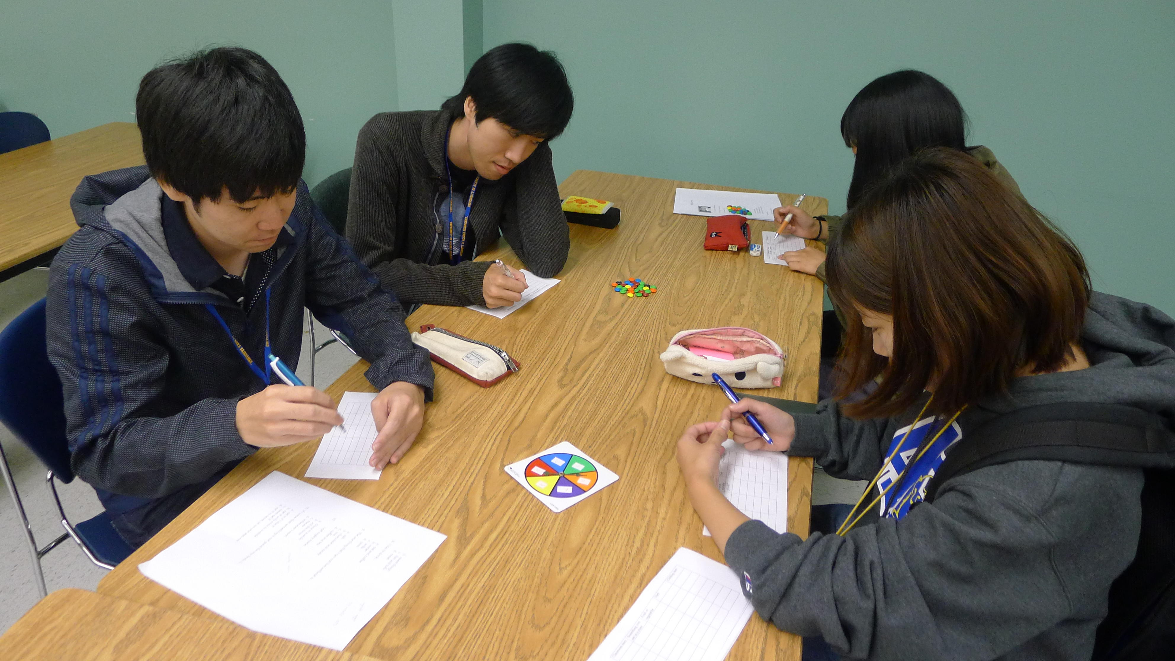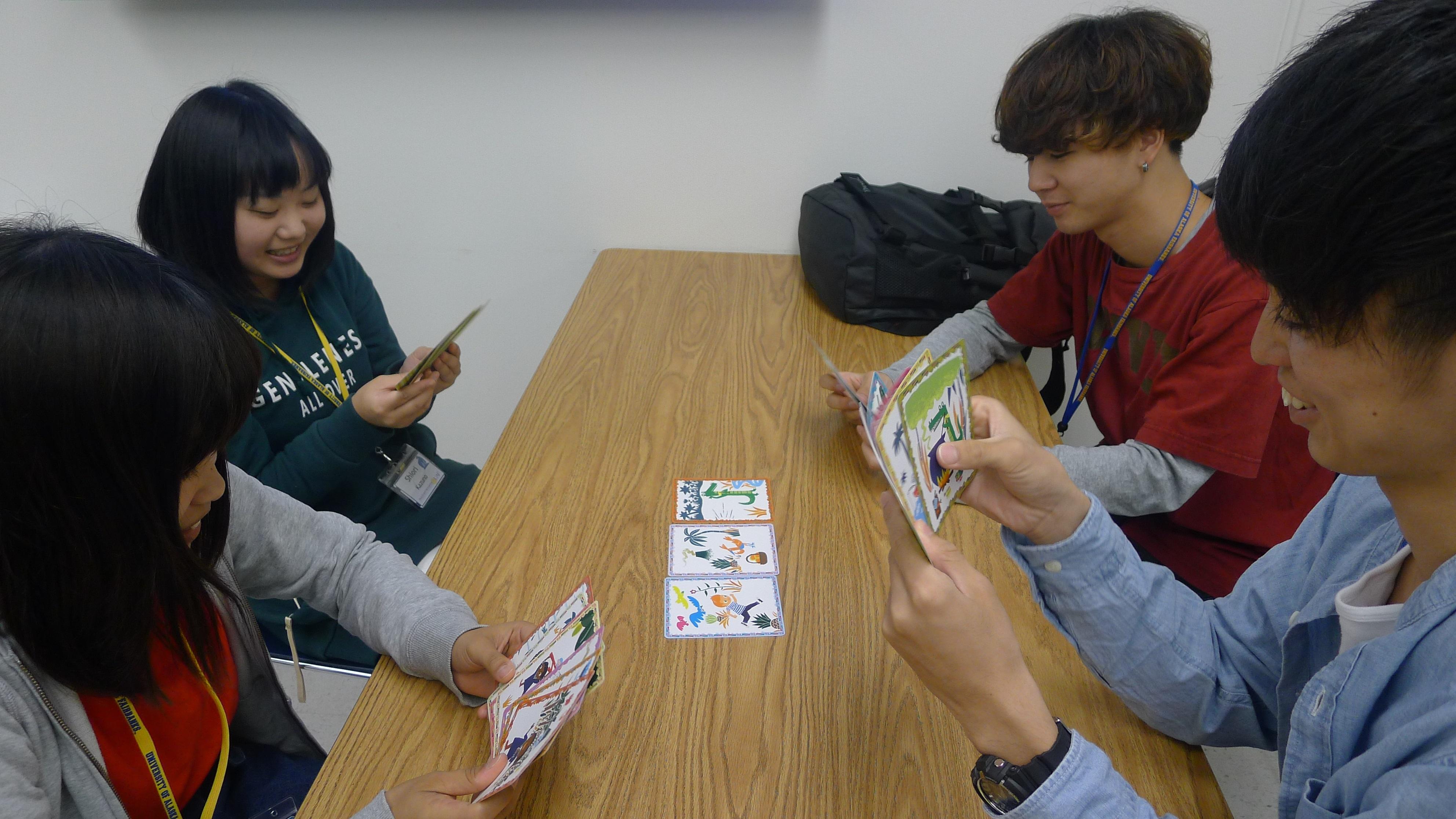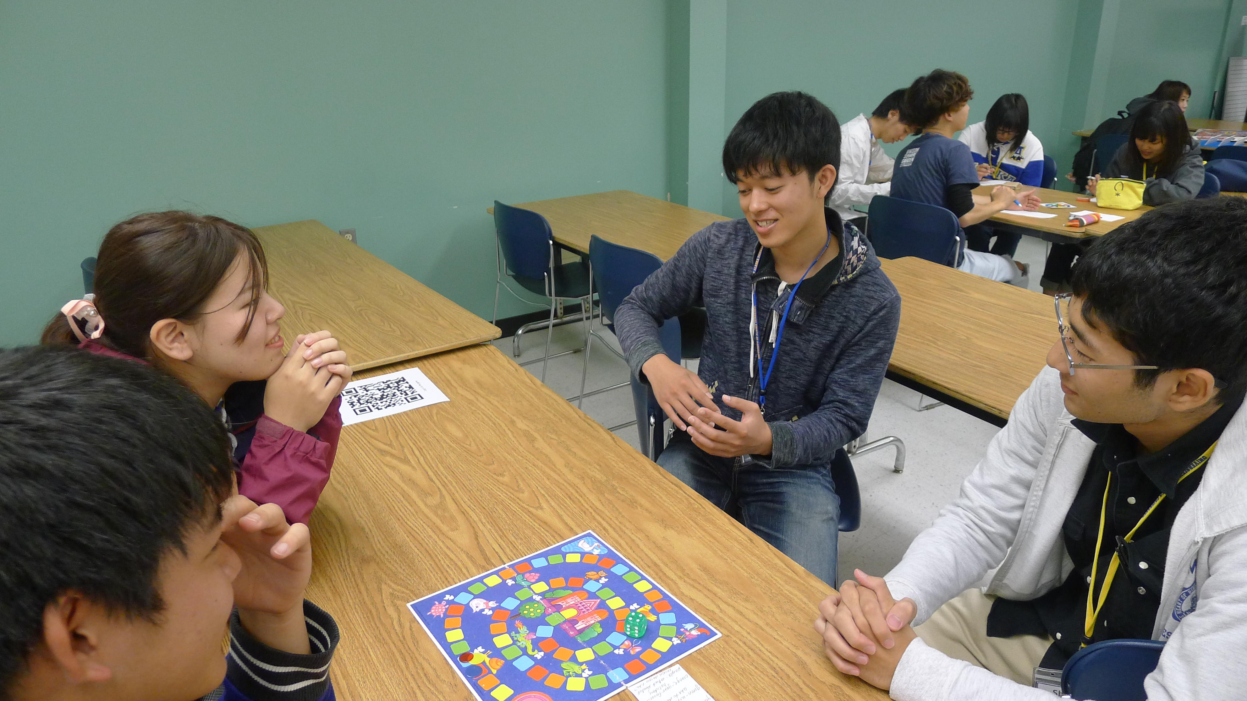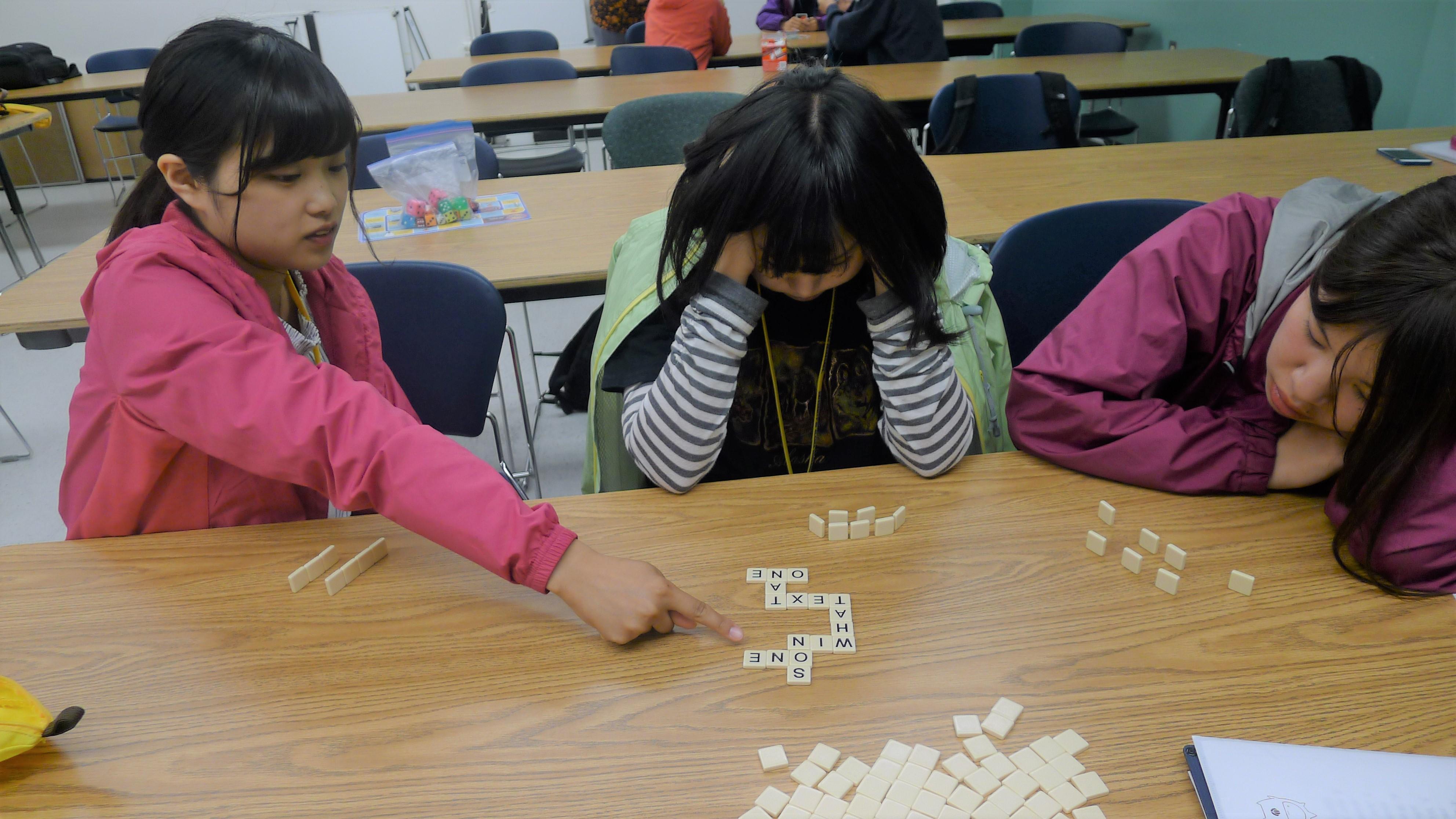 午前中は英会話の授業。まず、午後の講義に関連する英単語とその意味を確認しました。その後、アメリカで人気の遊びにチャレンジ。「Who am I」(人物の特徴に関する質問をしながら、相手が選んだ人物を当てる遊び)、「Once Upon a Time」(絵の描いたカードを一枚ずつ出していき、物語りを作り上げていく遊び)、「Scrabble」(アルファベットのピースを縦横に並べて、英単語を作る遊び)など、英語や英会話スキルを駆使して、楽しみながら取り組みました。