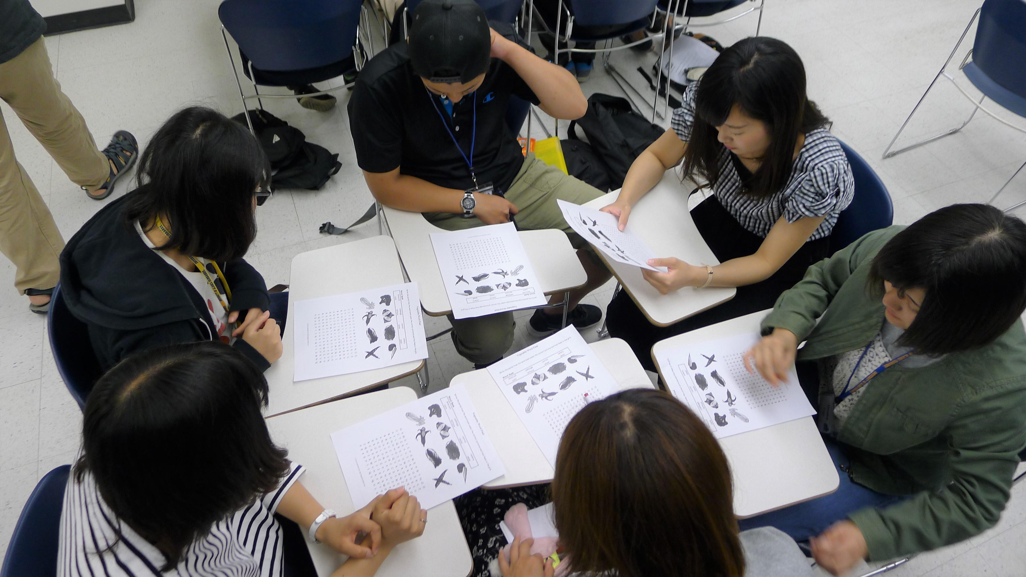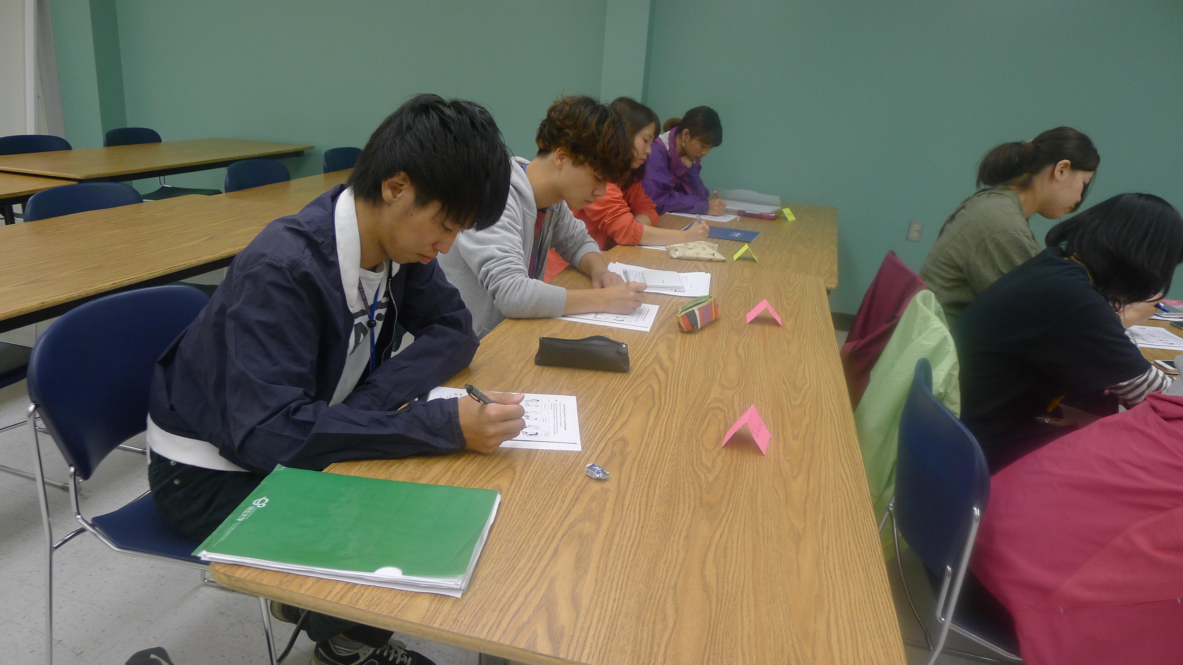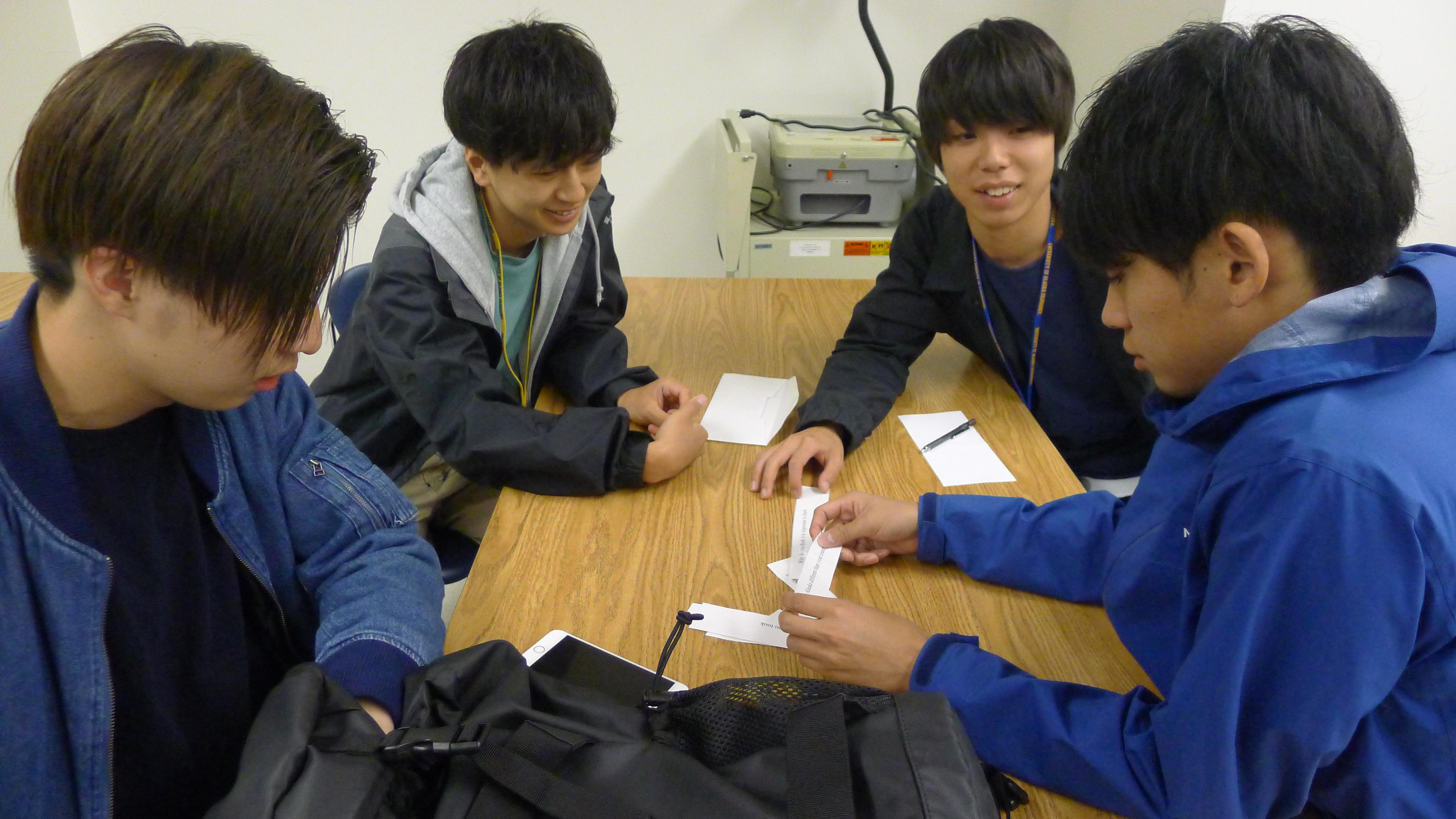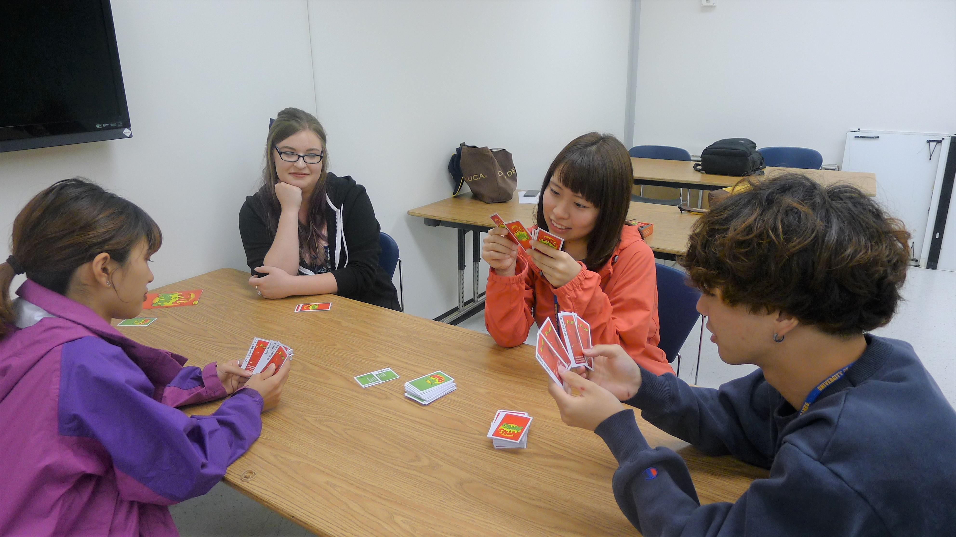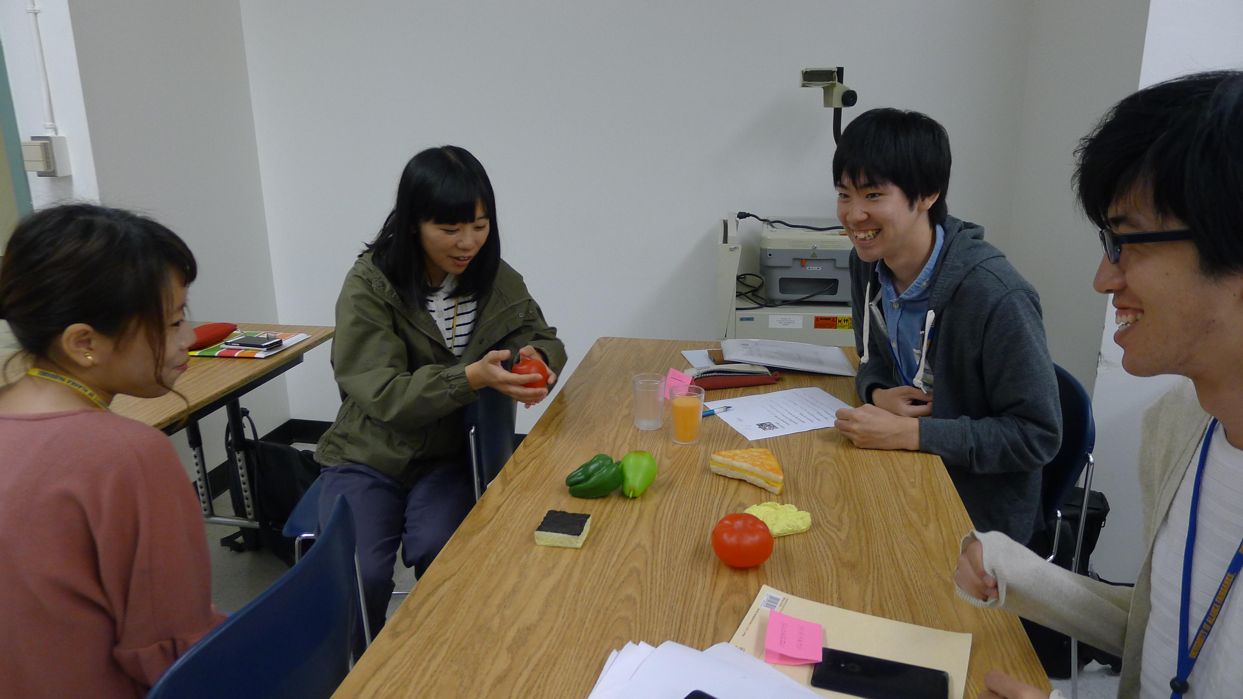 午前中は英会話の授業。まず、午後の講義に関連する英単語とその意味を確認しました。その後、アメリカで人気の遊びにチャレンジ。「Who am I」(人物の特徴に関する質問をしながら、相手が選んだ人物を当てる遊び)、「Once Upon a Time」(絵の描いたカードを一枚ずつ出していき、物語りを作り上げていく遊び)、「Scrabble」(アルファベットのピースを縦横に並べて、英単語を作る遊び)など、英語や英会話スキルを駆使して、楽しみながら取り組みました。