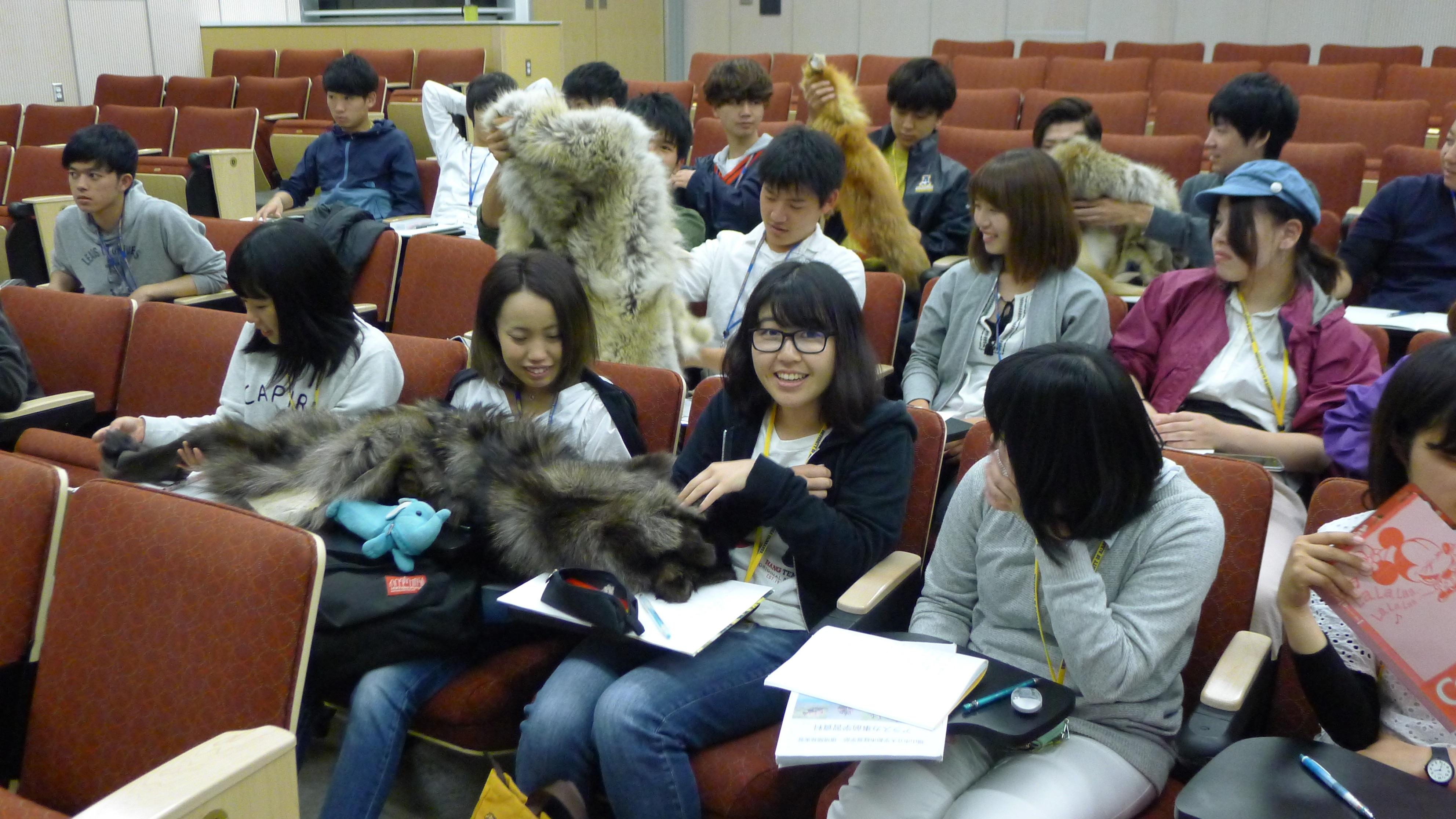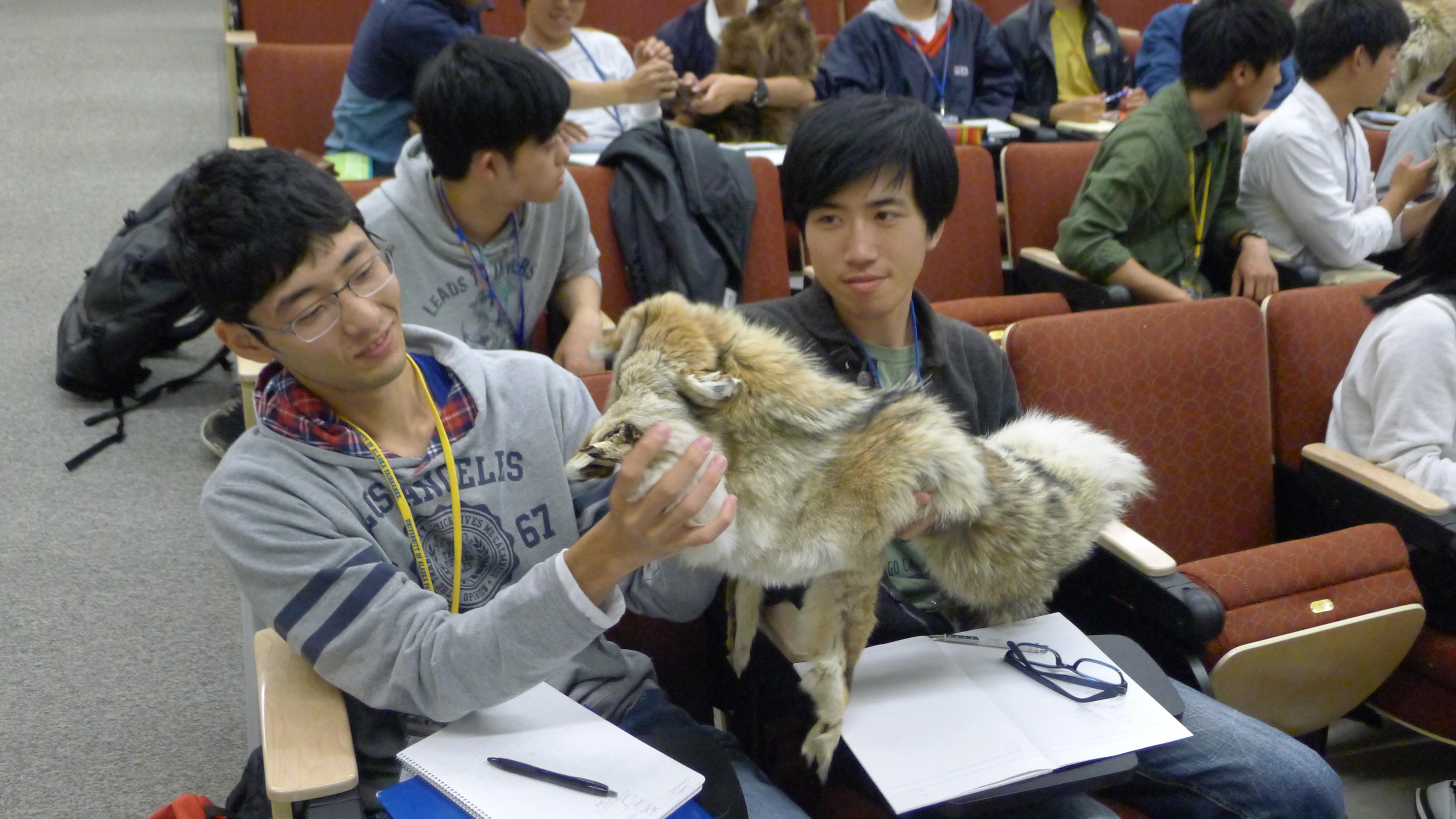 CaribouやMoose、Grizzly bearなど、アラスカにいる哺乳類を取り上げ、それらの分布や生態、近縁種間の違いなどを解説していただきました。その中で、実際に動物の毛皮を触りながら、寒冷地で熱を奪われない方法なども学びました。学生から出た質問「クマに遭遇したときの対処法」について、身振り手振りで説明するHarms先生の話に学生たちは聞き入っていました。
