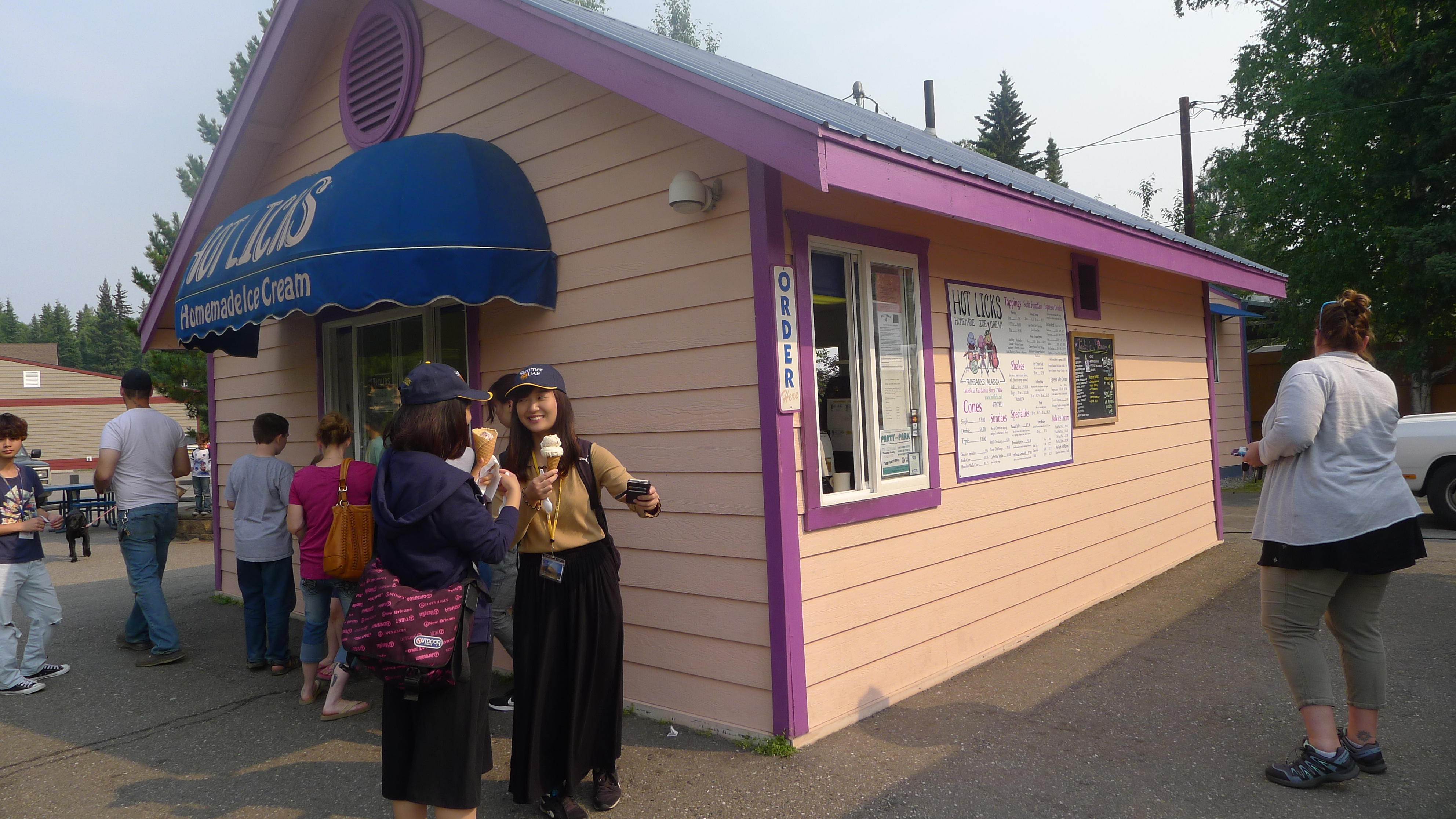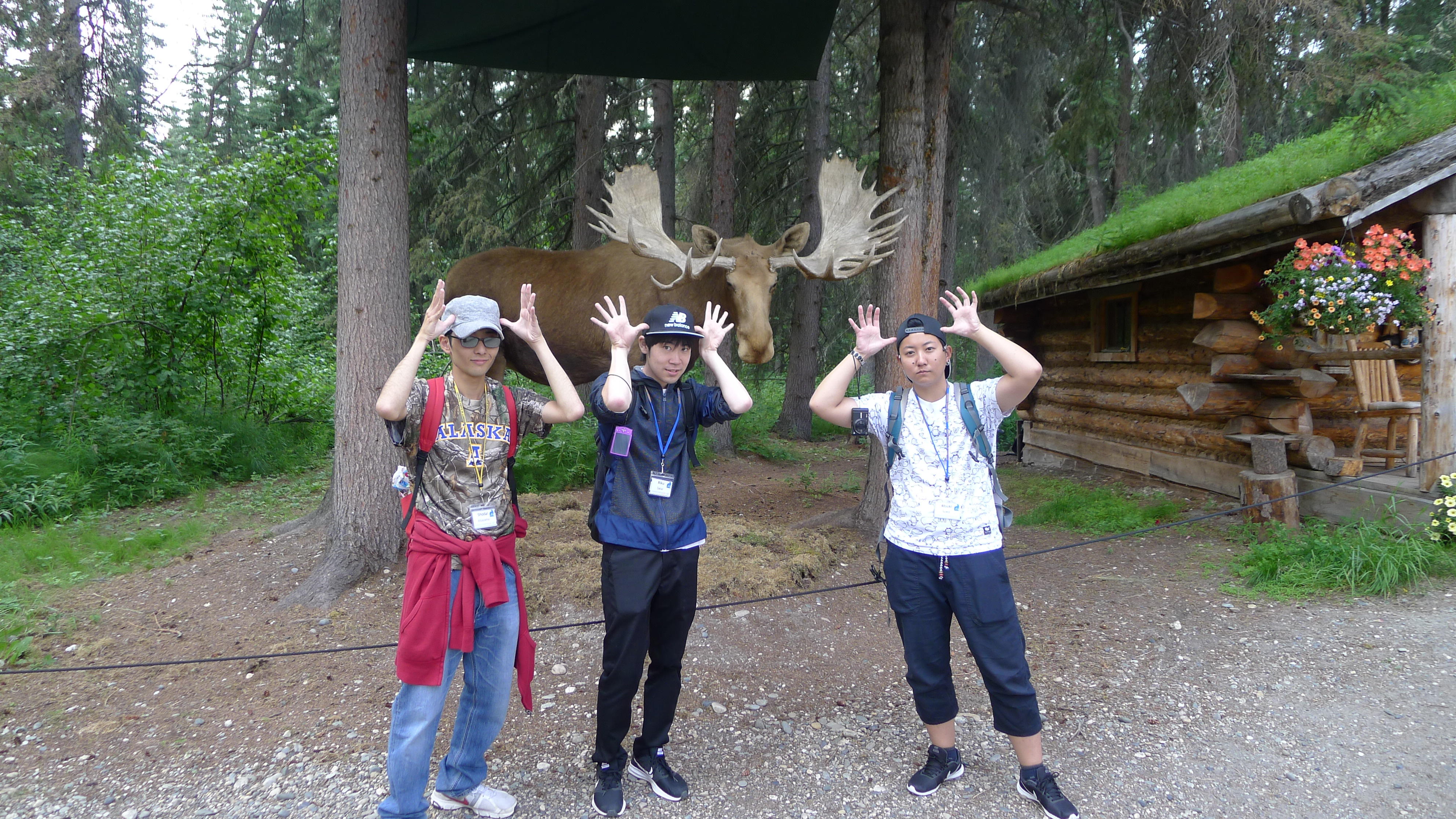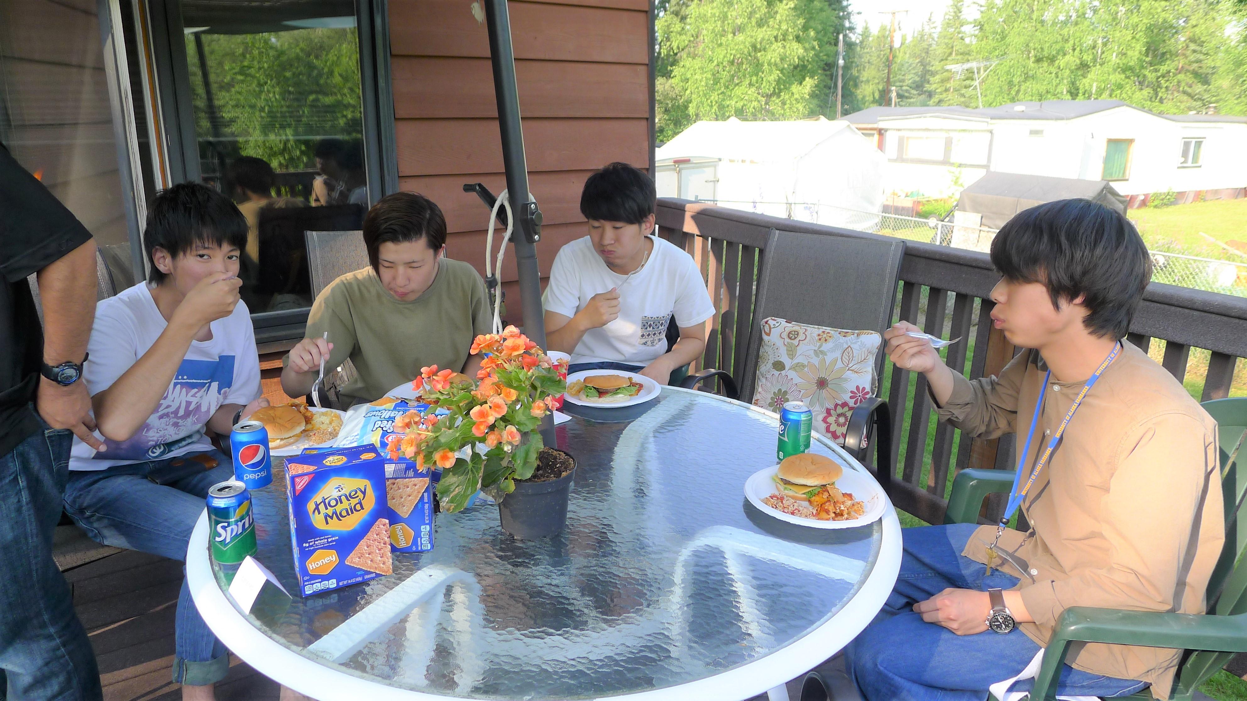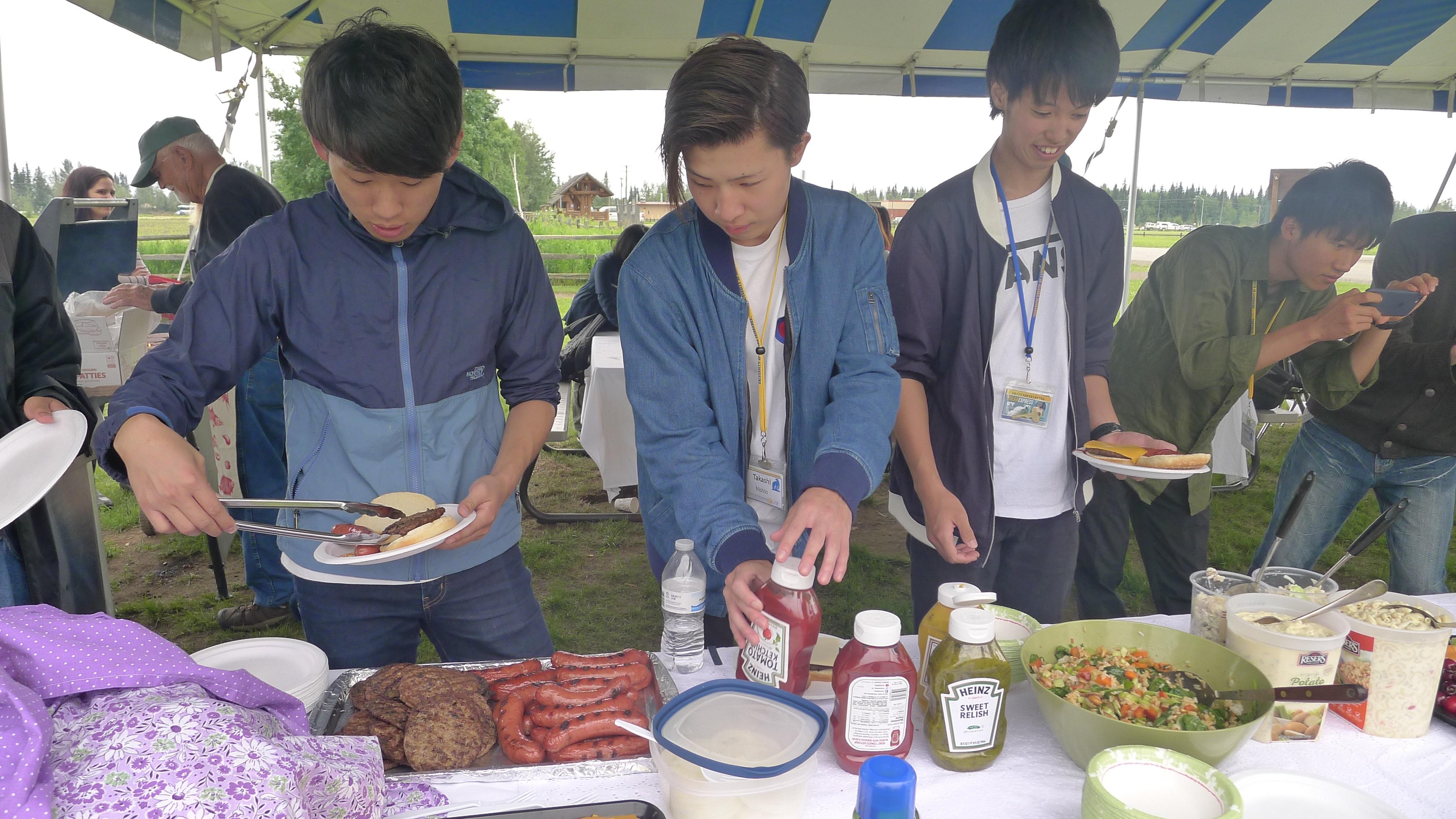 次にフェアバンクス初の開拓酪農場であるGreamer's fieldに移動して、永久凍土地帯の自然を観察しました。その後、地元の人たちが用意してくれたバーベキューで舌つづみ。アメリカならではのハンバーガーやケーキ、Reindeerのソーセージを堪能しました。(M)