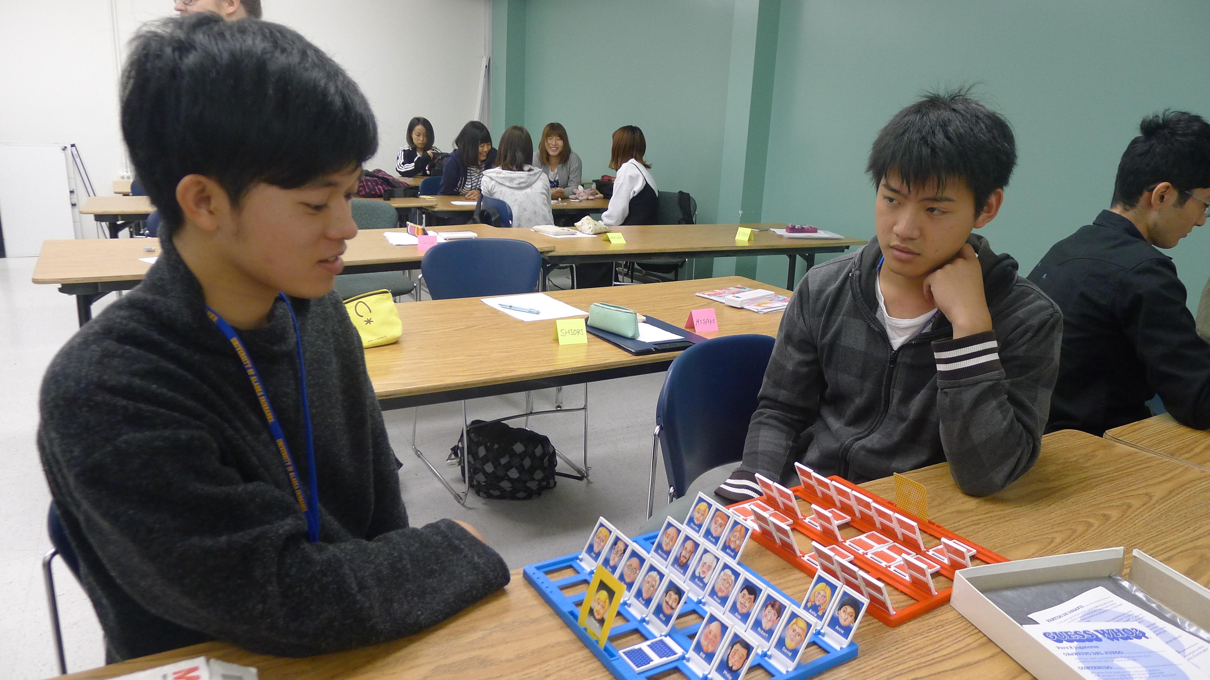 途中、「Guess Who」ゲームで気分転換。背中に有名人の名前を書いたカードが貼られます。自分では見えないカードの名前を、英語で質問しながら推測するゲームです。学生たちは活発に質問と回答を繰り返しながら、次々とカードに係れた名前を当てていきました。