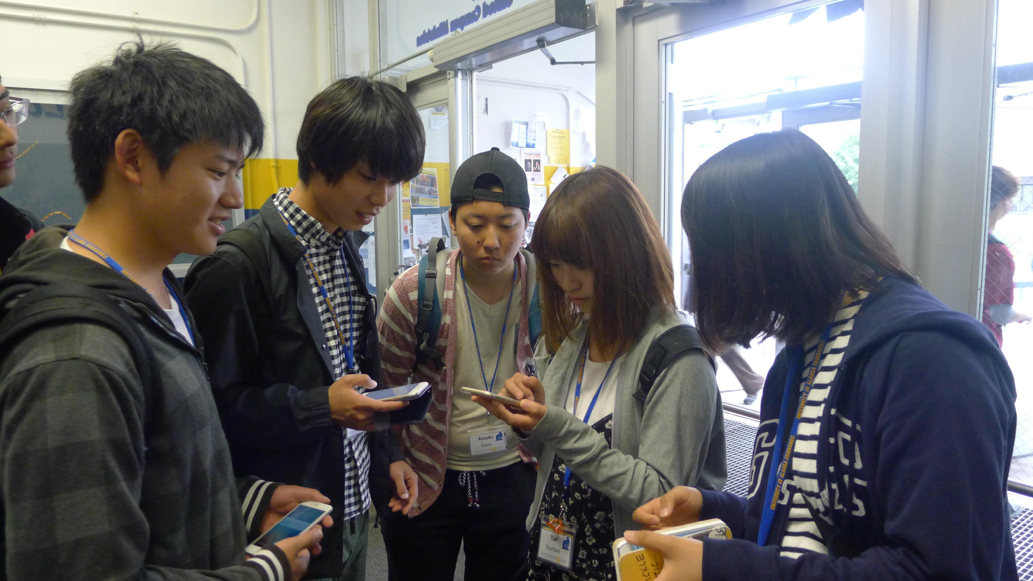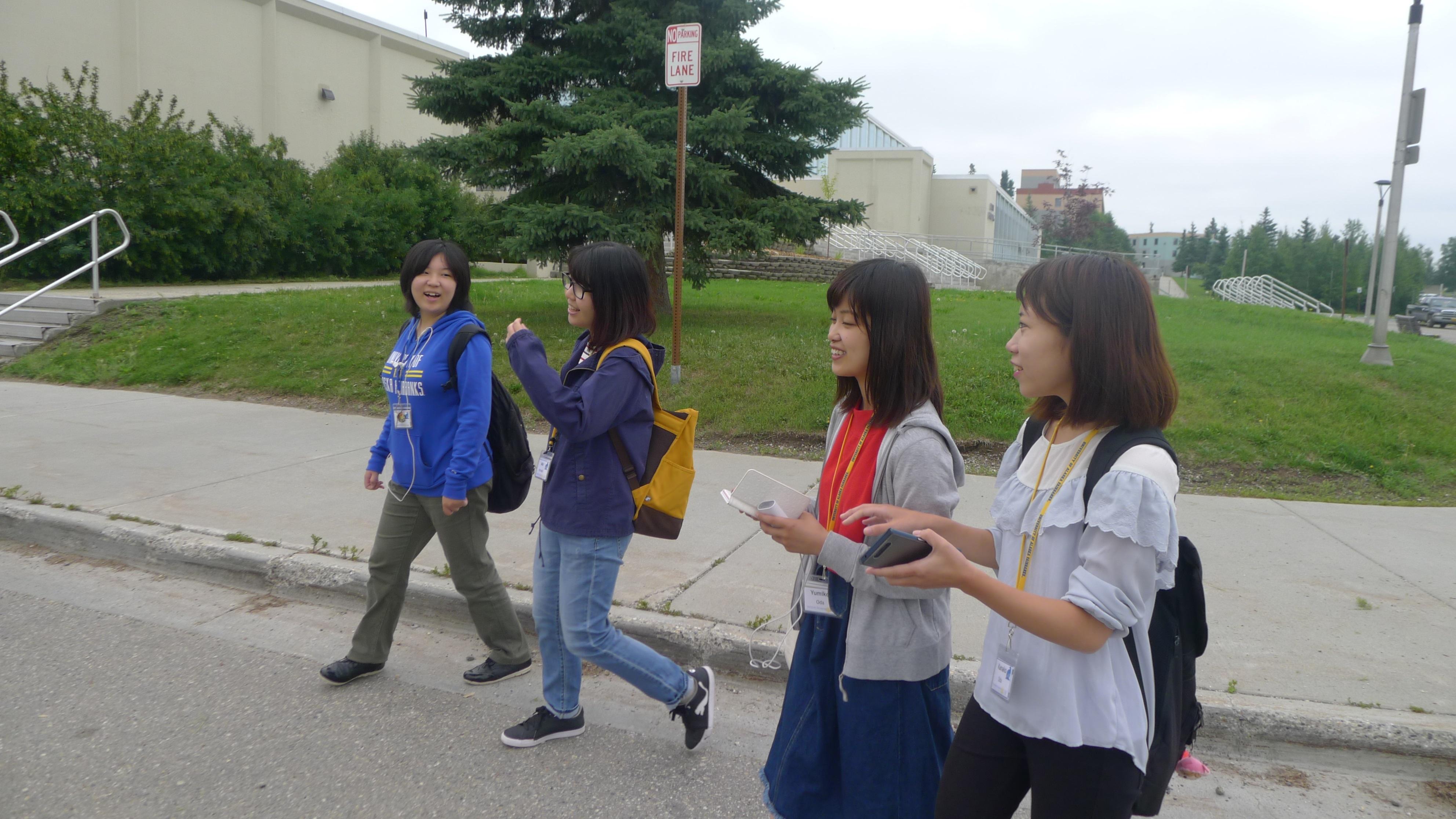 英会話の授業の後半は、大学構内を歩いて、アラスカ大学の歴史や魅力を探し出すウォークラリーです。3~4人ひと組のグループに分かれ、スマホ片手にチェックポイントを探します。スマホに表示される英文の意味を解き明かし、指示された写真を撮ったら、アイテムをゲット。学生たちは協力しながら、次々とチェックポイントを攻略していきました。