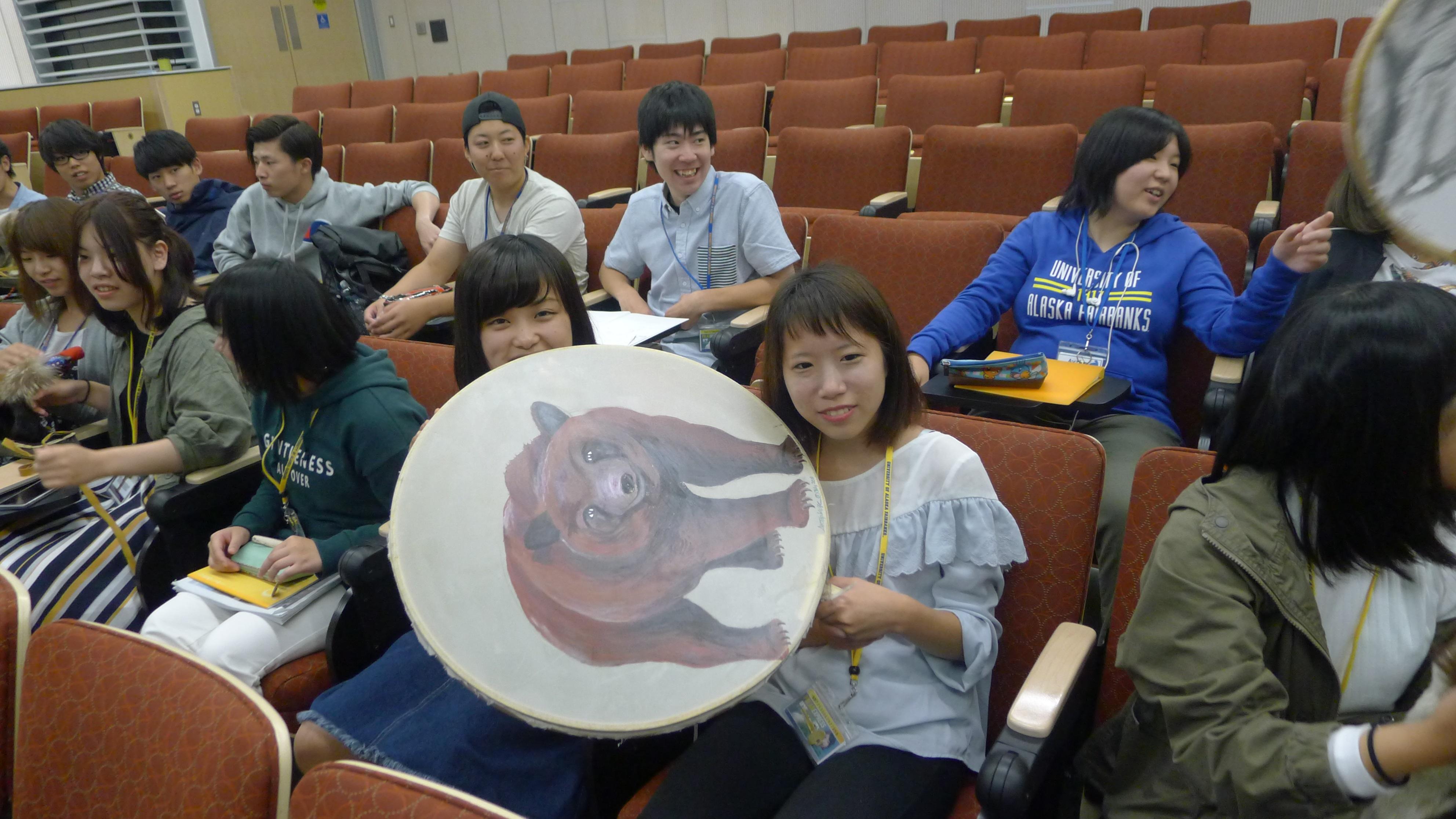 AthabaskanやYup'ikなど、アラスカ先住民の文化について解説しつつ、いくつかの伝統的なダンスやゲームを披露していただきました。ダンスにはTopkok先生のご子息2人も参加し、講義室いっぱいに歌声が響き渡るすばらしいものとなりました。また、学生たちもその場でダンスに参加し、アラスカの伝統を体感しました。