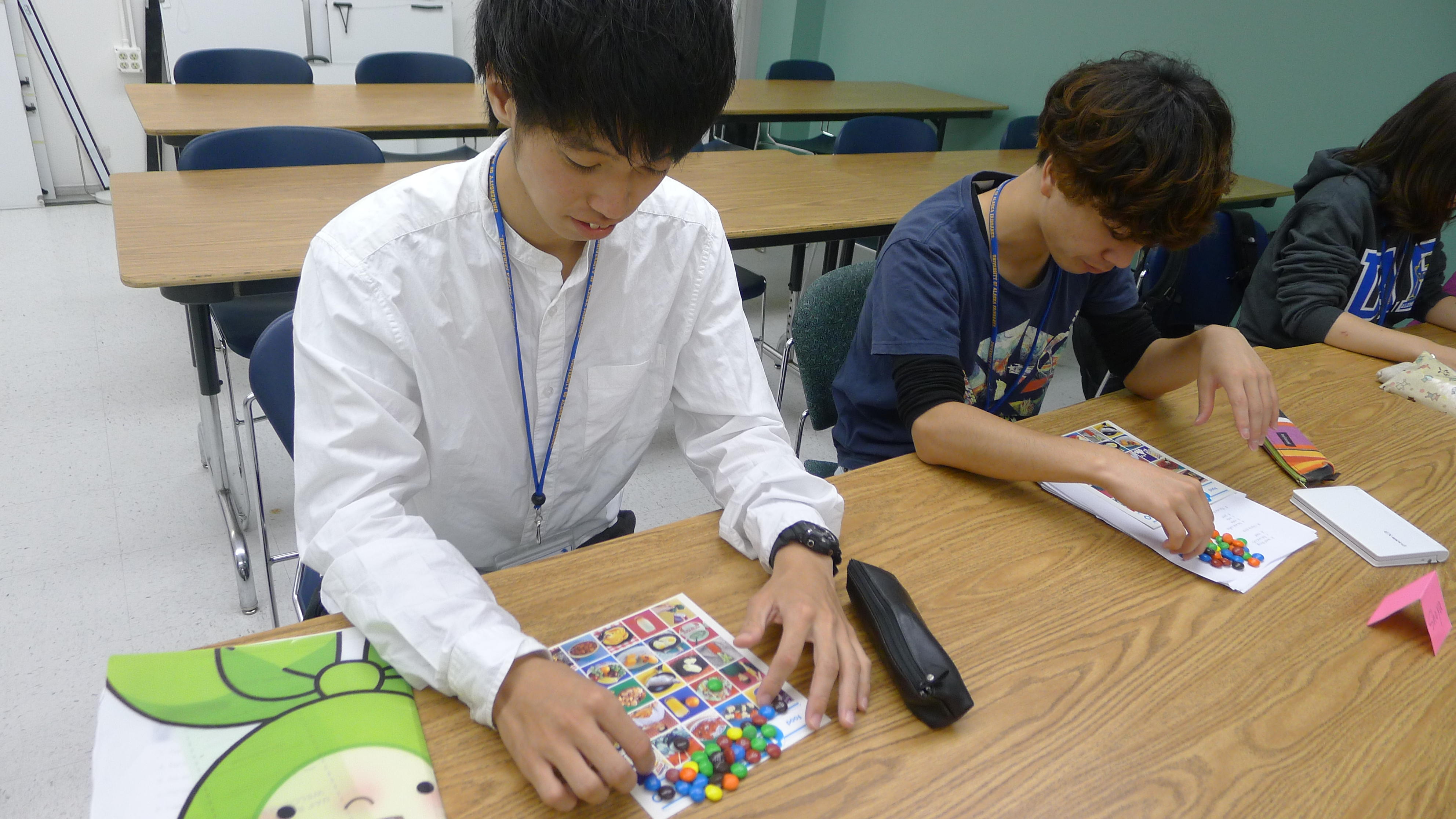 明日はダウンタウンのレストランで、各自、昼食をとることから、食事に関連する英語を勉強しました。様々なアメリカ料理の英単語をパネルを見ながら覚えていき、先生の言葉を聞き取りながら、ビンゴゲームを楽しみます。また、昨日に続いて、ゲームをしながら英会話を勉強しました。引いたカードやすごろくのマスに応じて質問に答えるゲームでは、自分の考えや体験談について英語で発表します。また、ルーレットが示すアルファベットから始まる英単語を思い浮かべ、他の人と被らなかったら勝ち、というゲームもしました。