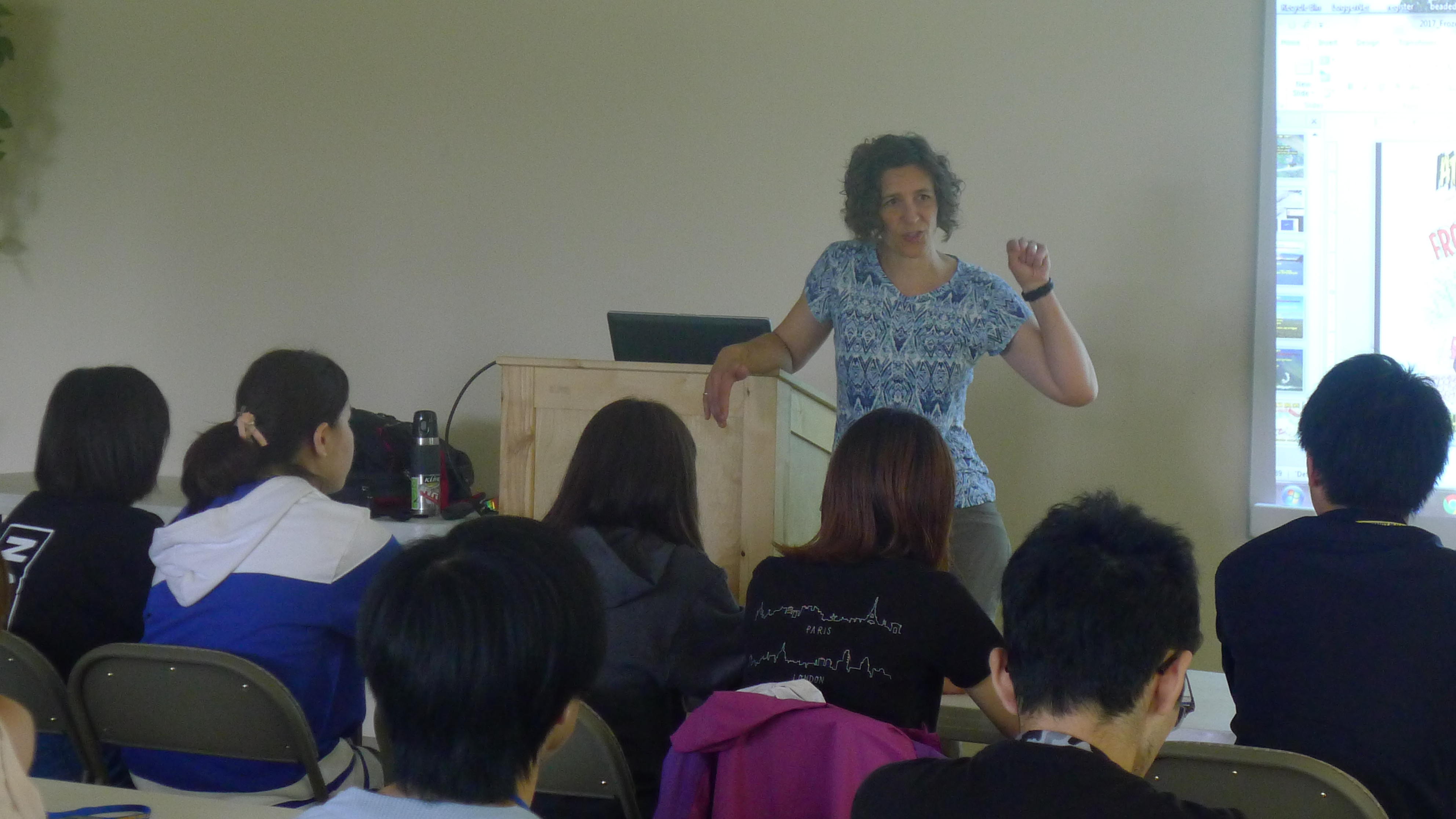 アラスカの永久凍土やカリブーなどの動植物について、日本と対比させながら、ゆっくり丁寧な英語で話していただきました。学生たちも興味深く聞き入り、十分に理解できたようです。