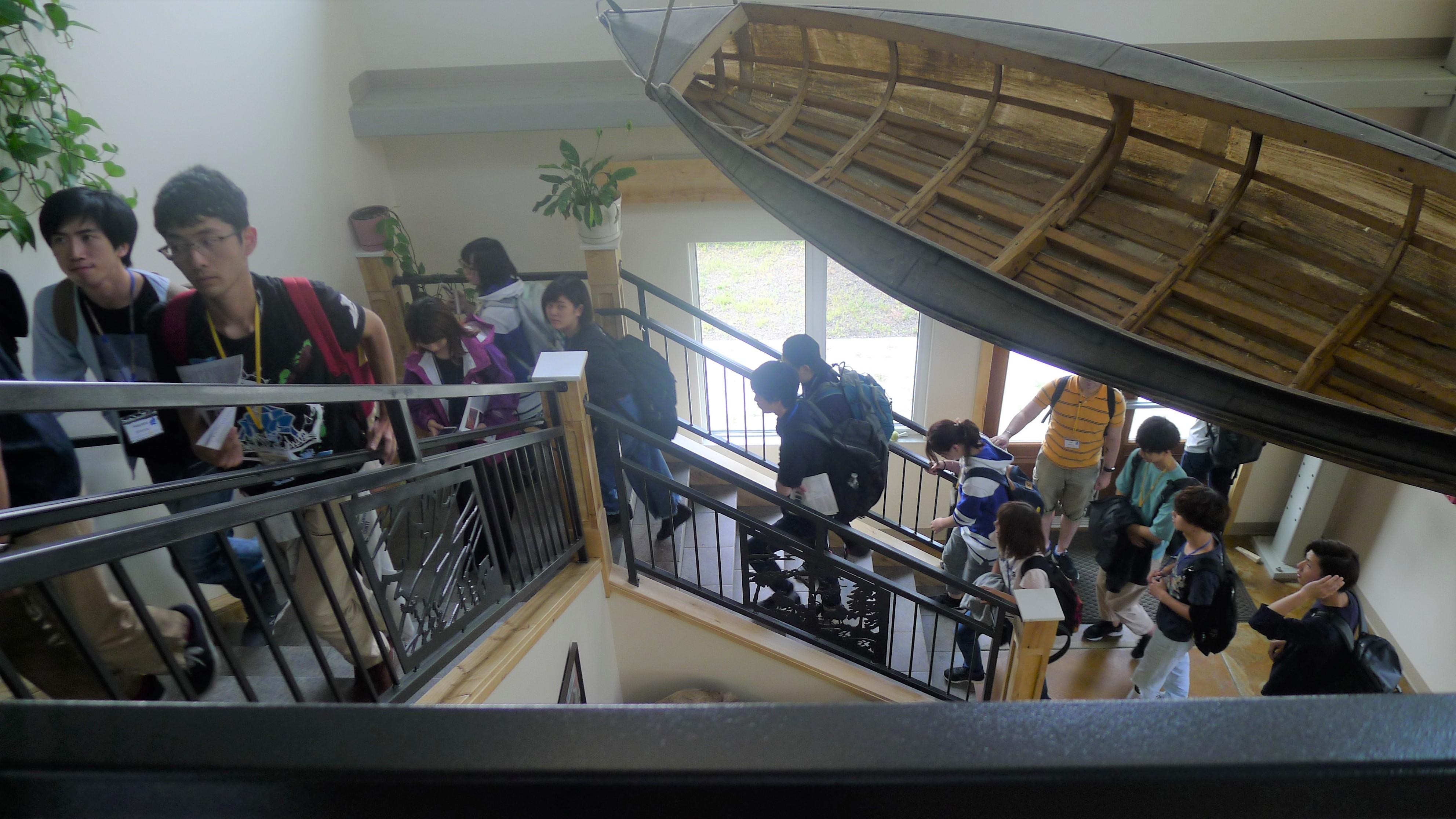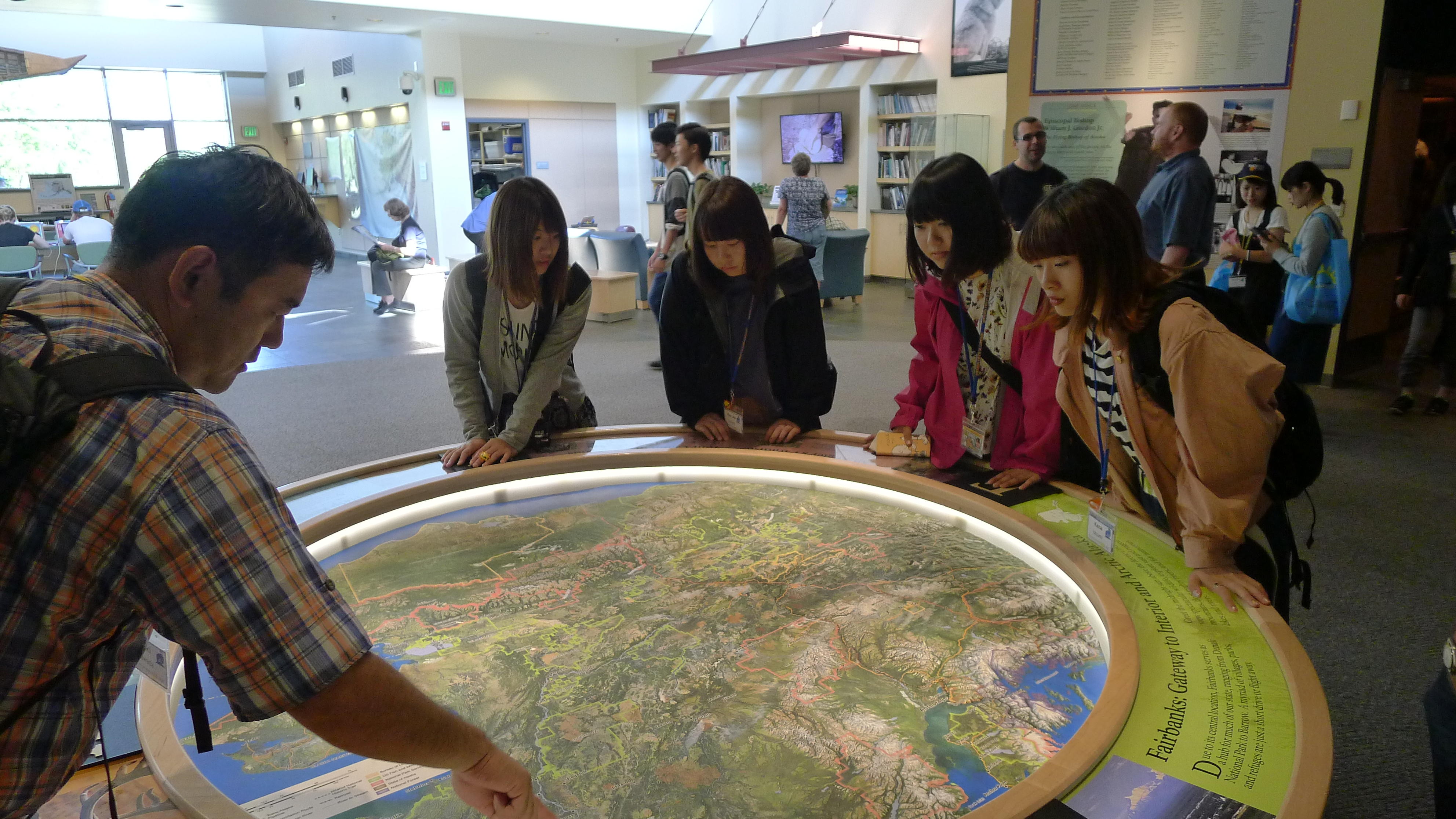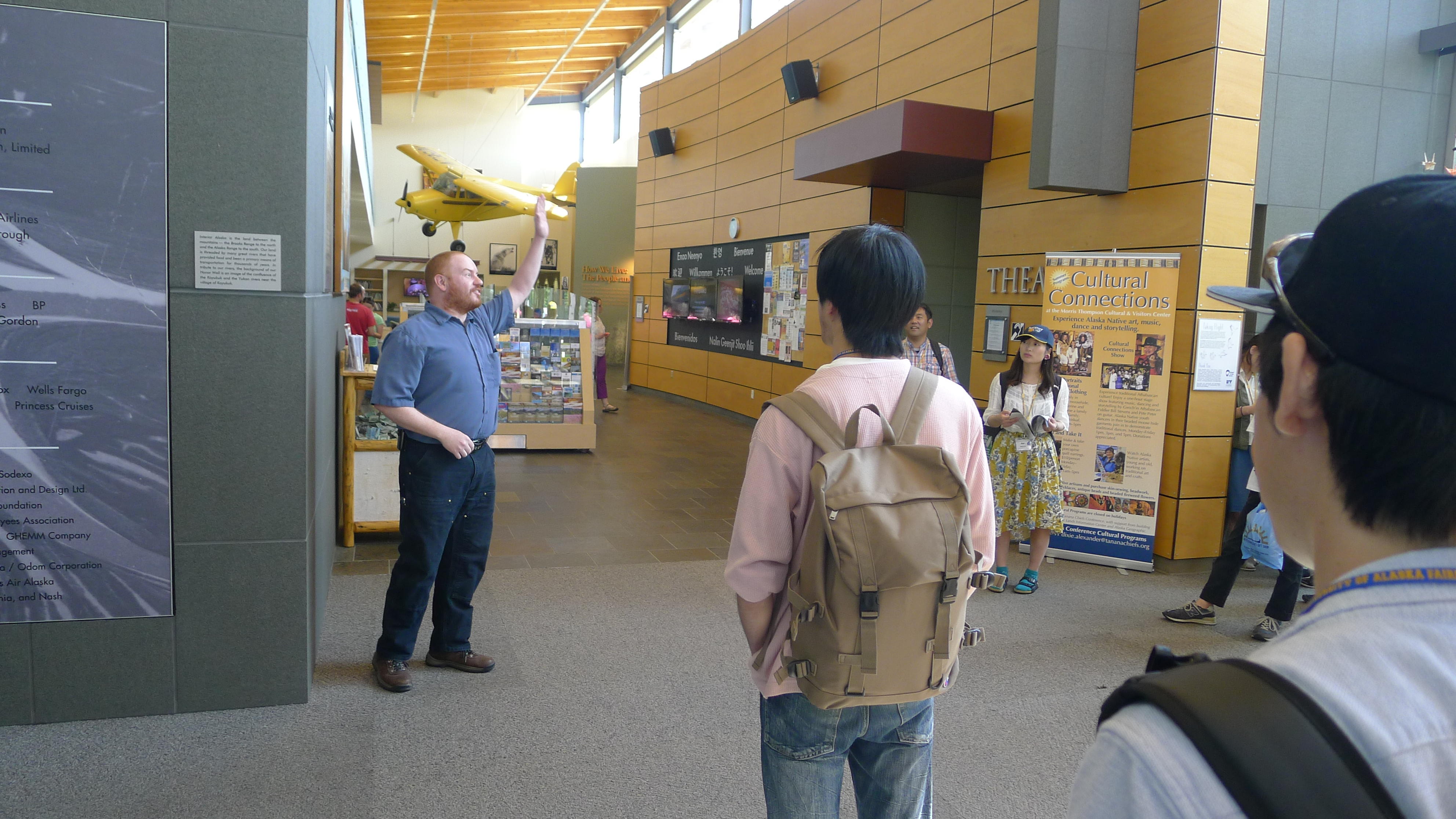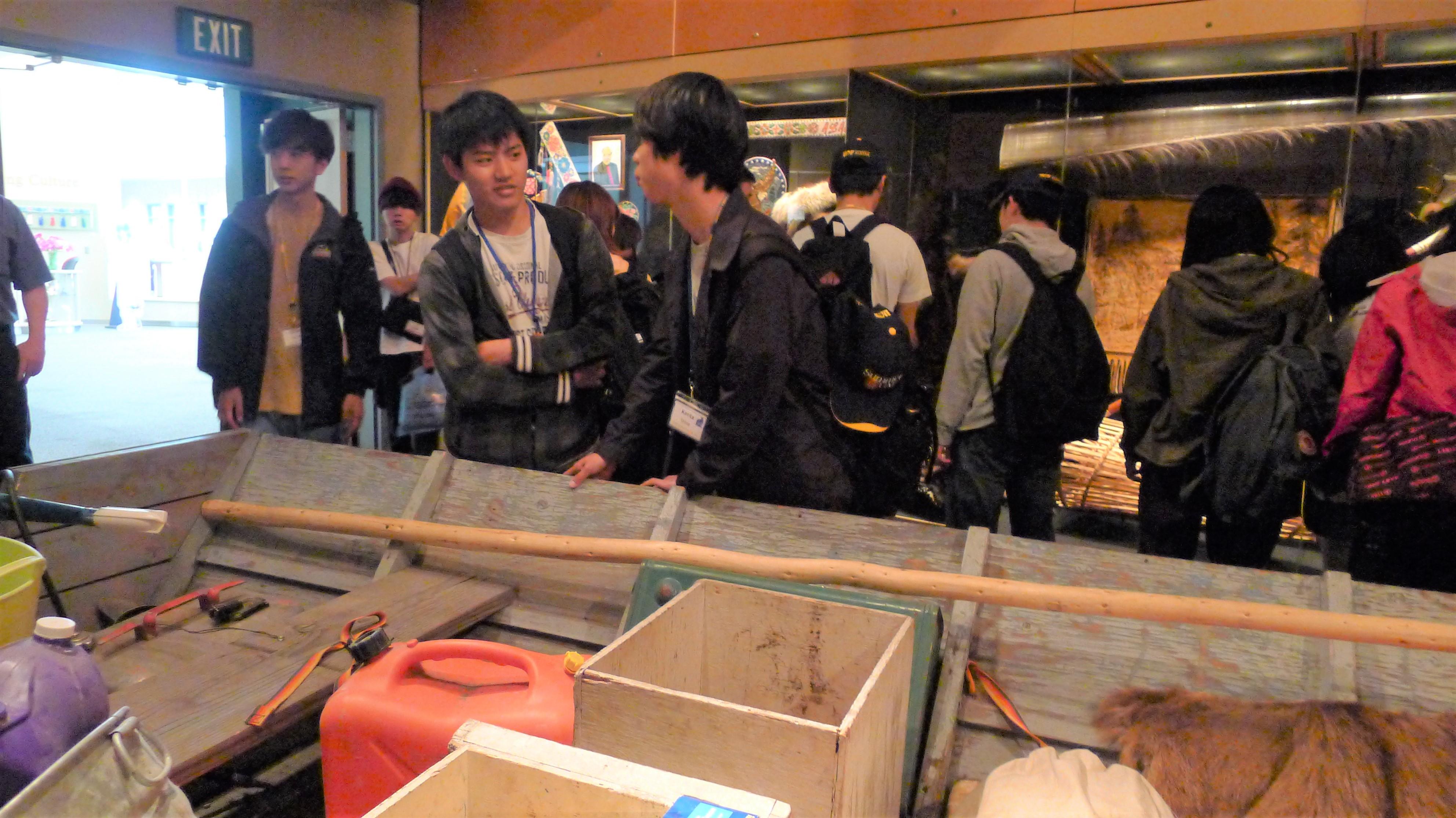 ダンスの後は、Visitors CenterのEdさんから館内の展示品を紹介していただきました。アラスカ先住民の生活道具や生活様式が学べるようになっており、学生たちは、極域やその周辺の寒冷地で生活していくための知恵や工夫に見入っていました。(M)