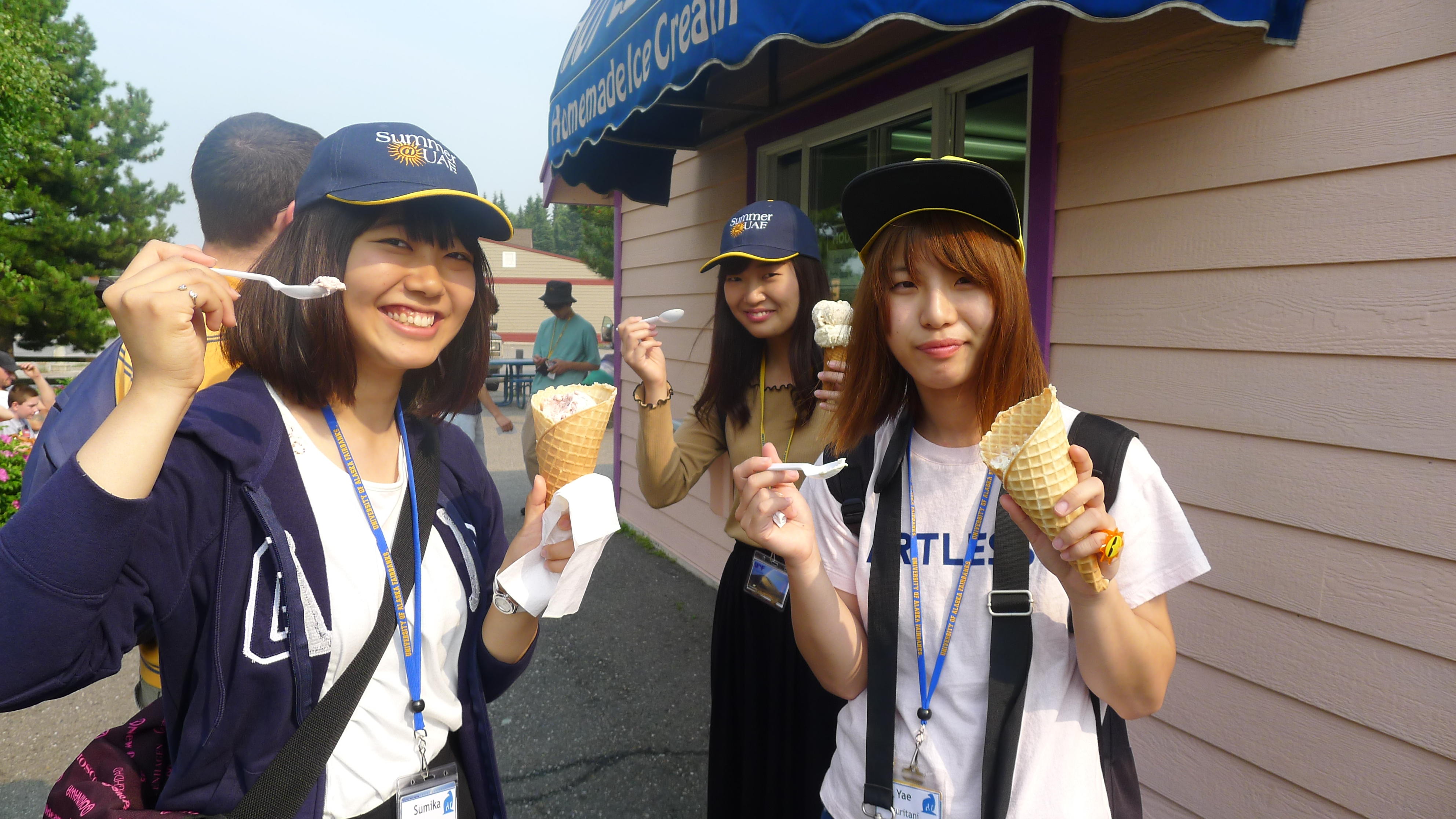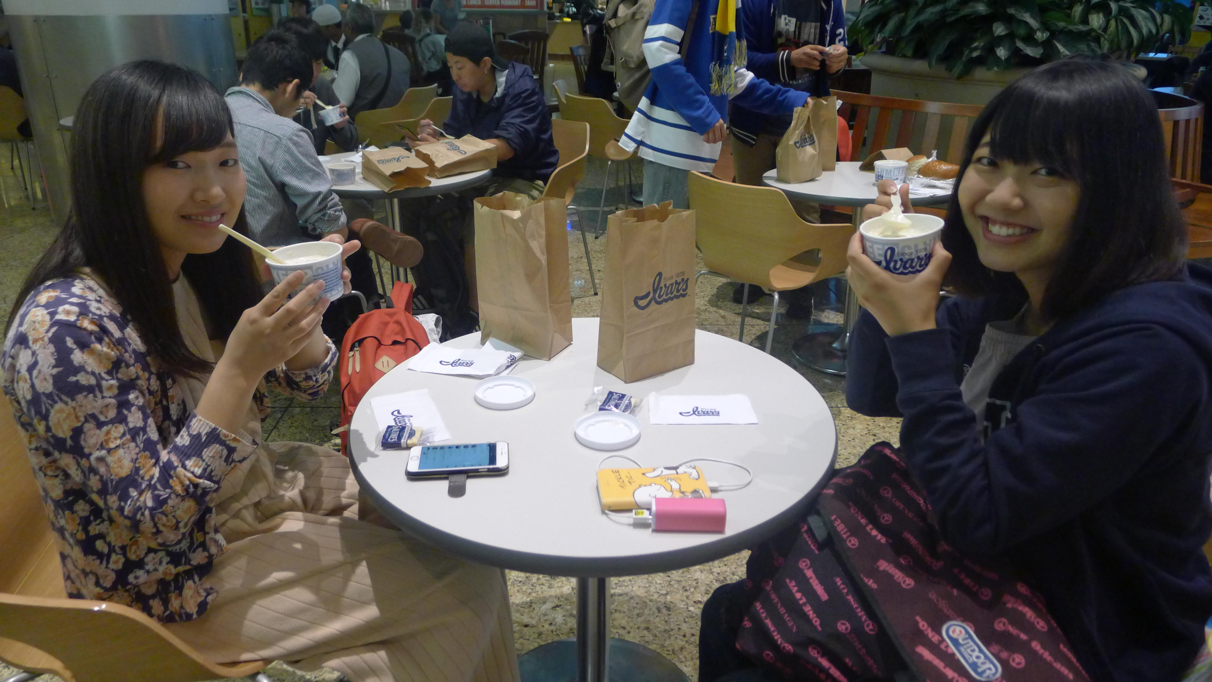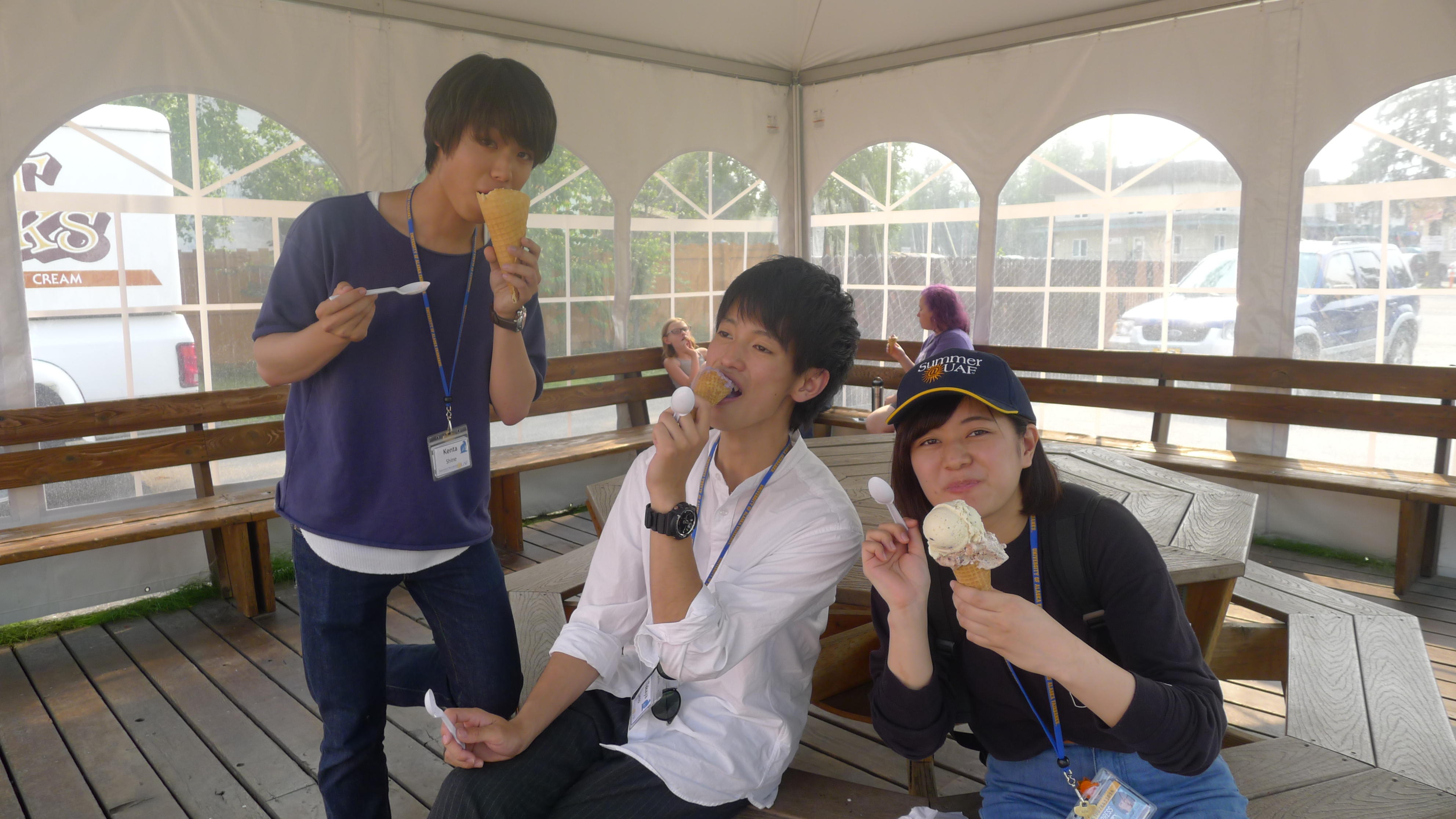 汗ばむ陽気ということで、一部の学生たちが近くのアイスクリーム屋へ出かけました。メニューを見ながら、思い思いの味付けやコーン、トッピングを選んでいきます。英会話の授業の成果か、全員、スムーズにオーダーを通すことができました。冷たいアイスで気分をリフレッシュです。