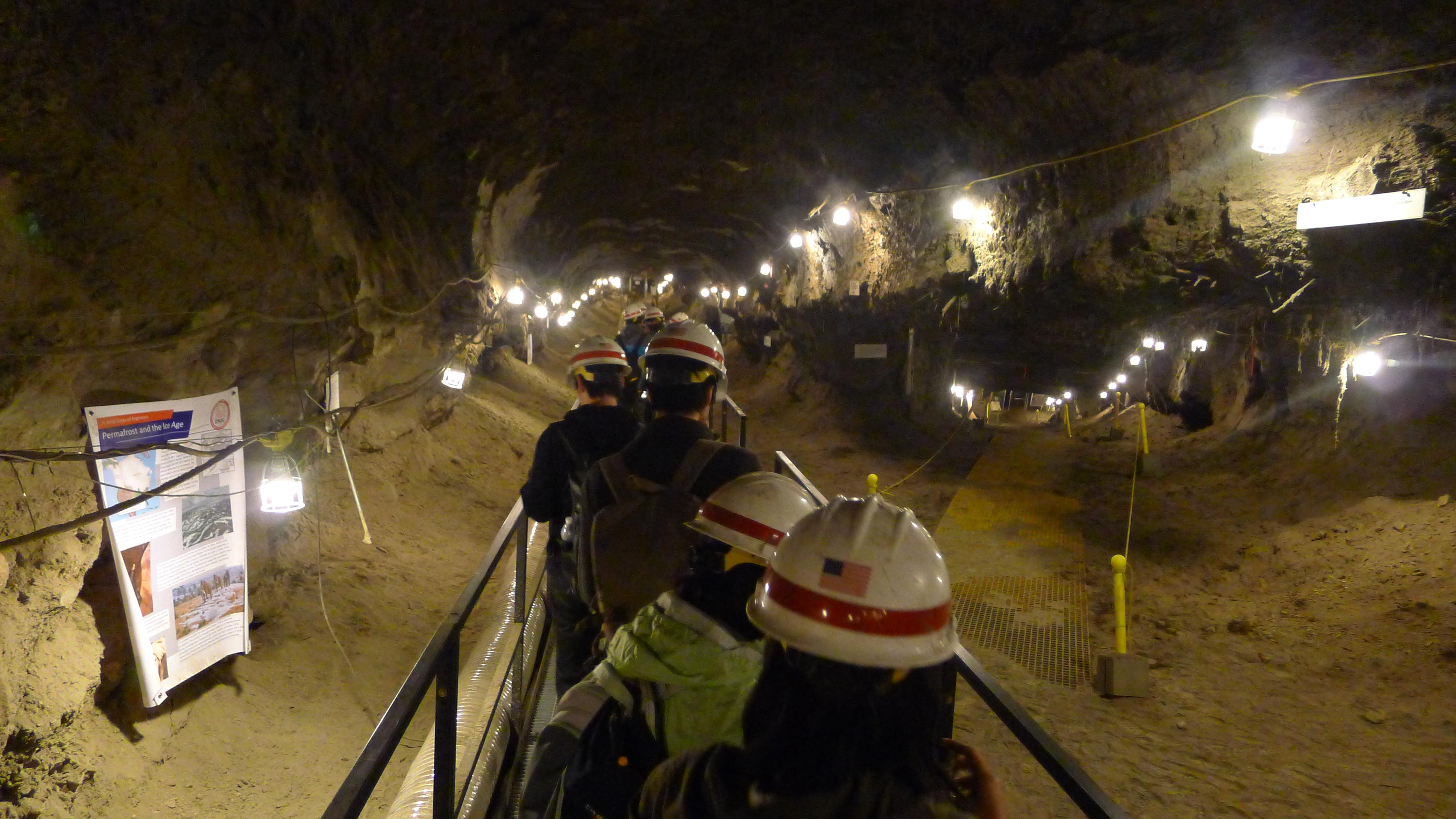アラスカ大学の吉川先生の案内で、永久凍土トンネルを見学しました。Ice wedgeや氷の層を示しながら、その形成過程や生成順について、丁寧な解説をしていただきました。学生たちは寒さや臭いを忘れて、先生の解説を聞きながら、永久凍土について理解を深めていきました。