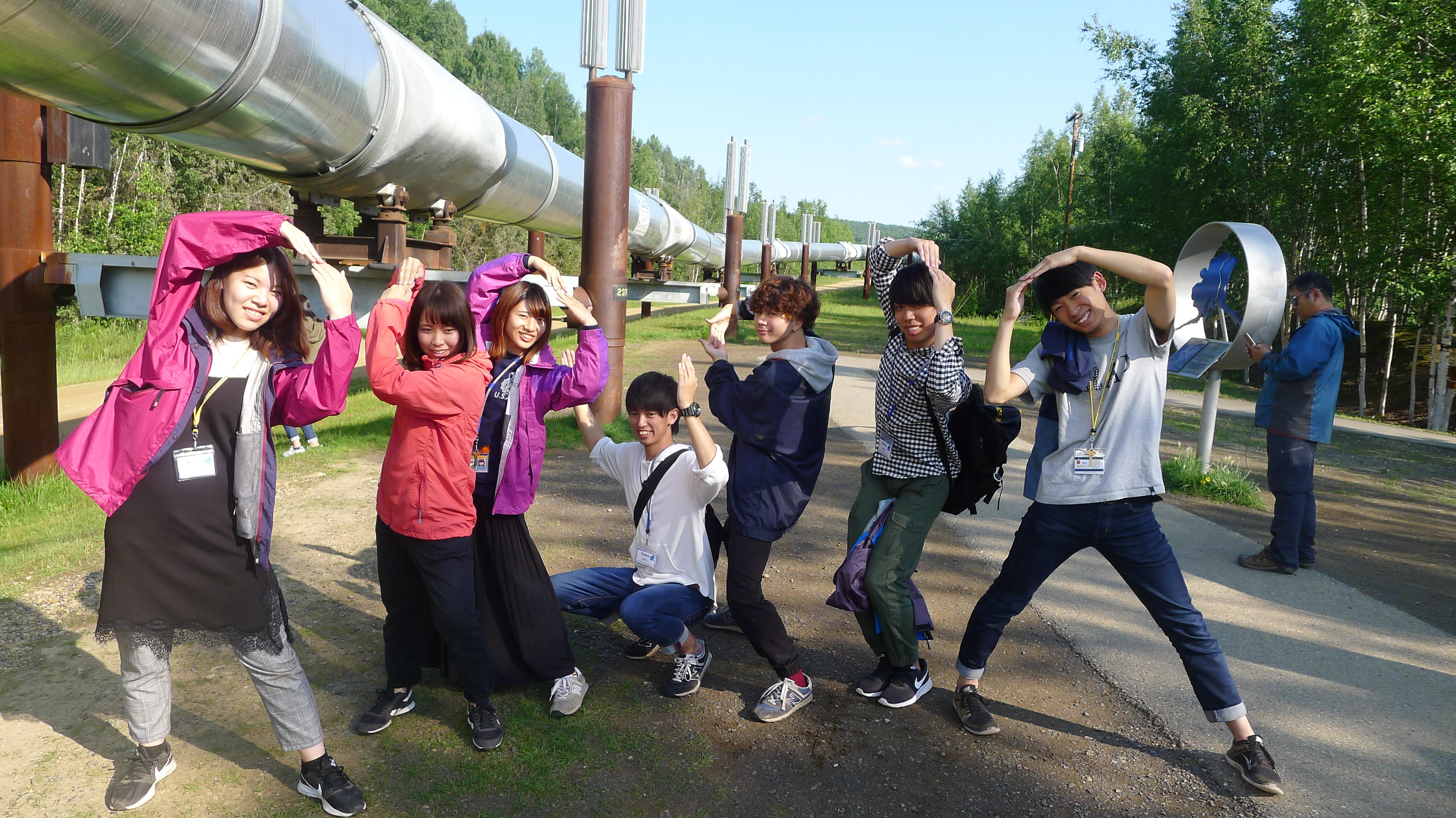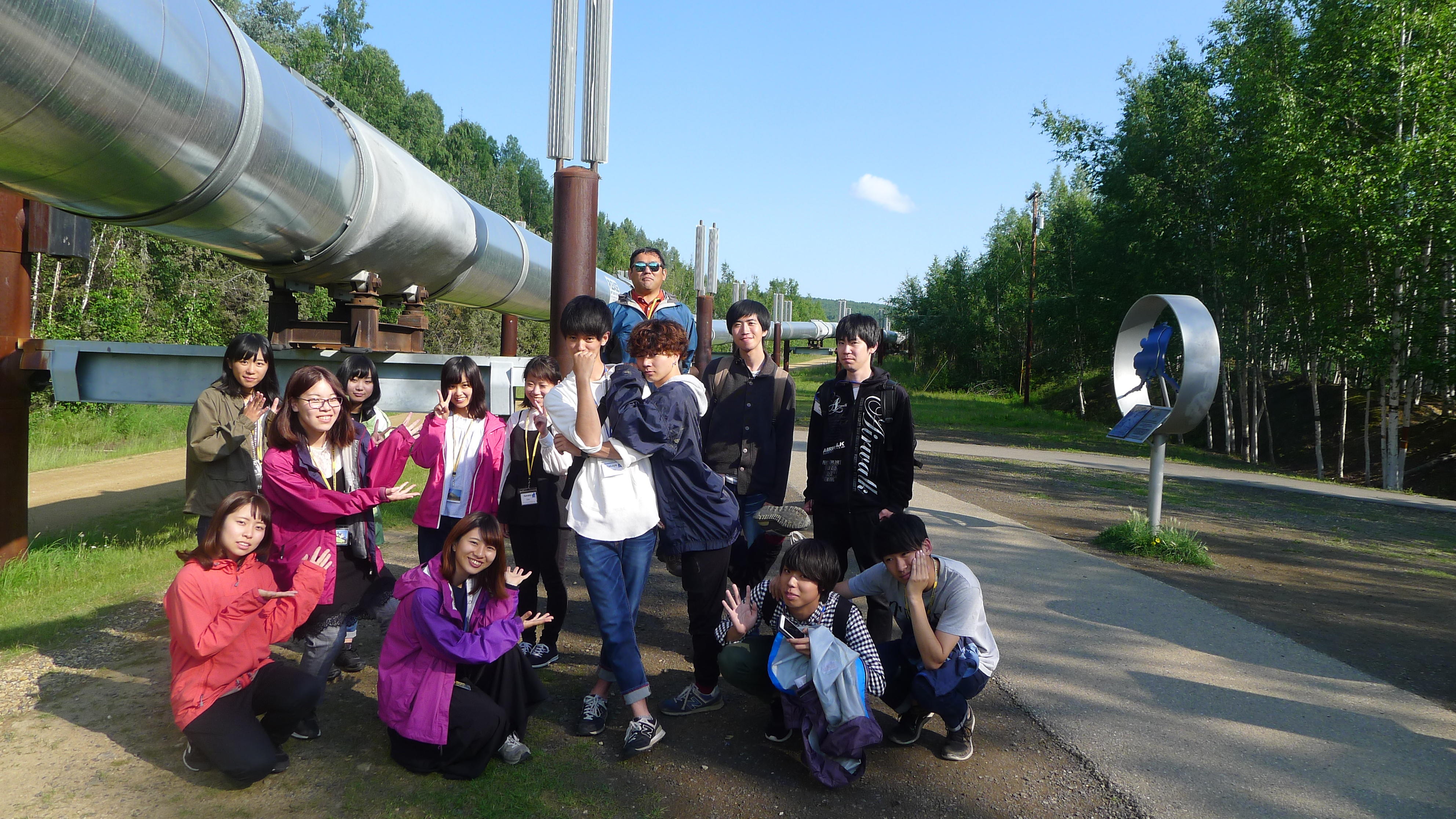 北極海沿岸で汲み上げられた原油を太平洋岸まで送る全長1300kmにも及ぶパイプラインであり、福山市のJFEが製作したパイプが使われています。熱による膨張・収縮の影響を抑えたり、永久凍土を溶かさないようにする仕組みなどを実際に見て学びました。