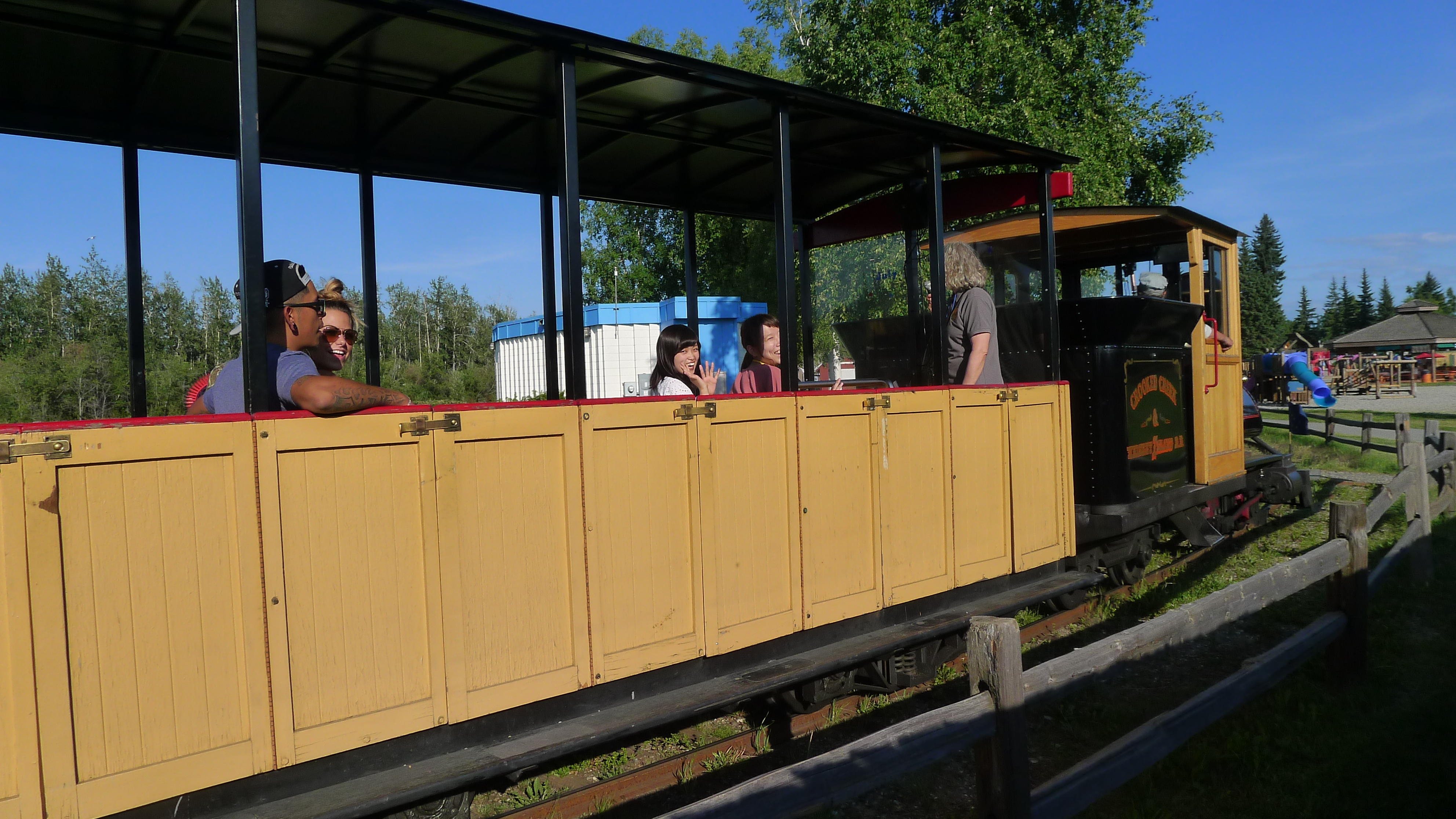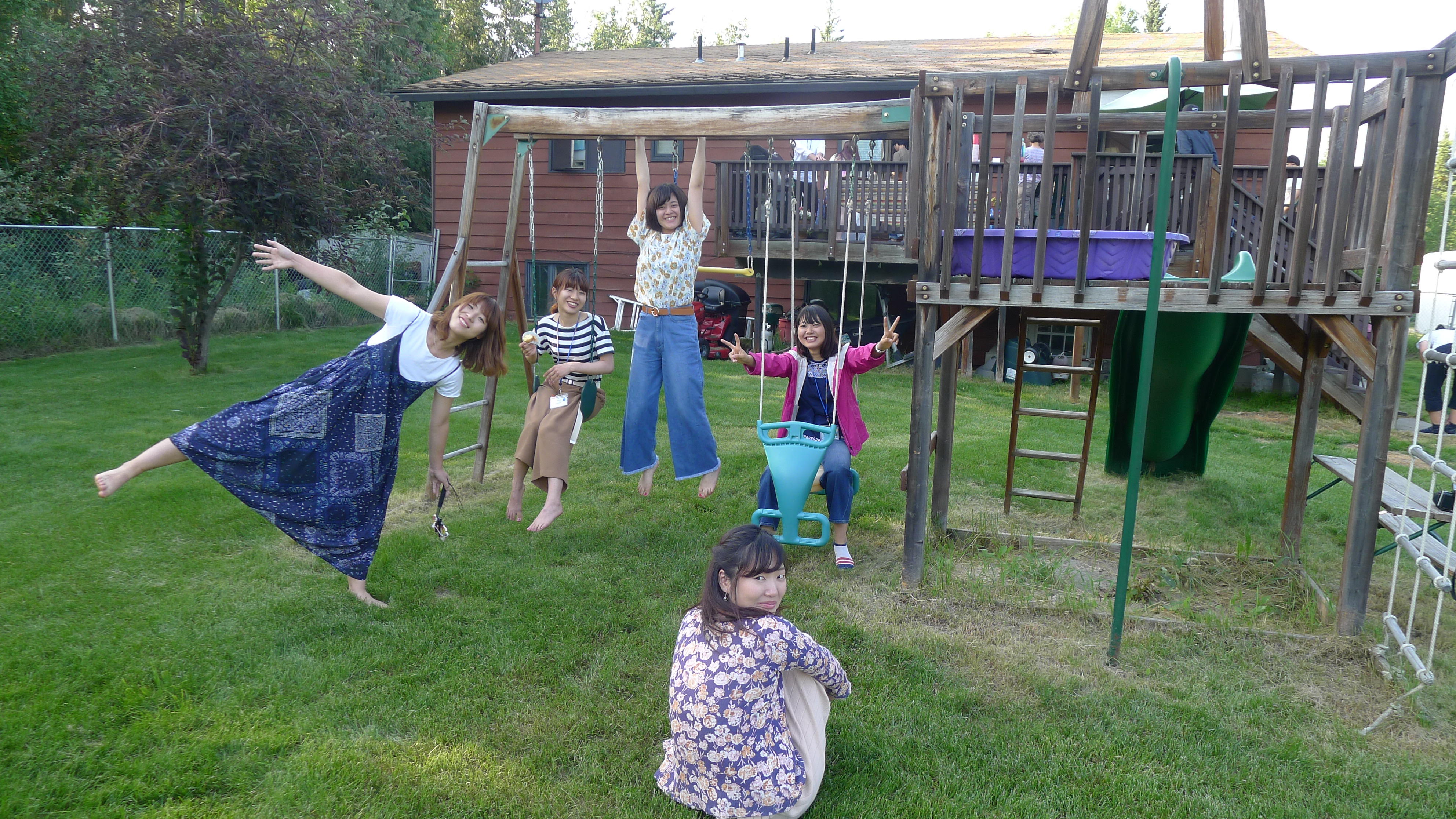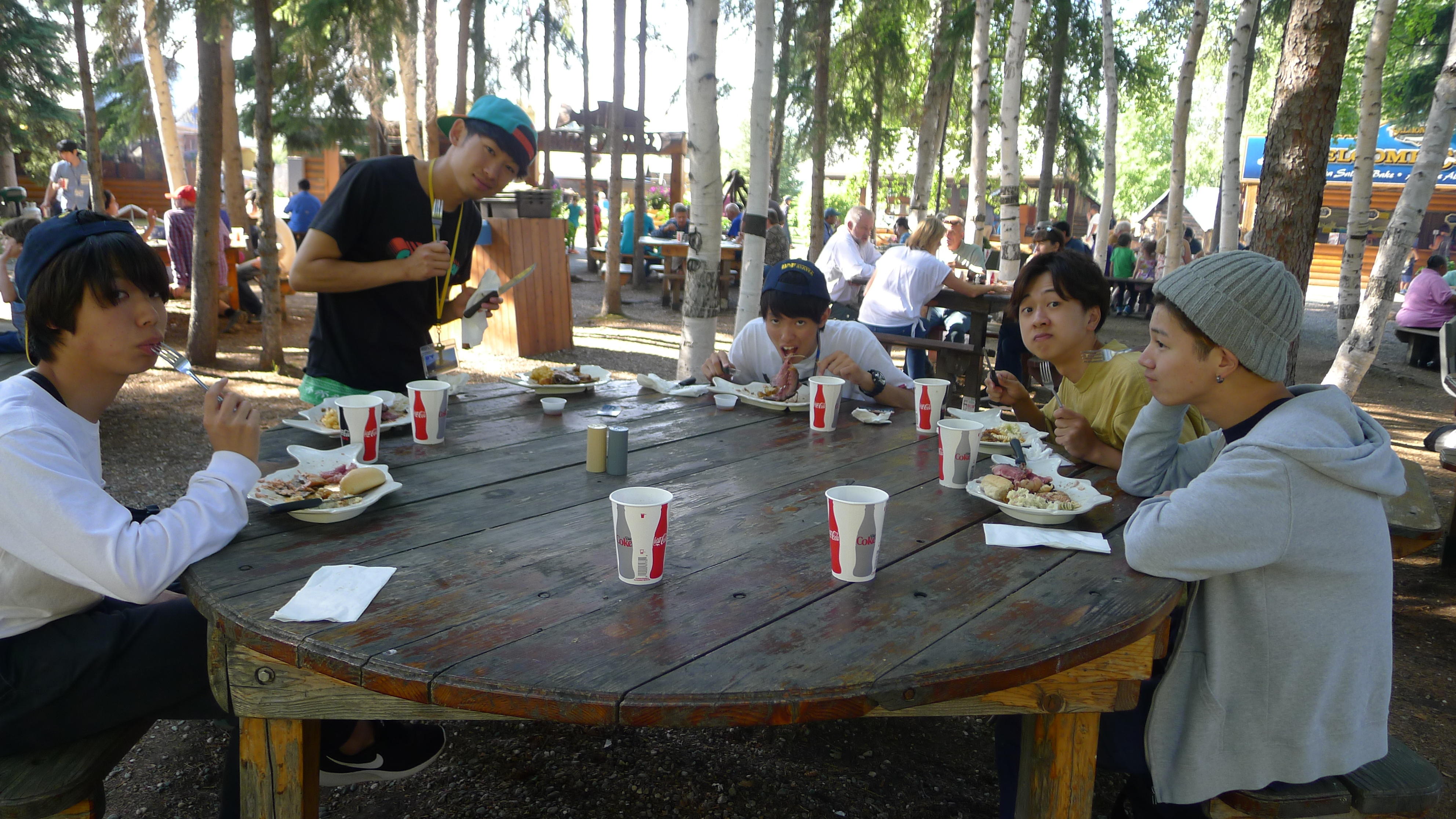 ラフティングの後でお腹がすいた学生たちは、大きなサーモンの切り身にかぶりつきます。食後は、お土産物屋でショッピングをしたり、Pioneer Parkの遊具で遊んだり、園内を走るトロッコ列車に乗って楽しんだりしました。(M)