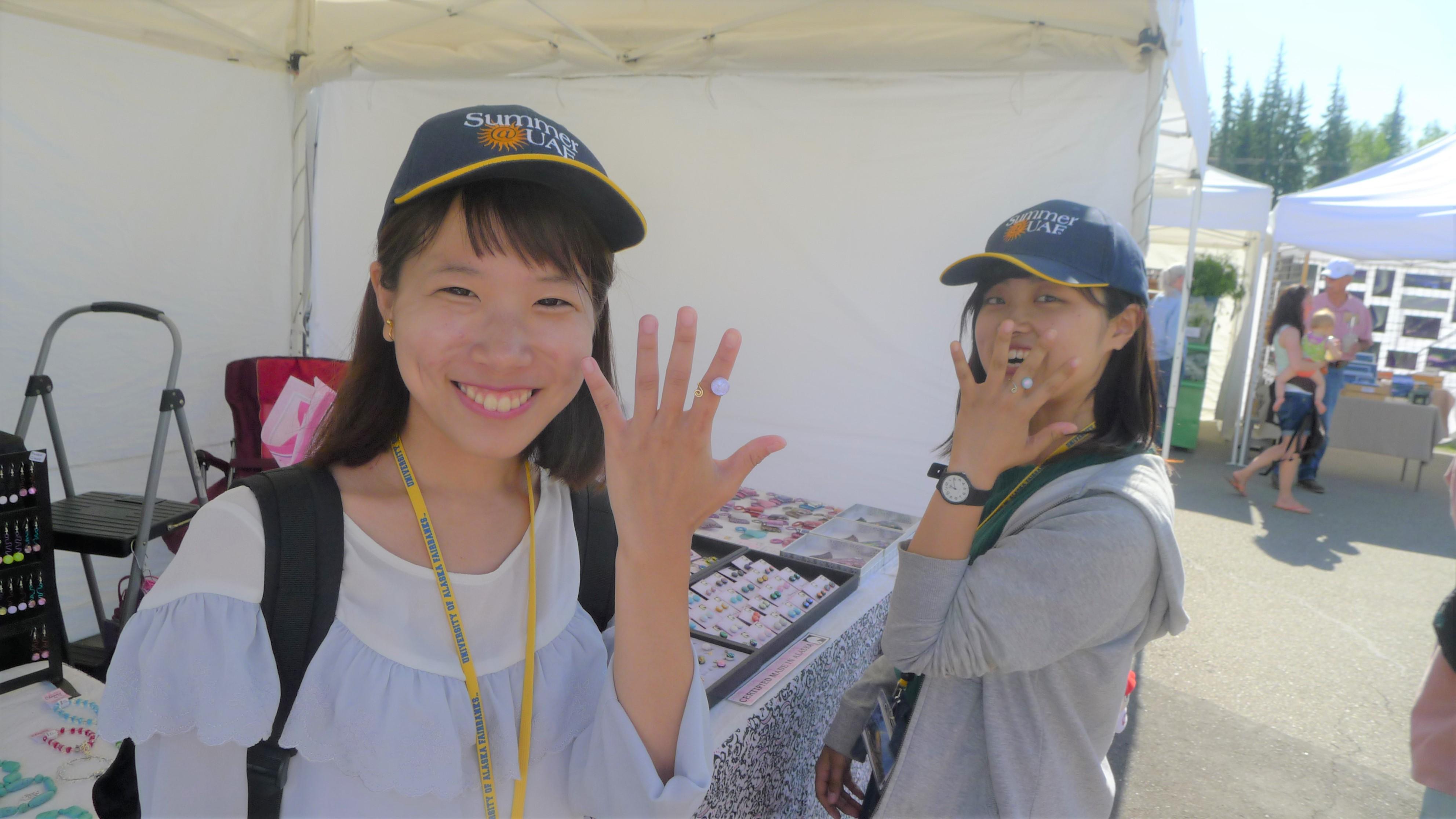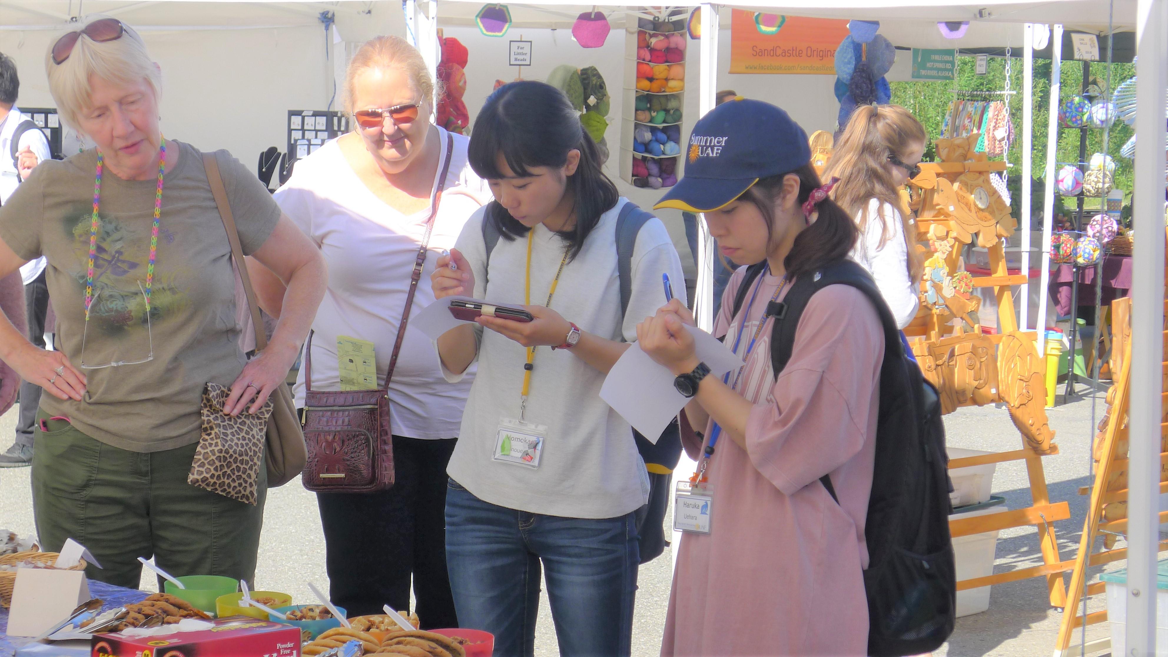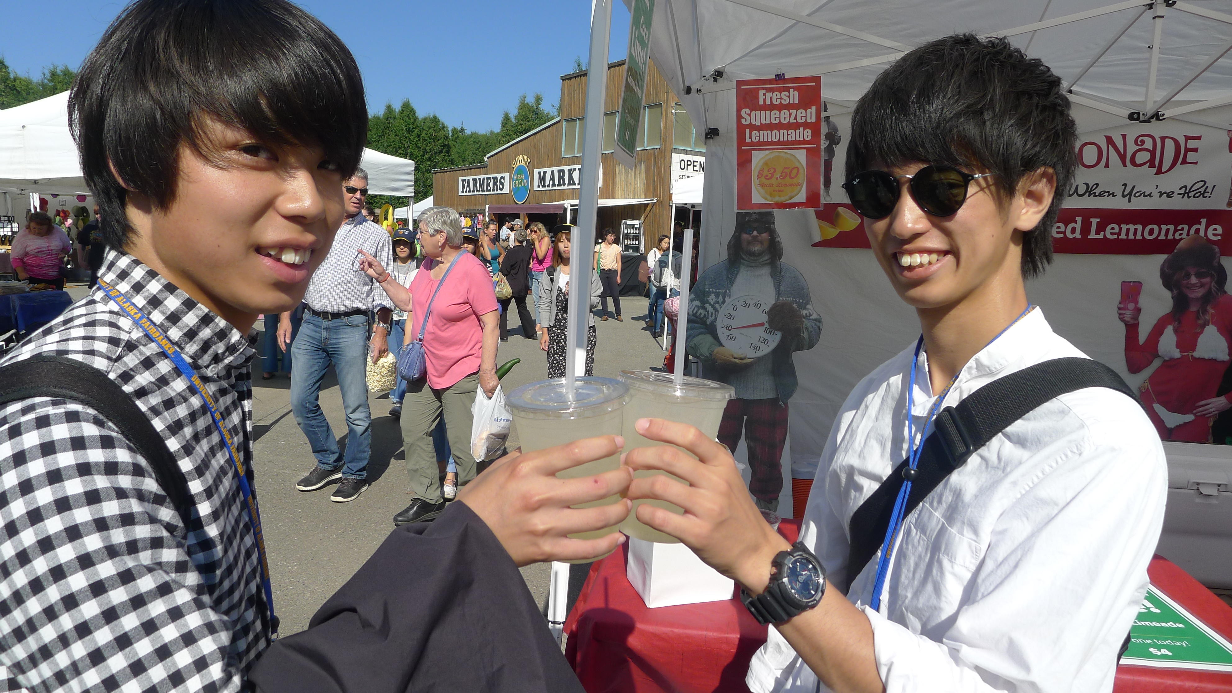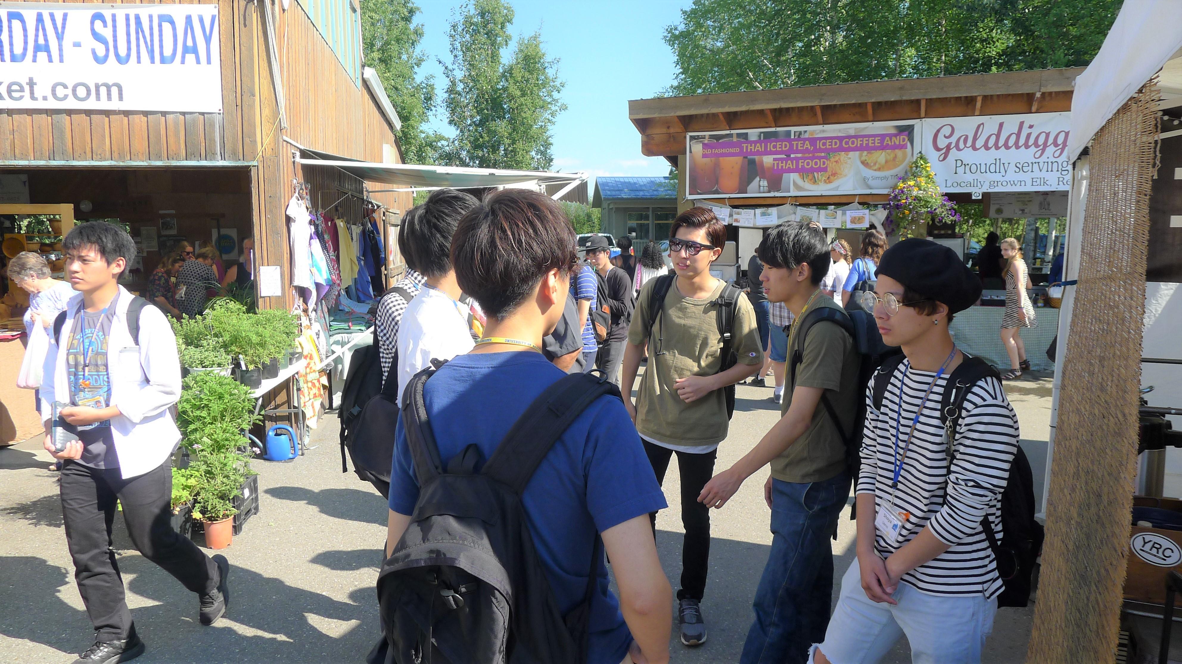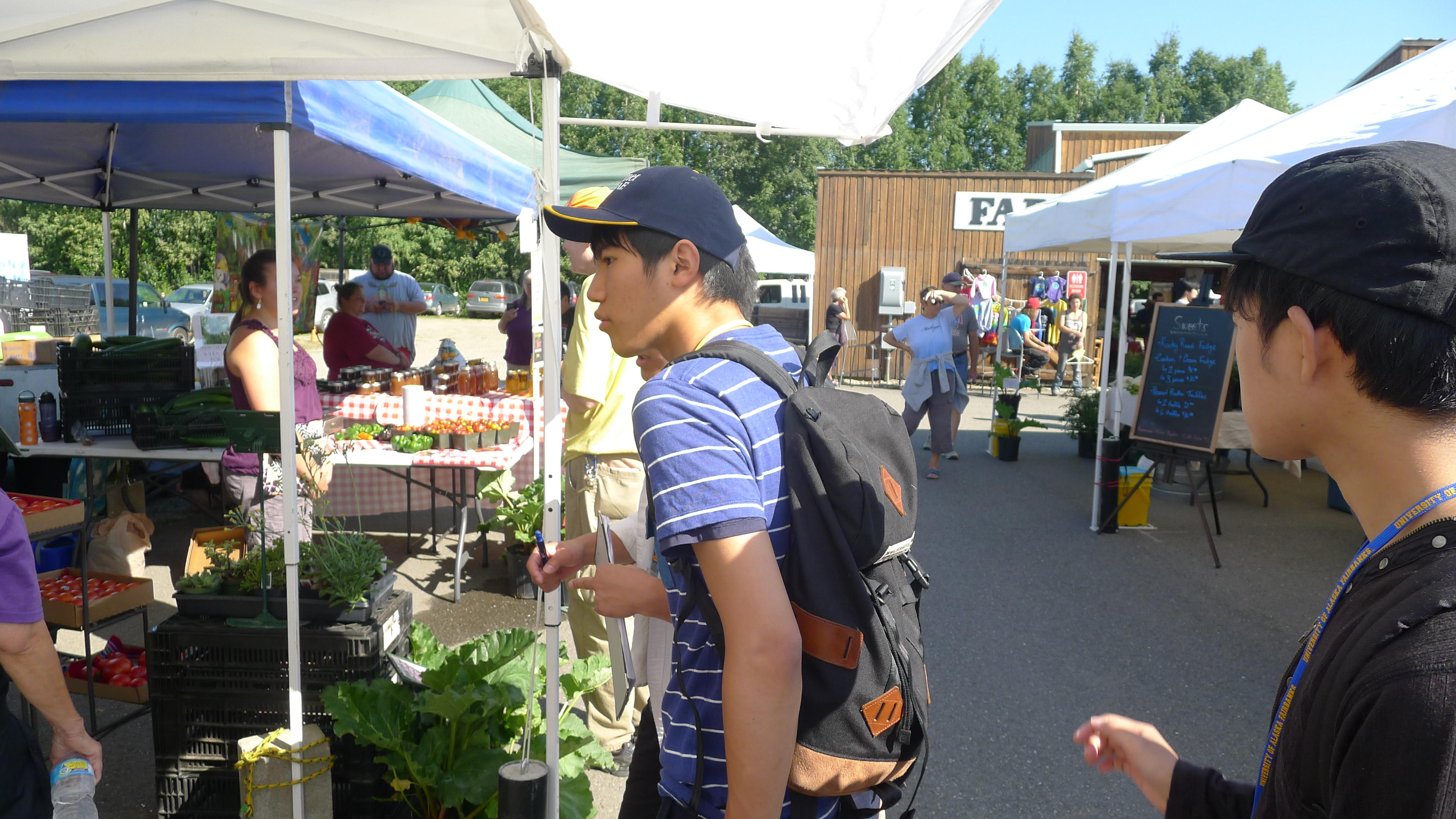 アラスカ大学の看板の前で記念撮影した後、ファーマーズマーケットまで徒歩で移動します。ファーマーズマーケットには、様々な出店があります。学生たちは先生から出された課題を片手に、気になったお店をのぞいて、積極的にお店の人に声をかけていました。