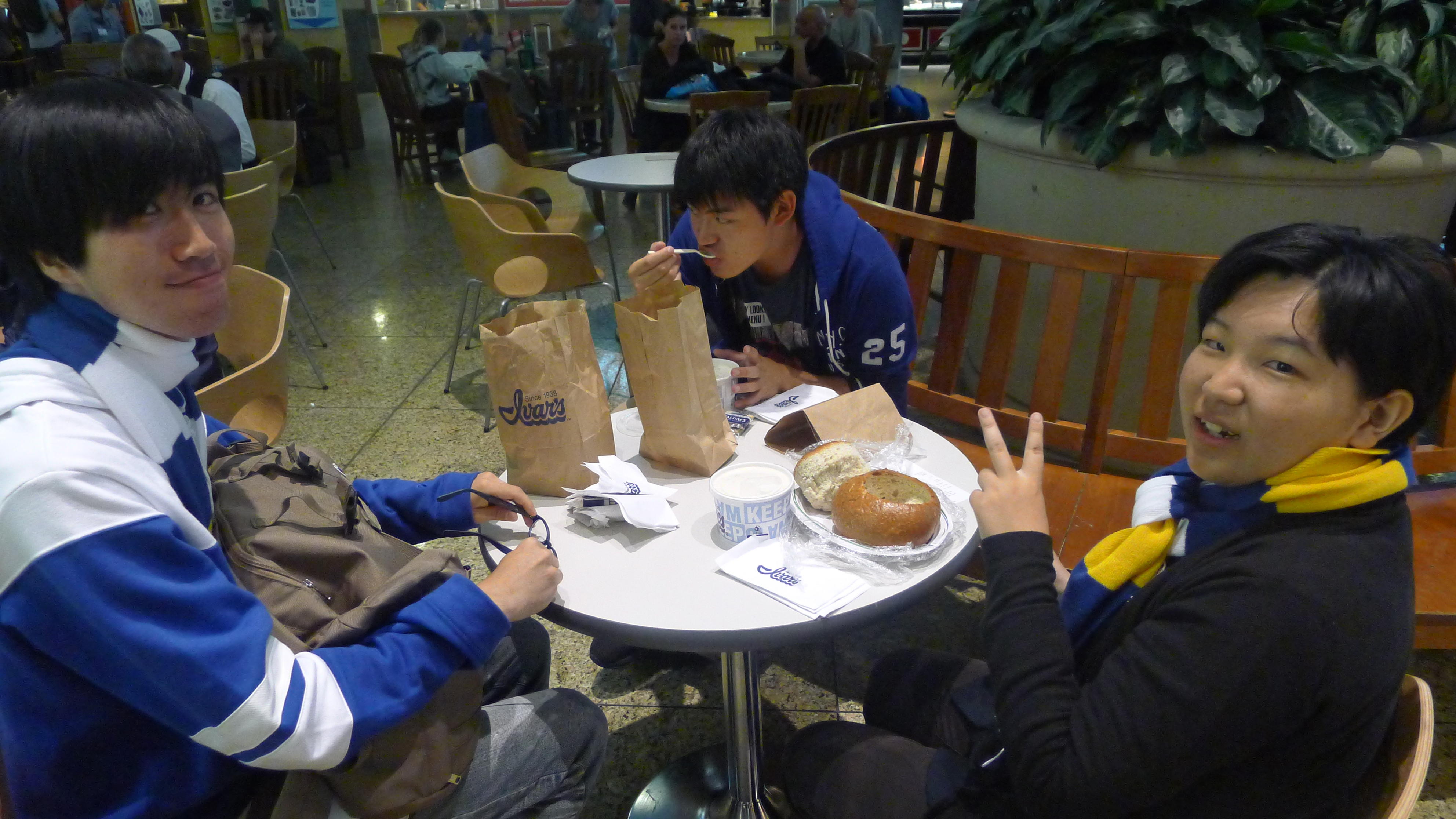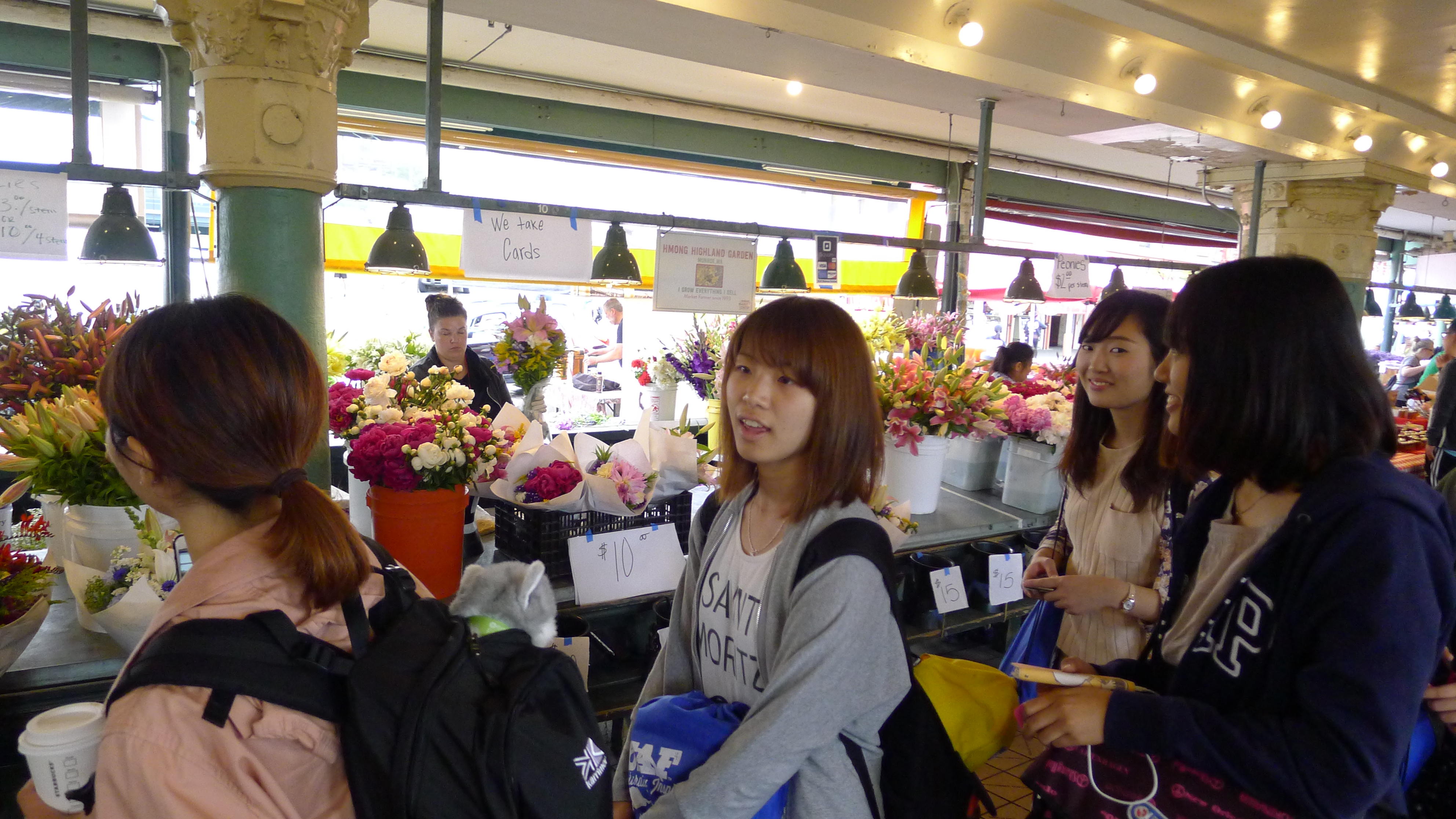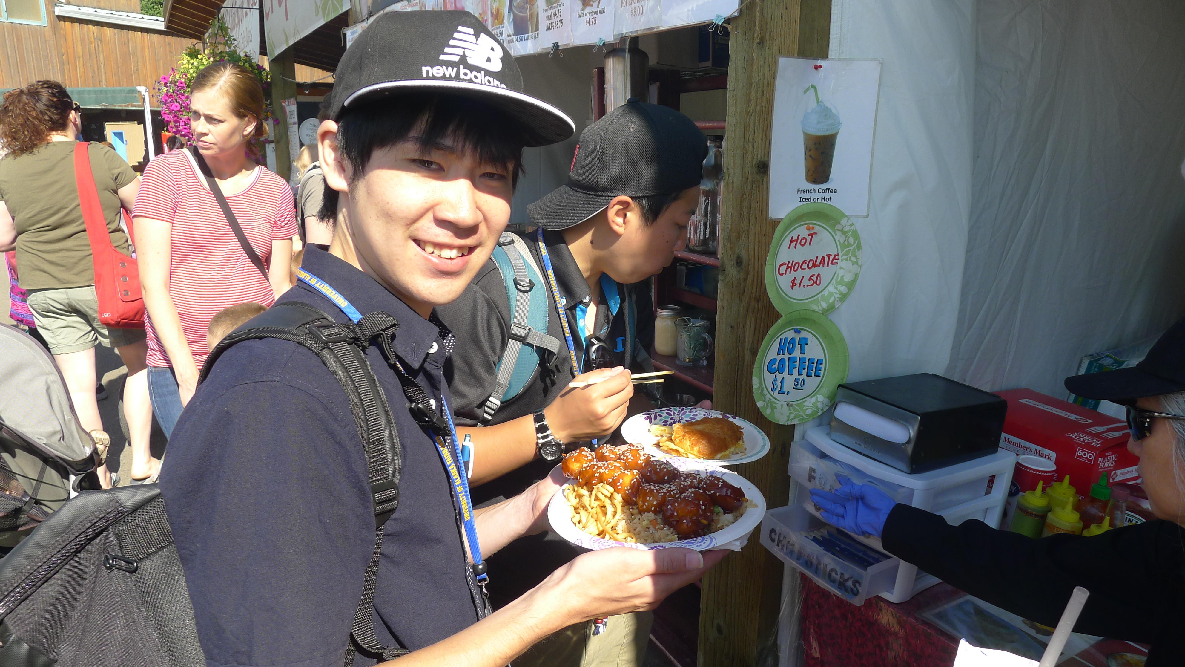 その後、出店で好きな食べ物を買って、マーケット内にあるベンチで昼食です。アメリカならではの料理以外に、タイ料理や東南アジア系の料理があり、学生たちはメニューを覗き込んでは、思い思いの昼食を選んでいました。