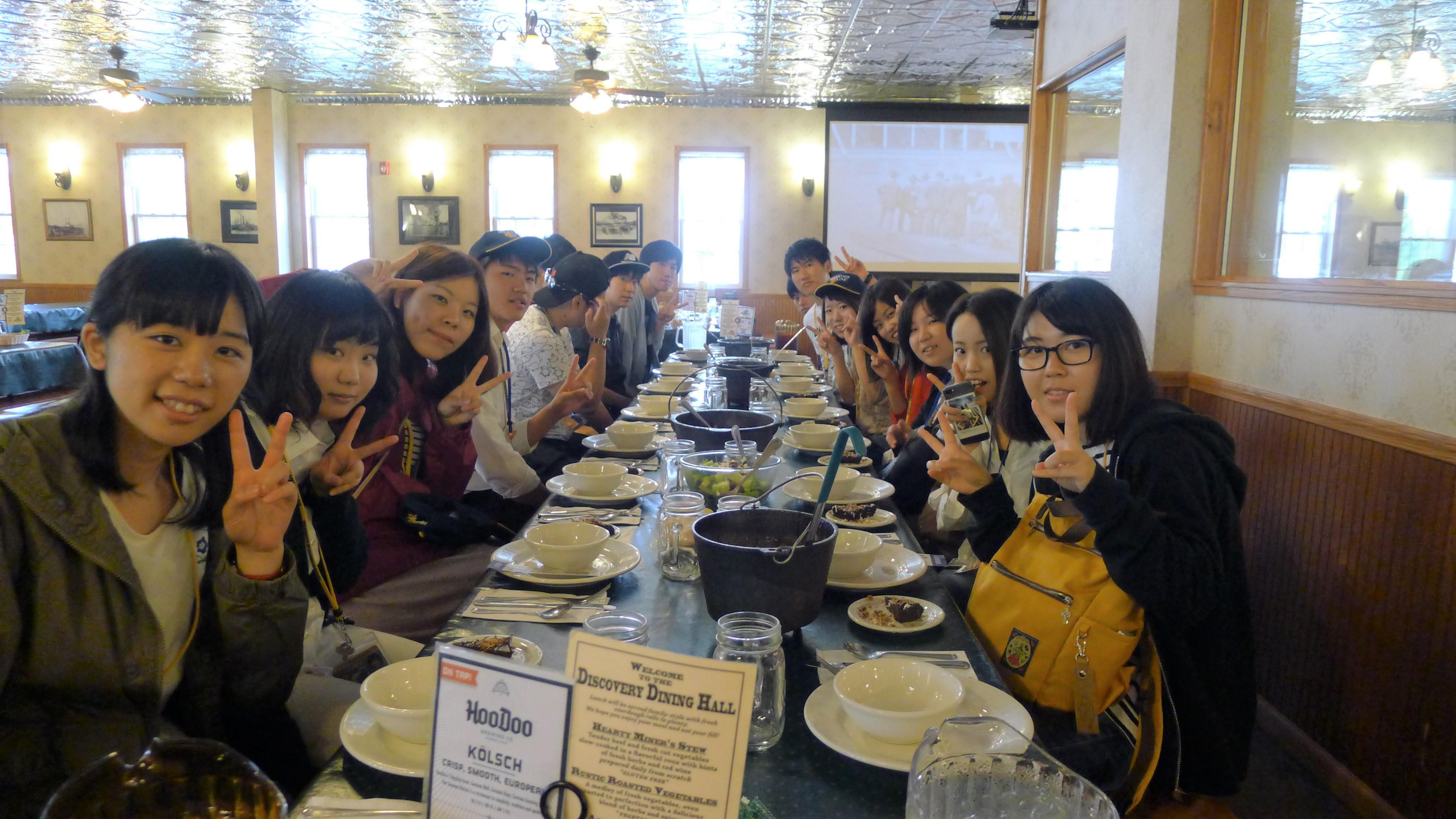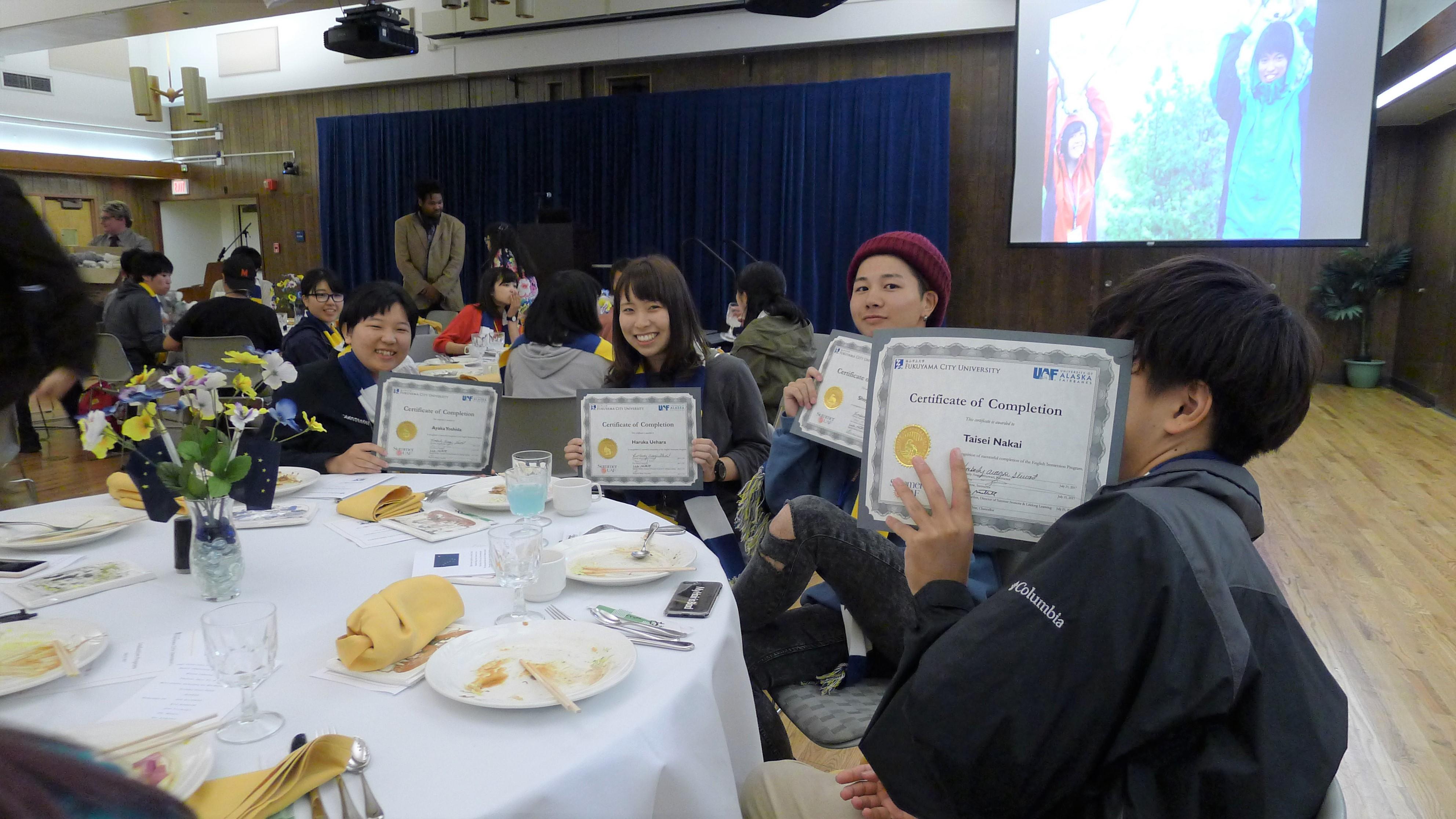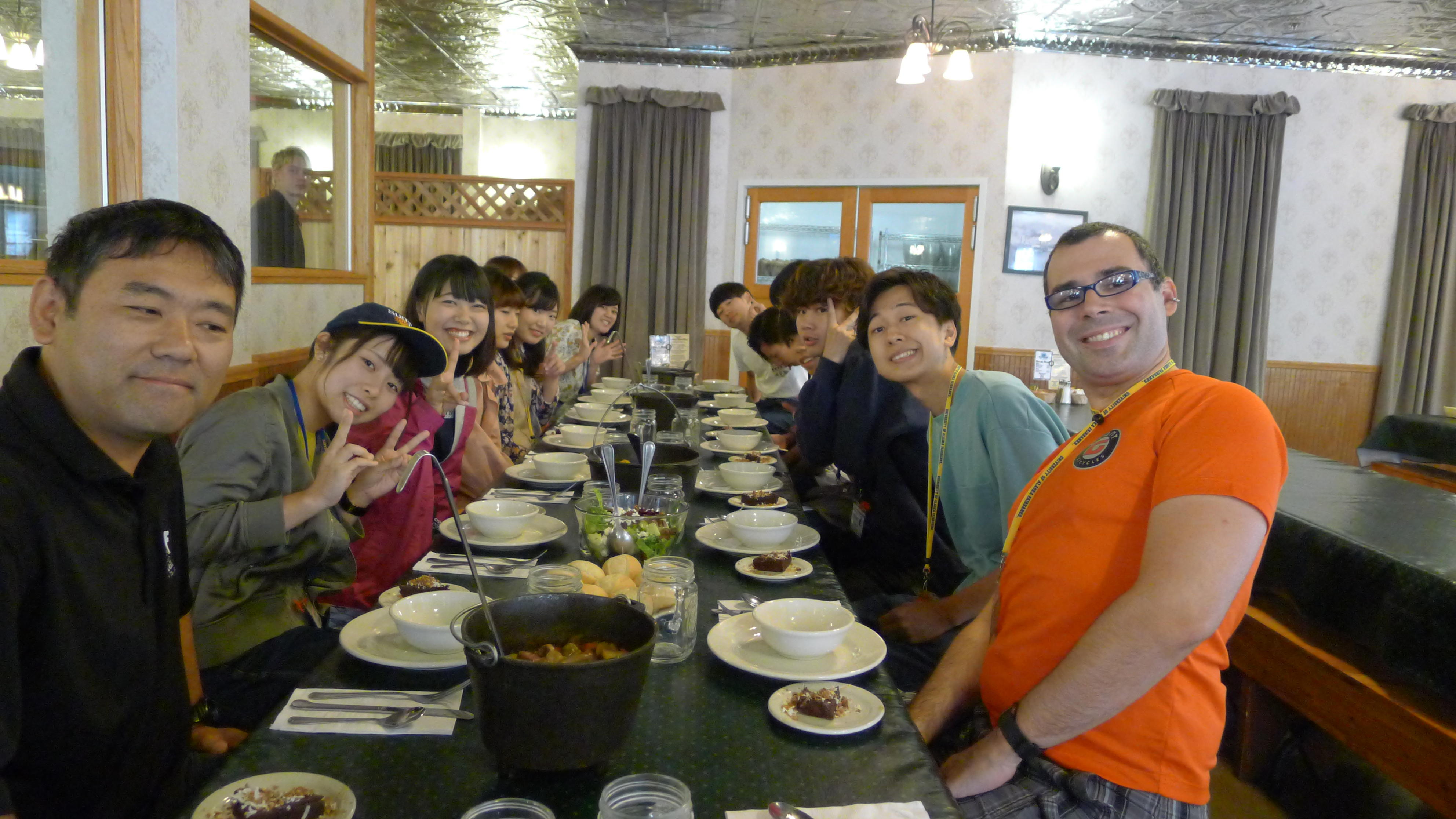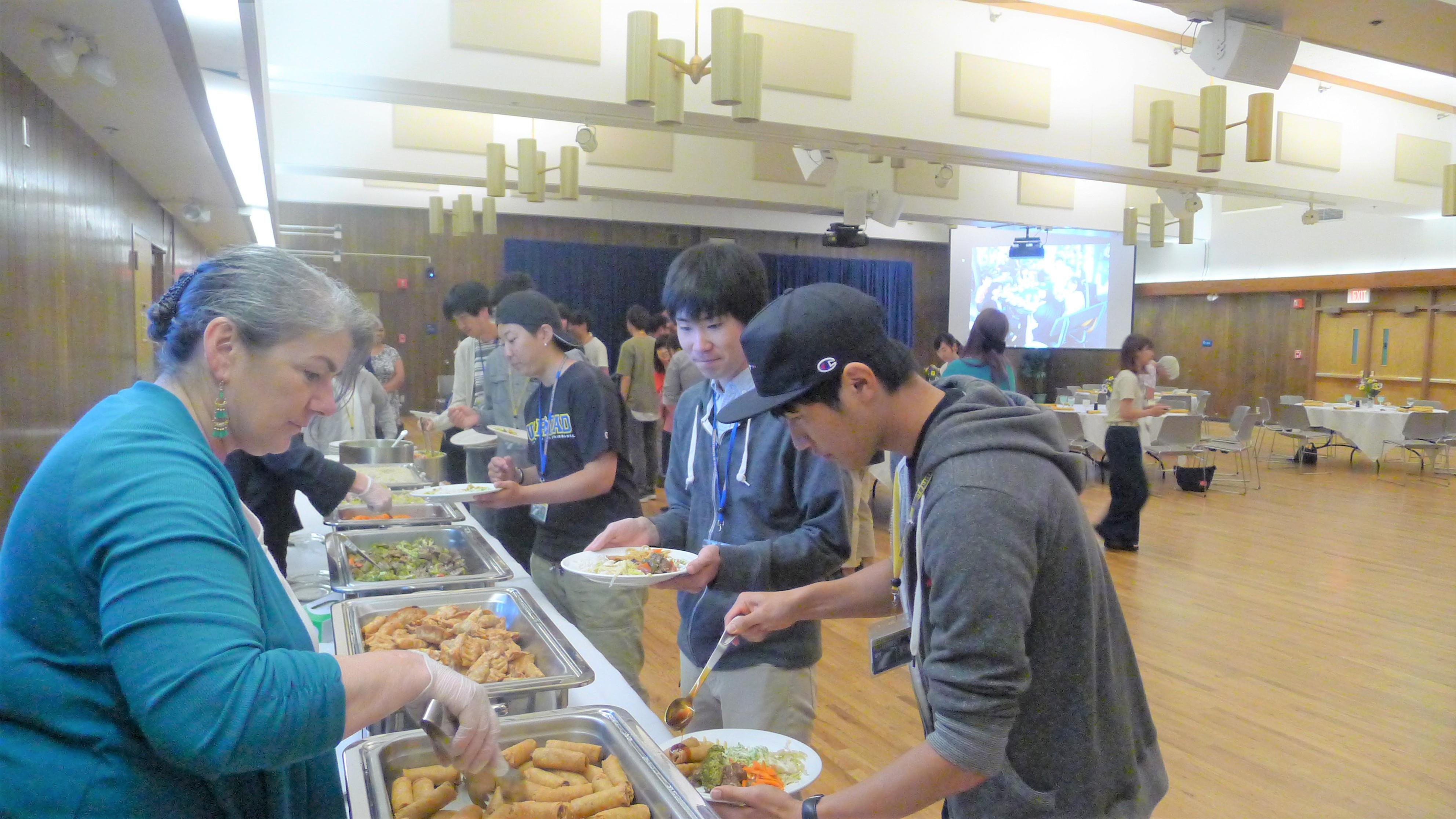 アラスカ大学サマーセッションの責任者・ミッシェルさんのスピーチから始まります。その後、学生代表の圓谷純加さんのスピーチがあり、アラスカ州歌「Alaska's Flag」と日本国歌「君が代」を斉唱しました。そして、いよいよ夕食の時間です。
