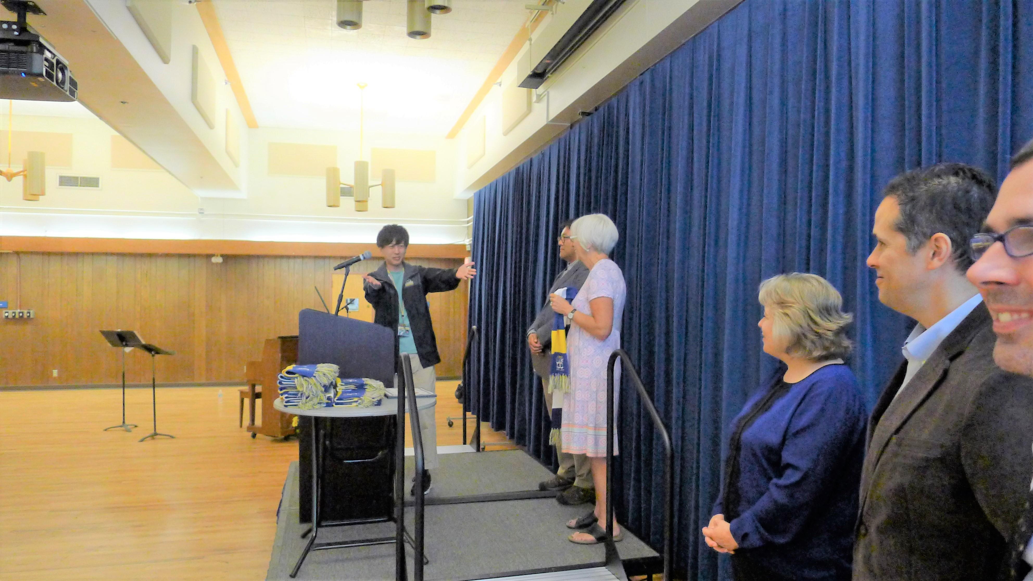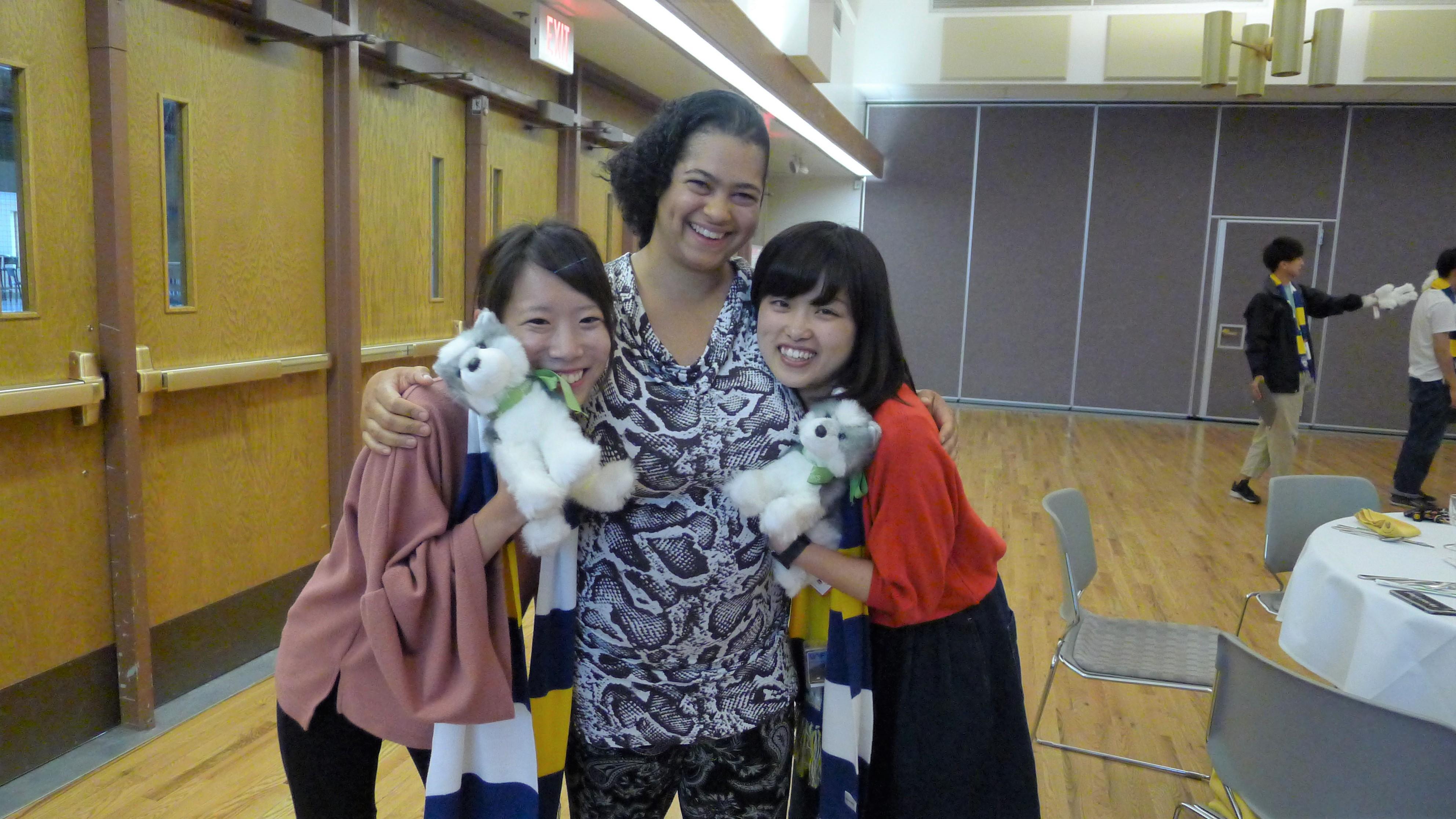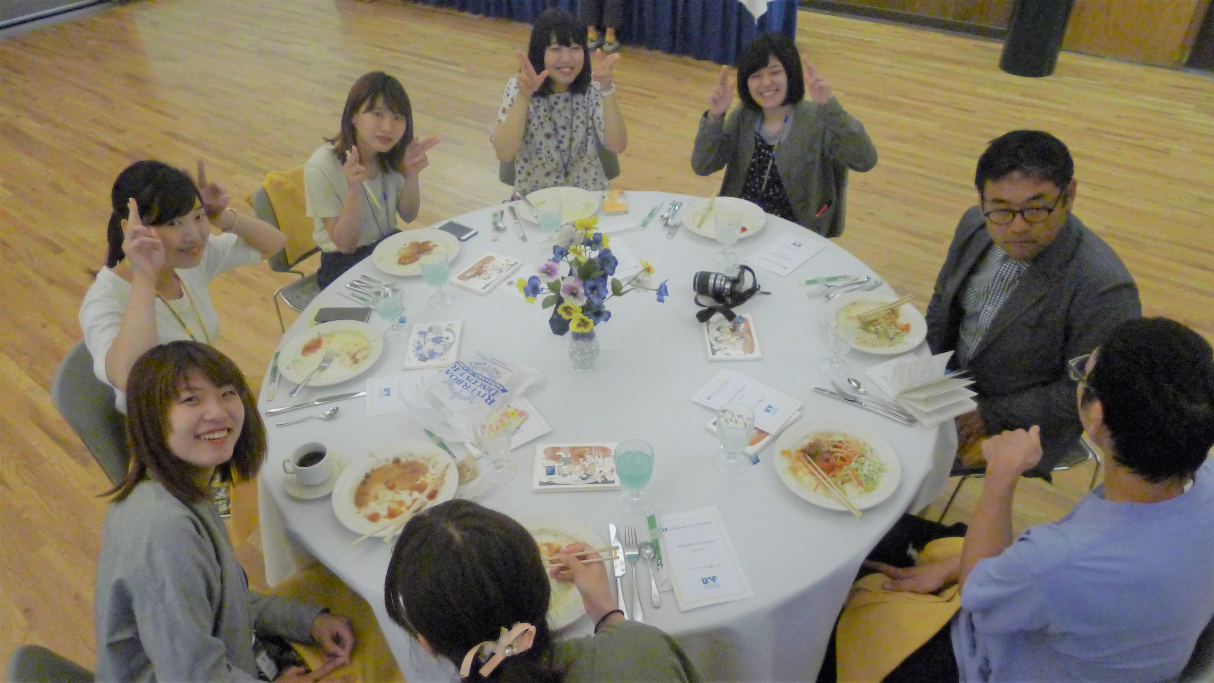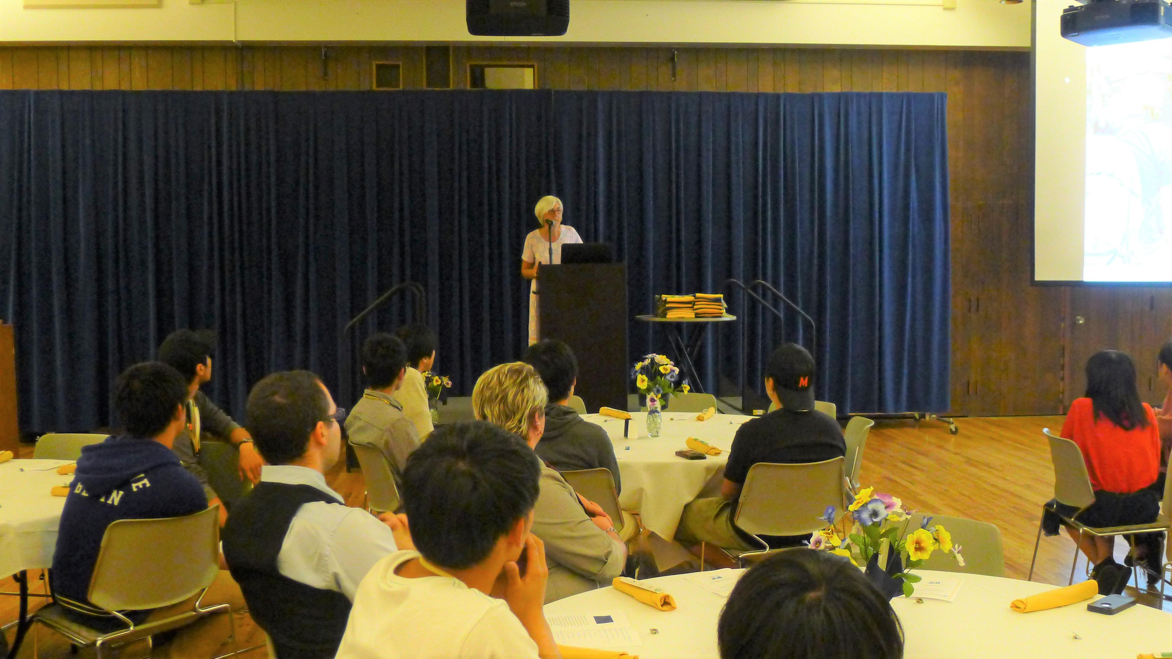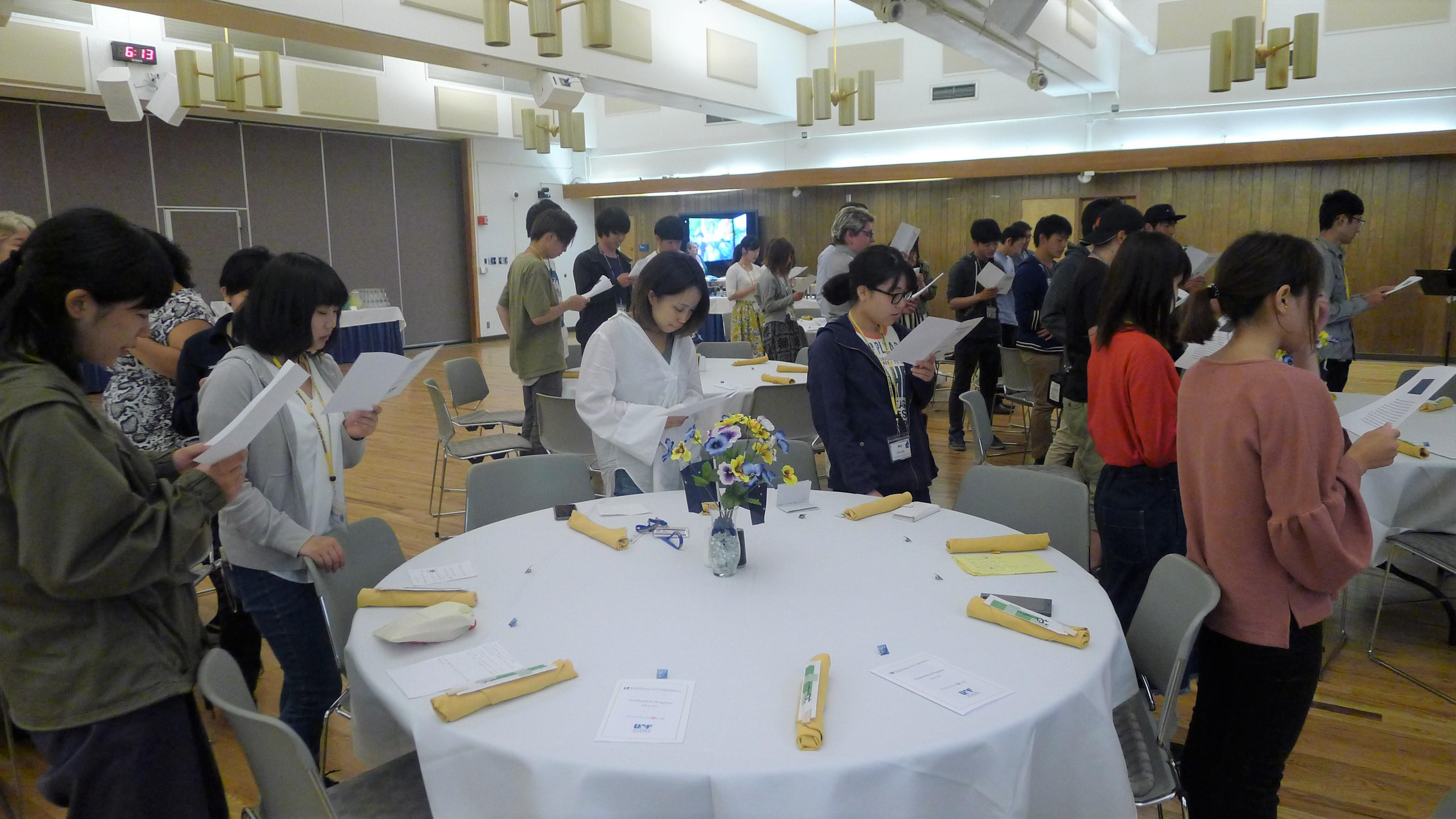 アラスカ大学サマーセッションの責任者・ミッシェルさんのスピーチから始まります。その後、学生代表の圓谷純加さんのスピーチがあり、アラスカ州歌「Alaska's Flag」と日本国歌「君が代」を斉唱しました。そして、いよいよ夕食の時間です。