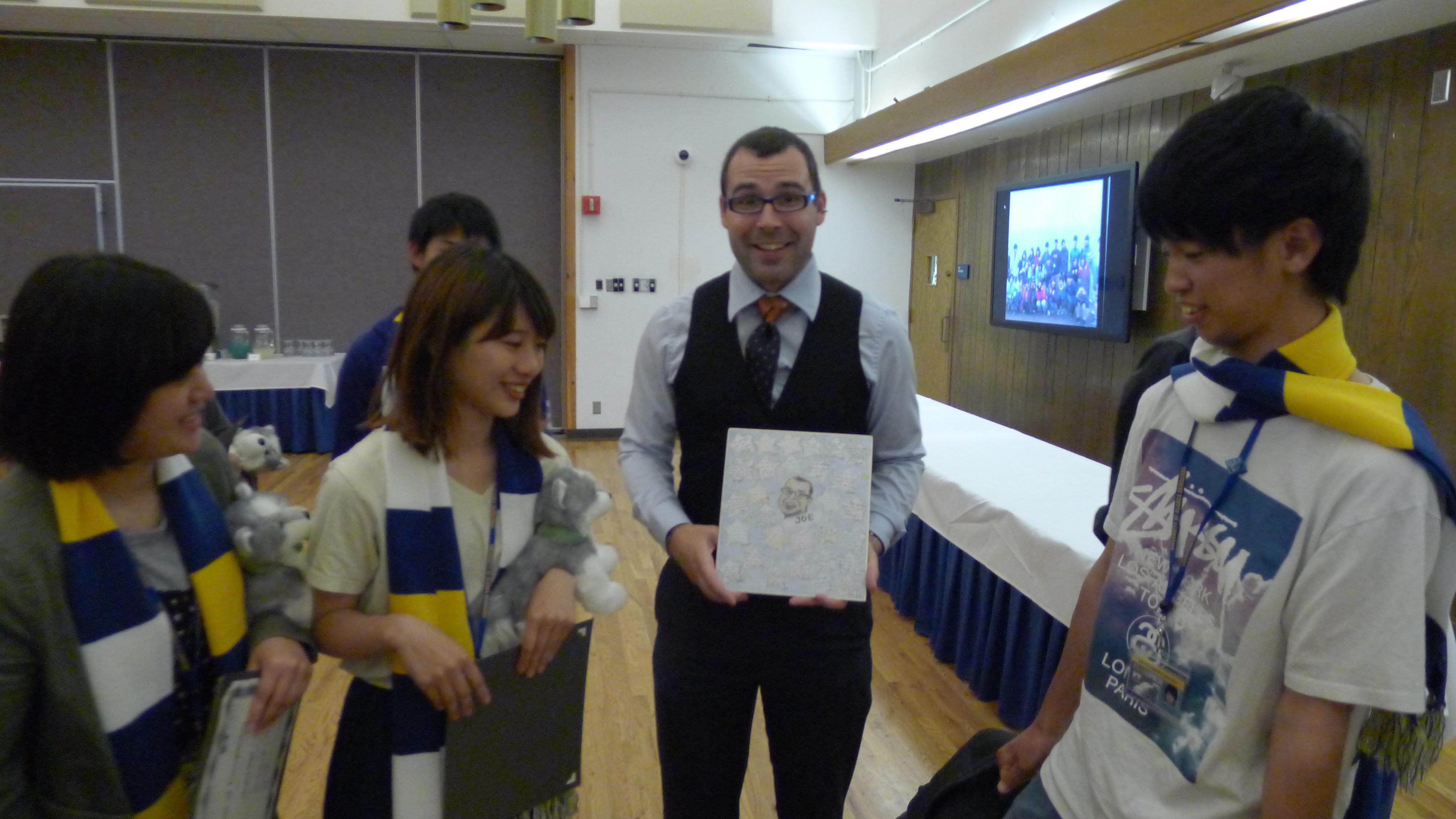 Kim先生のクラスとDan先生のクラスで集合写真をとりました。また、お世話になった先生方にイラスト付きの色紙をプレゼント。先生方もよろこんでいただき、最後まで名残惜しく歓談し続けました。