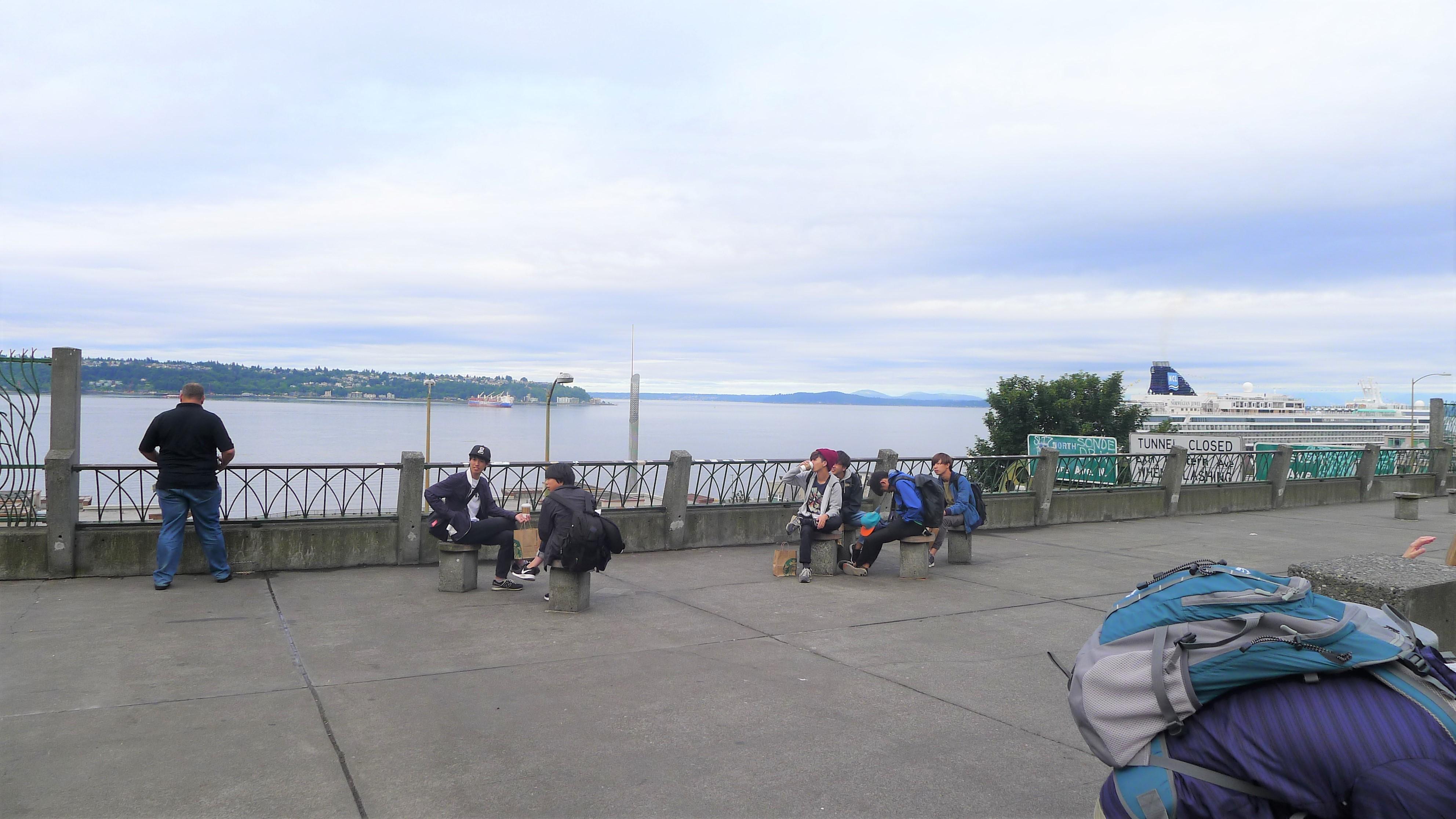 アラスカ大学からダウンタウン中心部のTransit Centerまで循環バスで移動します。アラスカ大学からもらったPolar Expressカードで、実習中はバスを無料で利用できます。Transit Centerでは、Kim先生とDan先生が待っていました。2人からの課題は「3ヶ所でそれぞれ異なる質問をして、相手の回答を記録すること」。学生たちは2人1組で街に散らばっていきました。