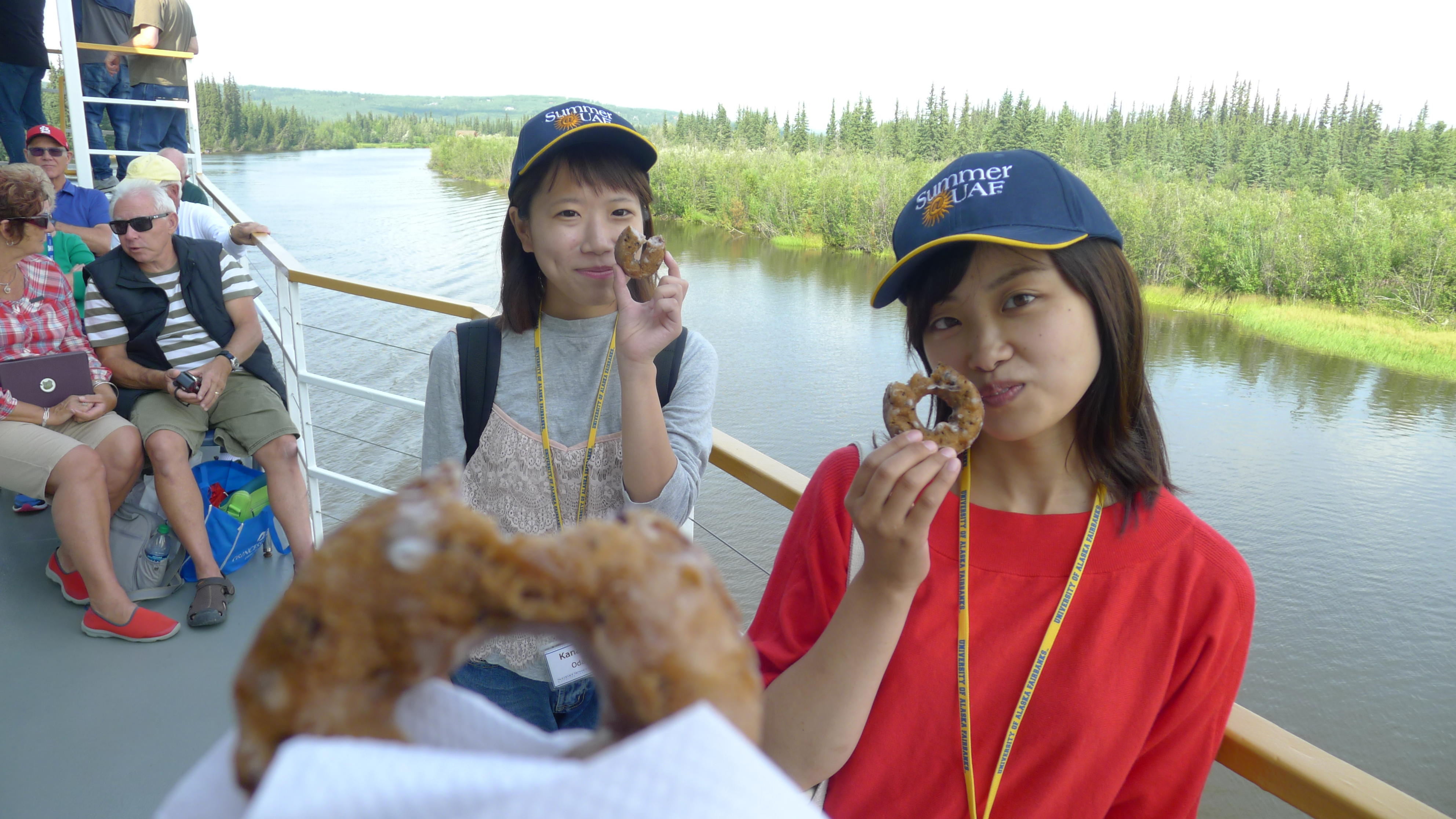 川辺に建てられた豪邸を眺めるだけでなく、水上飛行機の離水・着水のデモンストレーションや犬ぞりの訓練など、様々なイベントが用意されています。また、船内ではドーナッツなどが無料でもらえるサービスがあり、学生たちもほおばりながら、ゆったりとした船旅を楽しんでいました。