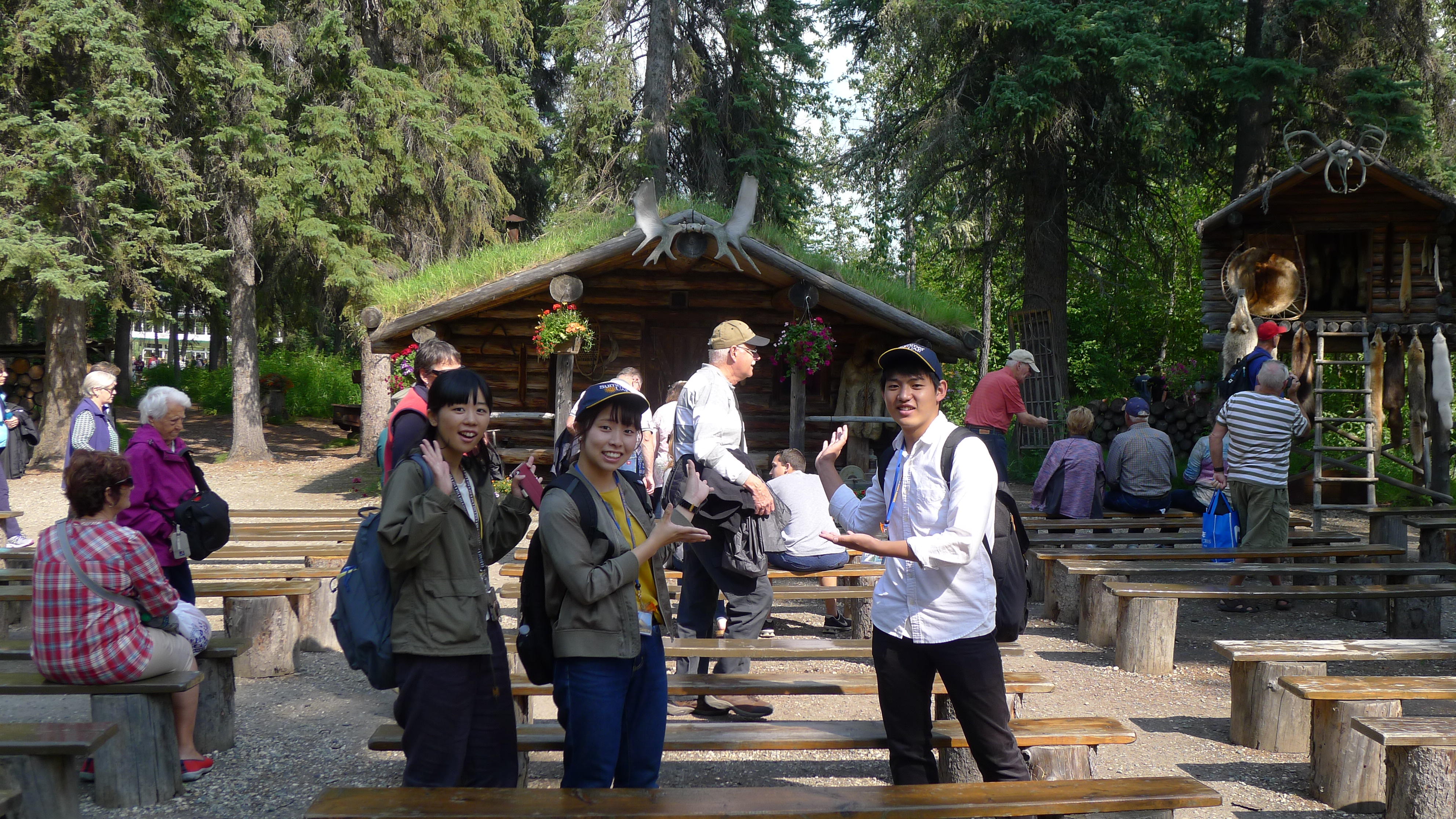 遊覧船の折り返し地点にあたるChena Indian Villageで上陸。周囲を散策しながら、アラスカ先住民についての解説を聞き、彼らの生活様式や文化を学びました。