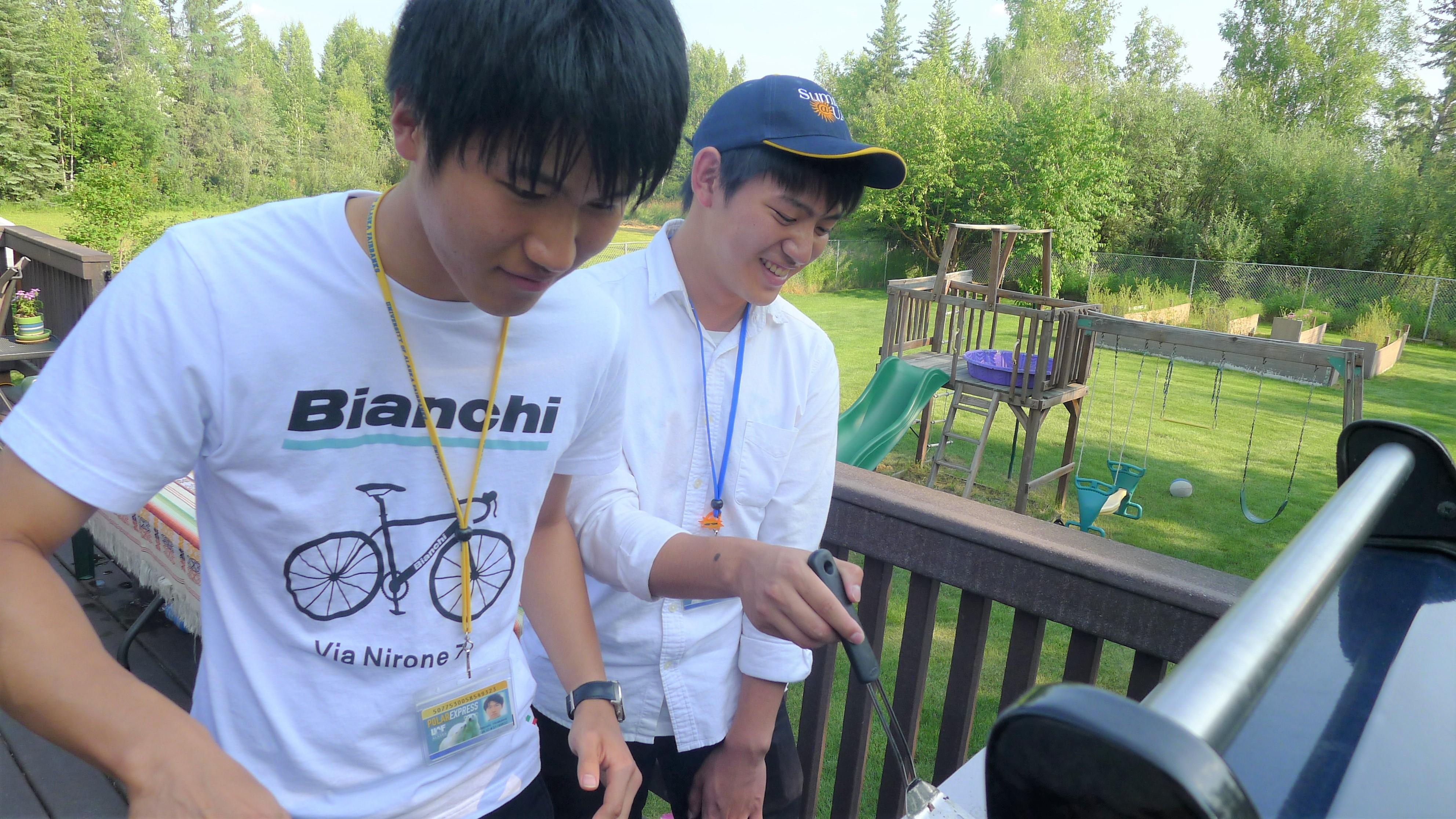 遊覧船のツアーが終わった後は、英会話の授業を担当していただいているKim先生のご招待を受けて、先生のご自宅でバーベキューをごちそうになりました。学生たちも料理にチャレンジ。Dan先生の指導のもと、ハンバーガーやソーセージを焼いていきます。