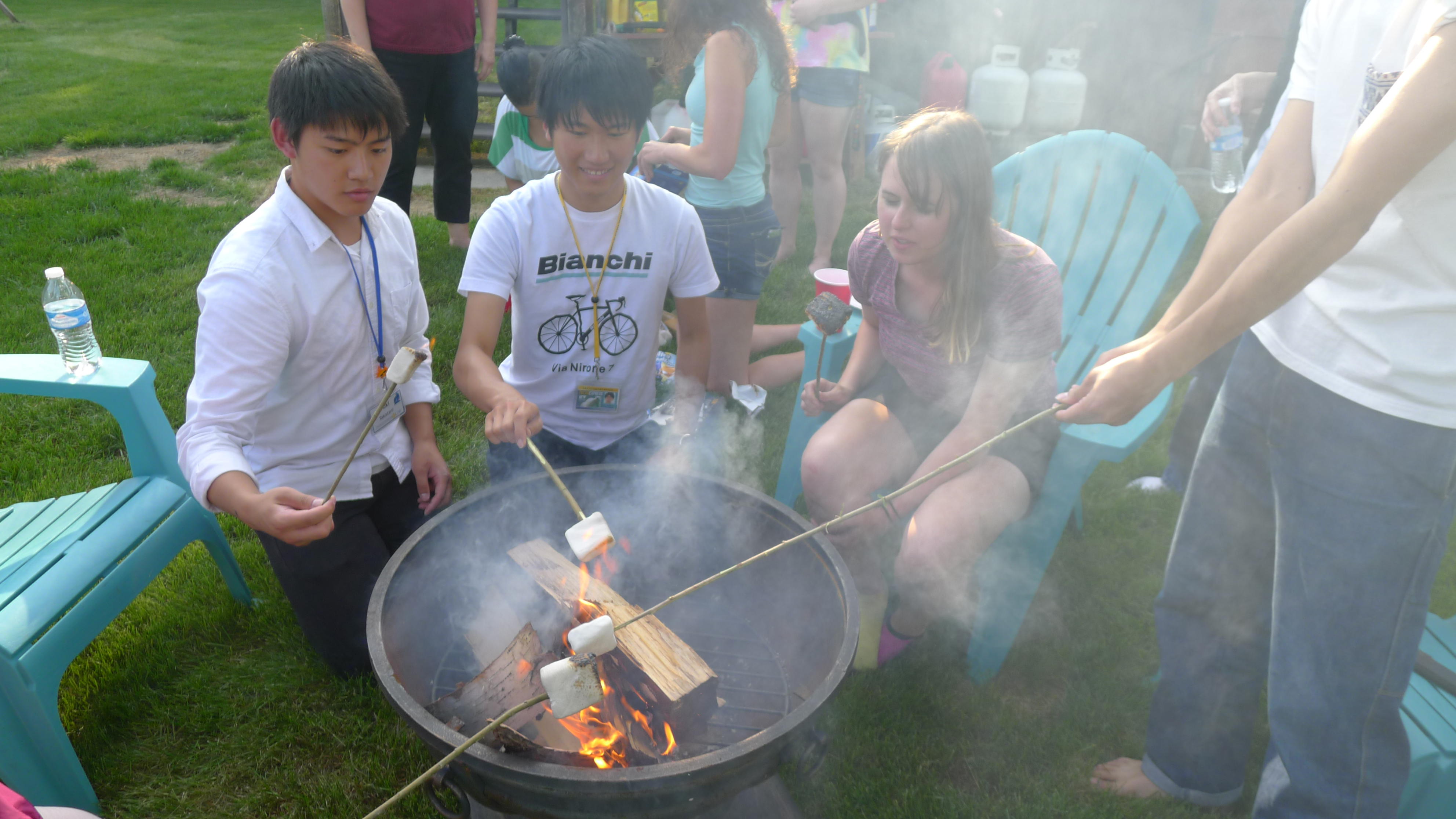 学生たちは広い庭の芝生の上に腰を下ろして、ハンバーガーやKim先生の料理をいただきました。デザートは焼きマシュマロ。マシュマロを刺す棒を傍の森から調達する、というワイルドな体験もでき、アメリカ生活を堪能することができました。食後は、Kim先生の愛犬とたわむれたり、広い庭で遊んだりして、楽しい時間を過ごしました。(M)